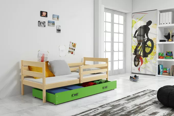 Dětská postel ERYK 90x200 cm se šuplíkem, s matrací, Přírodní/Zelená