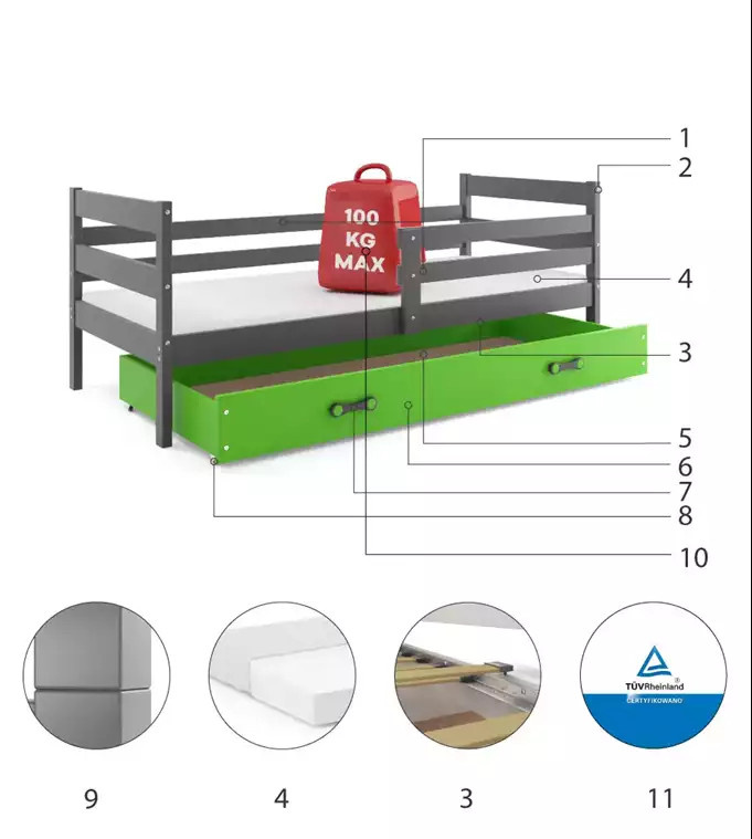 Dětská postel ERYK 90x200 cm se šuplíkem, s matrací, Grafit/Zelená