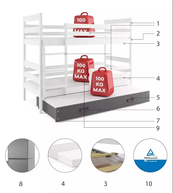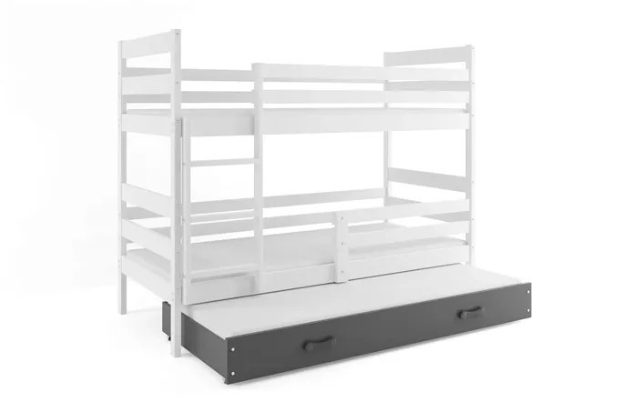 Dětská patrová postel ERYK 3 s přistýlkou 90x200 cm, bez matrace, Bílá/Grafit