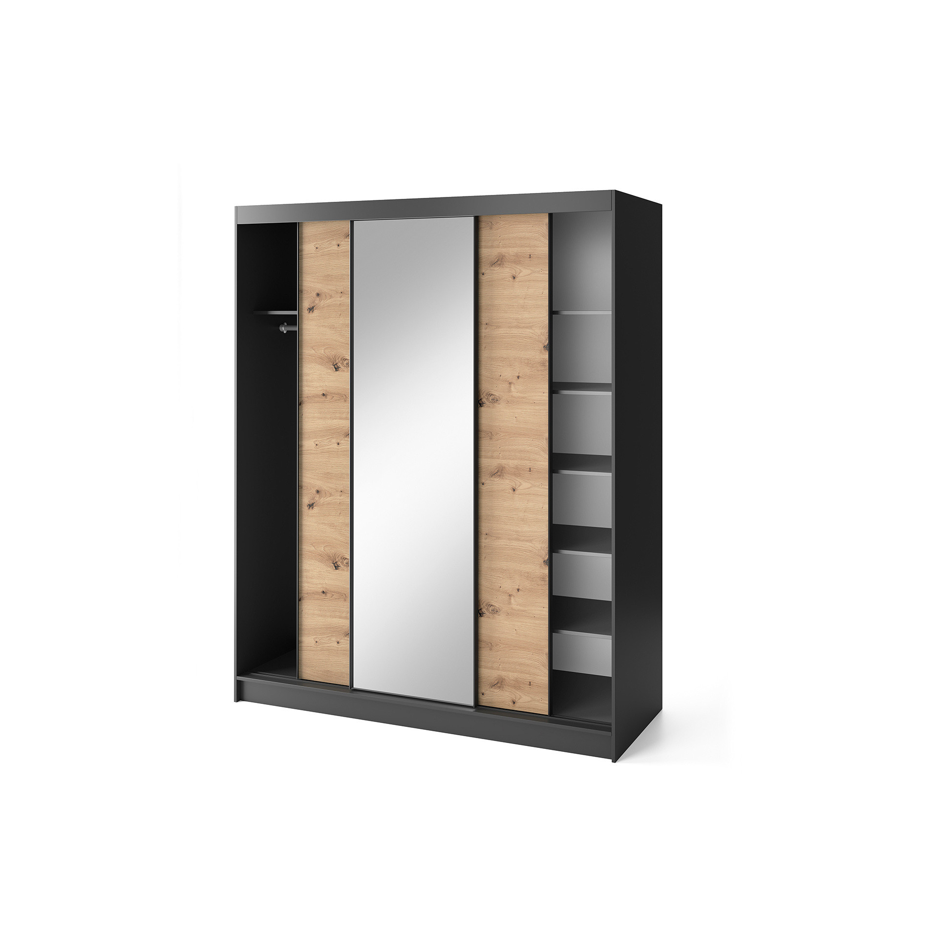 Šatní skříň Esville s posuvnými dveřmi a zrcadlem, s hloubkou 60 cm, šířkou 180 cm a výškou 220 cm, dostupná v barvě dub artisan/matná černá, je praktickým a elegantním řešením pro úložný prostor. Jeho pevná konstrukce a pečlivé zpracování z něj činí ideální doplněk do vašeho interiéru. Šatní skříň je navržena s ohledem na optimální využití prostoru. Jeho interiér obsahuje 6 polic, z nichž každá unese zátěž až 10 kg, což umožňuje uspořádané uložení různých předmětů. Navíc přiložené tyče umožňují zavěšení oblečení, což dále usnadňuje organizaci. Vyrobená z 16 mm silné MDF desky, skříň nabízí pevnou konstrukci, přičemž ABS hrany ji chrání před poškozením a dodávají eleganci celkovému vzhledu. Nula.5 cm vysoké nohy, vyrobené z odolného syntetického materiálu s černou povrchovou úpravou, zajišťují stabilní umístění a snadnou manévrovatelnost. Šatní skříň Esville se zrcadlem nabízí tři posuvné dveře, které umožňují pohodlné otevírání a zavírání bez zabírání dalšího prostoru v místnosti. Tento design je také ideální volbou pro menší prostory. Barevné schéma šatníku v tónech řemeslného dubu a matné černé mu dodává moderní vzhled, který dobře ladí s různými styly interiéru. Stručně řečeno, šatní skříň s posuvnými dveřmi a zrcadlem Esville, s rozměry 60 cm hloubka, 180 cm šířka a 220 cm výška, je funkční a stylový prvek nábytku, který vám poskytne praktické úložné prostory a zároveň přidá eleganci, optickou lehkost a estetiku vašemu interiéru.