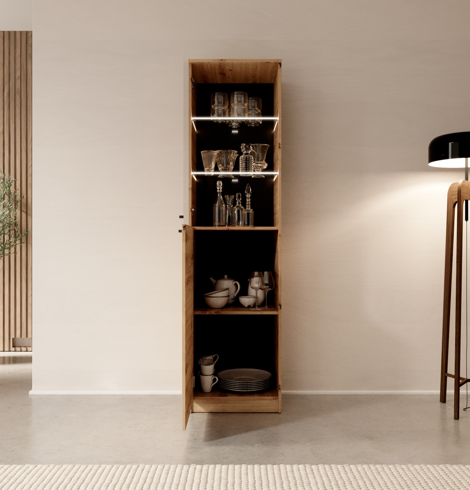 Evi II je elegantní vitrína s vysokým designem, která se vyznačuje prosklením, jež jí dodává lehkost a modernost. Jeho barva artisan dodává jemnou, ale sofistikovanou estetiku, která se ideálně hodí do mnoha různých interiérů. Tato vitrína není jen praktickým řešením pro ukládání a vystavování předmětů, ale také dekorativním prvkem, který dodává místnosti styl a eleganci. Díky její vysoké kvalitě zpracování a designovému vzhledu se Evi II dokonale hodí jak do domácnosti, tak do kancelářských nebo obchodních prostor.