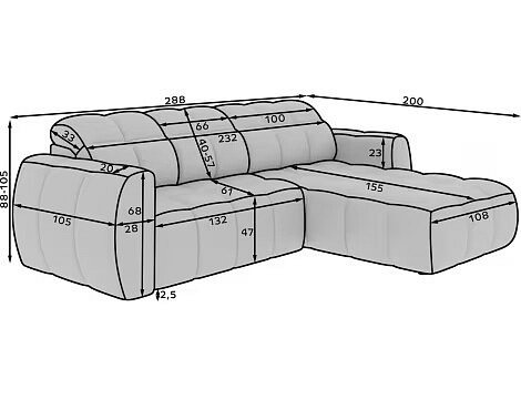 S šířkou 288 cm, hloubkou 200 cm a maximální výškou 105 cm, tato sedací souprava nabízí dostatek prostoru pro celou rodinu. Její elegantní design a kvalitní materiály zaručují, že se stane stylovým doplňkem každého interiéru.