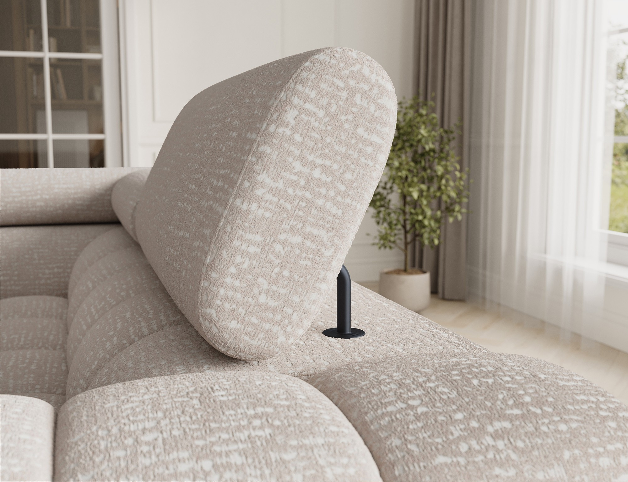 Sedací část je vyrobena z kvalitních materiálů, jako jsou pružiny Falista typu B a polyuretanová pěna T3030 a HR3030, což zajišťuje optimální pohodlí a dlouhou životnost. Opěra je z polyuretanové pěny T2130, která poskytuje měkkou, ale pevnou podporu. Polohovatelné opěrky hlavy umožňují přizpůsobit si sedací soupravu přesně podle vašich potřeb.
