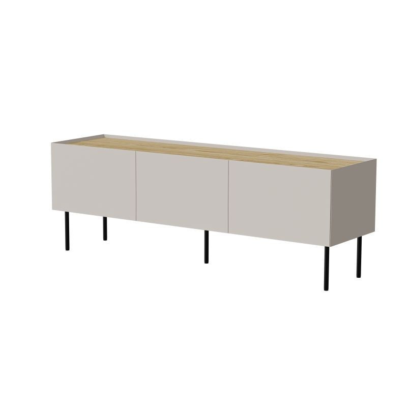 FELLINI TV skříňka 150 kašmír/kašmír rozměry: V/Š/H - 52cm/150cm/40cm materiál: boky: lakovaná MDF deska 16 mm čela: lakovaná MDF deska 16 mm horní a dolní deska: dřevotříska 16 mm barva: imitace olejovaného dubu nožky: kovové, černé, výška 20 cm Úchyty: žádné, čela přesahují přes desku