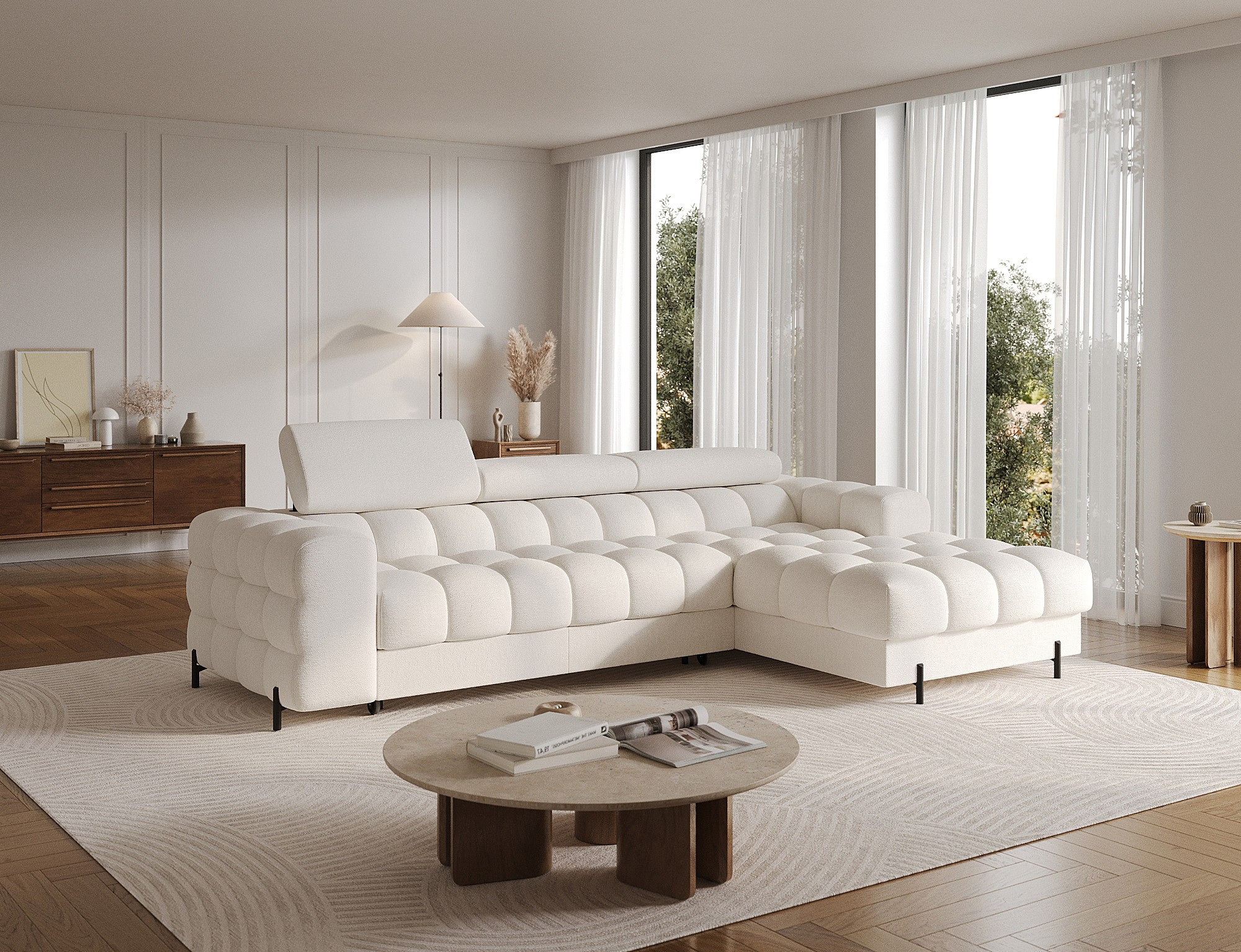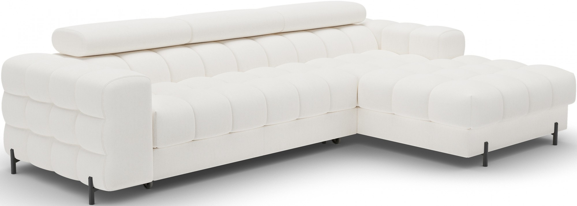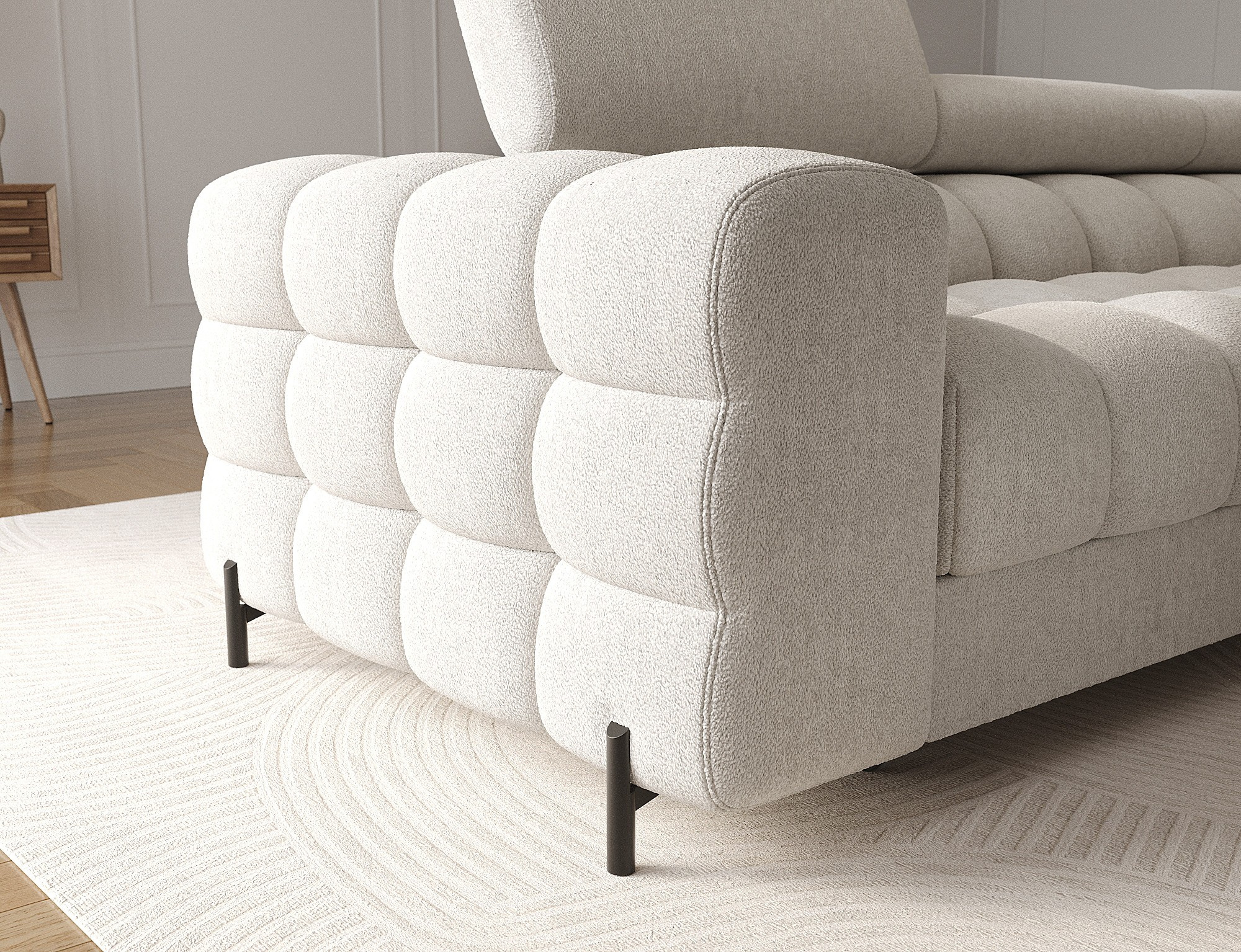 Rohová pohovka Felro je kombinací moderního designu, pohodlí a funkčnosti. Sedák pohovky je vyplněn vlnovými pružinami typu B a vysoce kvalitní pěnou T3030 a HR3030, což zajišťuje výjimečné pohodlí pro každodenní použití a relaxaci. To činí nábytek nejen měkkým a flexibilním, ale také odolným vůči deformaci, což zaručuje dlouhotrvající trvanlivost.Robustní konstrukce je podepřena kovovými nohami, které jsou opatřeny černým práškovým nástřikem, což celkovému designu dodává elegantní a moderní nádech. Felro má také funkci spaní, což z něj činí ideální volbu pro obývací pokoj, kde záleží jak na stylu, tak na praktičnosti. Mechanismus rozkládání "Dolphin" umožňuje snadnou a rychlou přeměnu pohovky na pohodlné lůžko.Další výhodou je čalouněné opěradlo, které zajišťuje, že pohovka vypadá skvěle z každého úhlu a může být umístěna buď proti zdi, nebo uprostřed místnosti. Celý design se nese v moderním stylu, díky čemuž je Felro ideální pro současné interiéry, přičemž přidává jak eleganci, tak funkčnost.