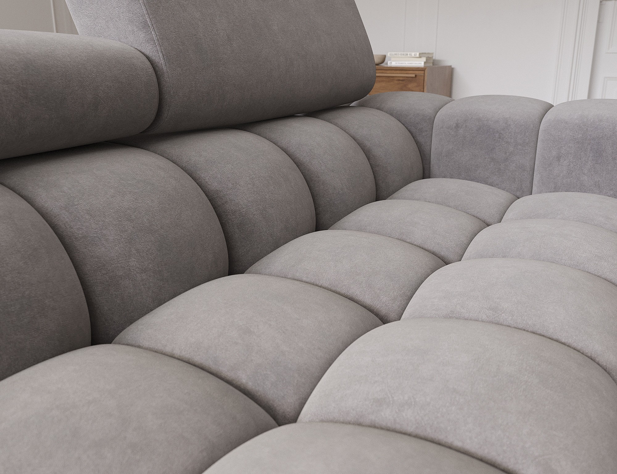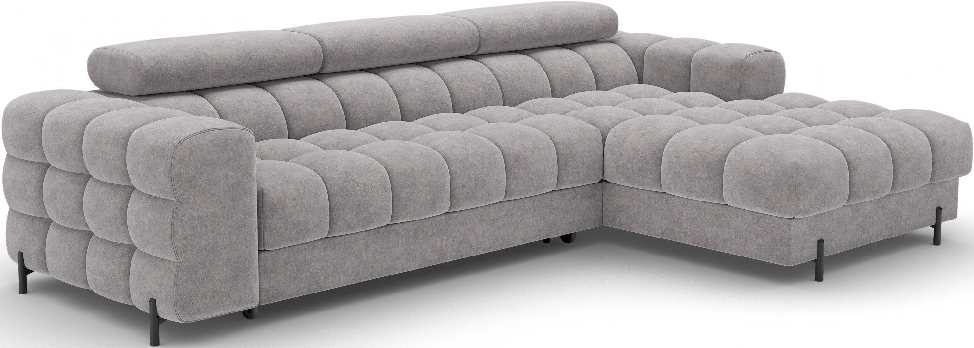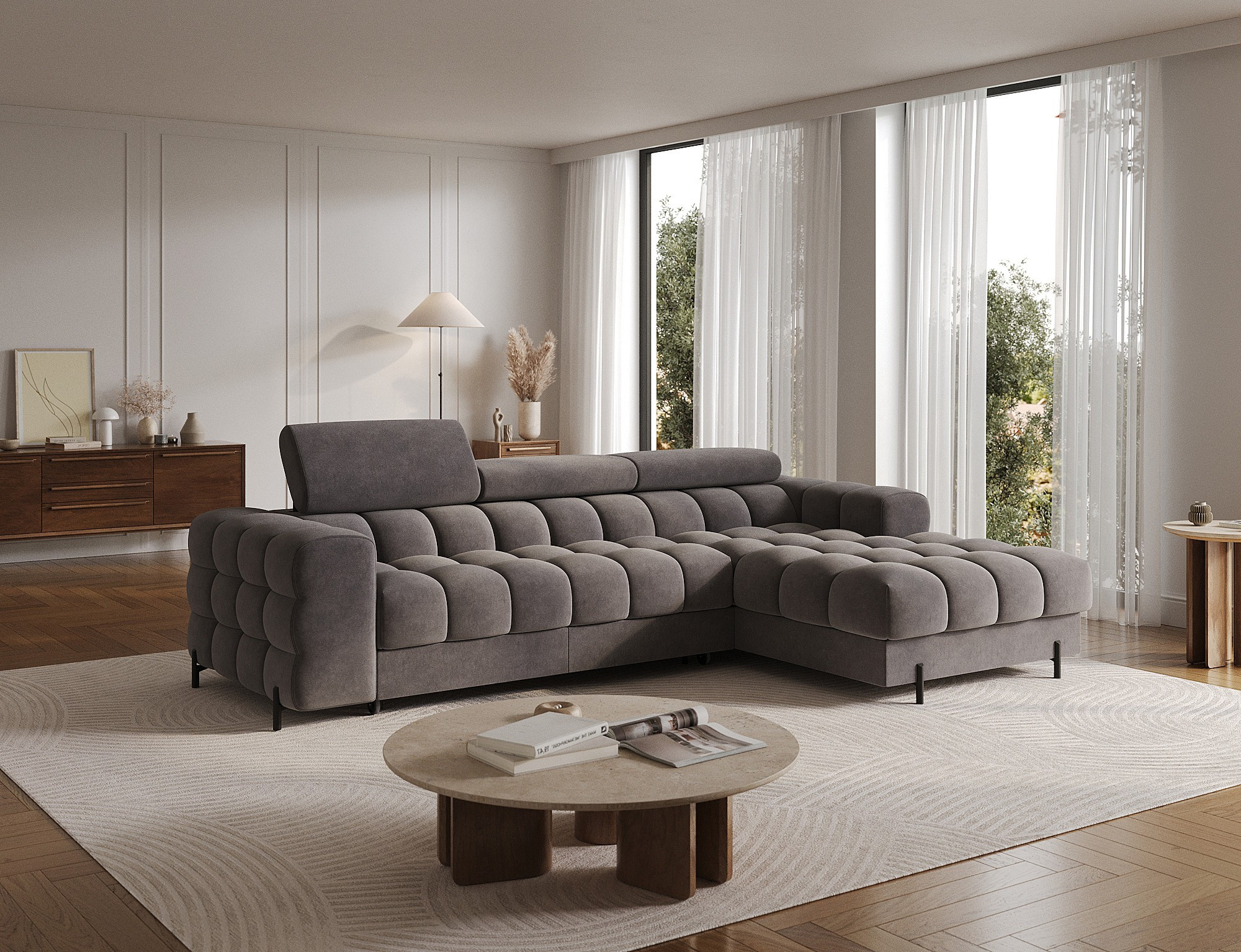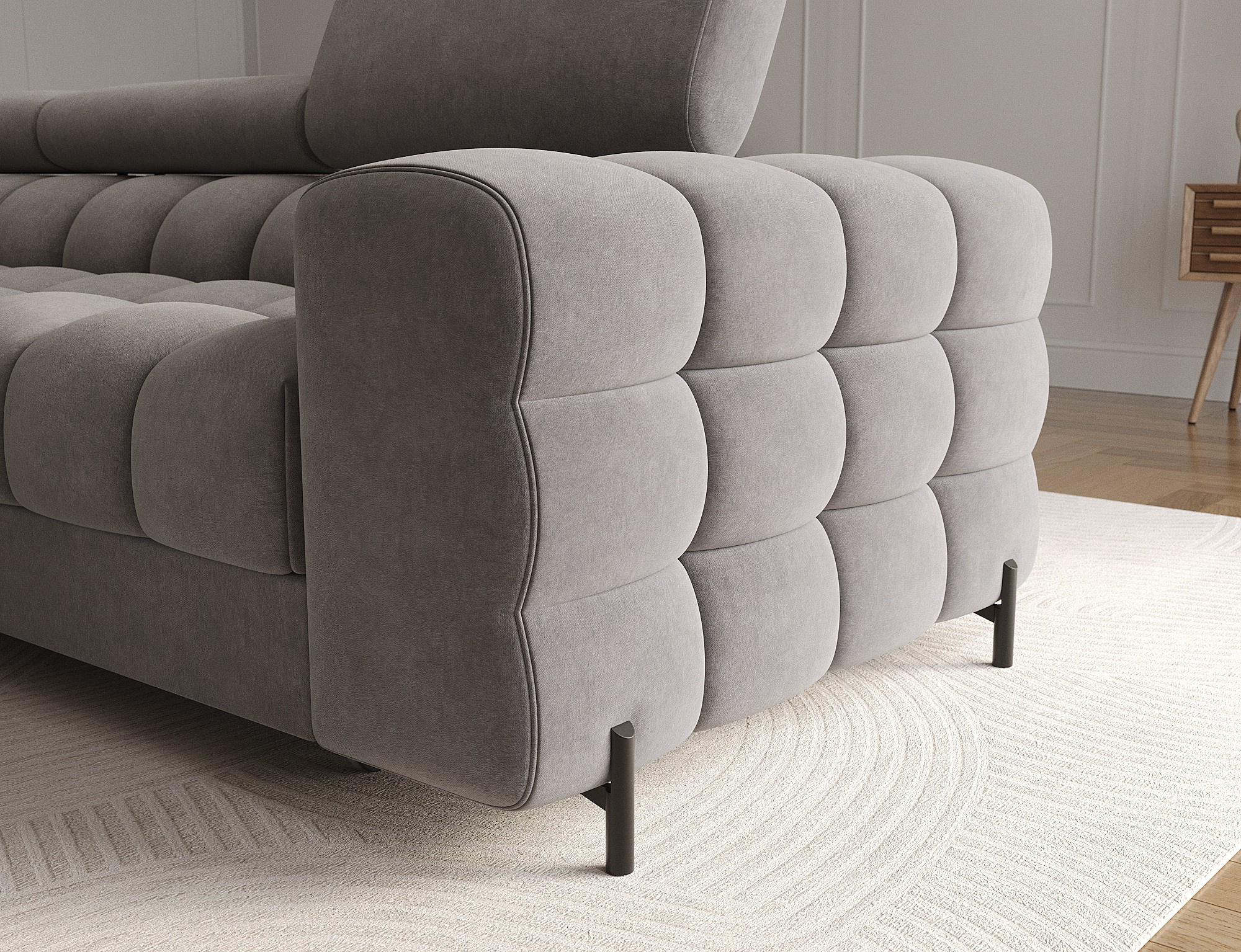 Rohová pohovka Felro je kombinací moderního designu, pohodlí a funkčnosti. Sedák pohovky je vyplněn vlnovými pružinami typu B a vysoce kvalitní pěnou T3030 a HR3030, což zajišťuje výjimečné pohodlí pro každodenní použití a relaxaci. To činí nábytek nejen měkkým a flexibilním, ale také odolným vůči deformaci, což zaručuje dlouhotrvající trvanlivost.Robustní konstrukce je podepřena kovovými nohami, které jsou opatřeny černým práškovým nástřikem, což celkovému designu dodává elegantní a moderní nádech. Felro má také funkci spaní, což z něj činí ideální volbu pro obývací pokoj, kde záleží jak na stylu, tak na praktičnosti. Mechanismus rozkládání "Dolphin" umožňuje snadnou a rychlou přeměnu pohovky na pohodlné lůžko.Další výhodou je čalouněné opěradlo, které zajišťuje, že pohovka vypadá skvěle z každého úhlu a může být umístěna buď proti zdi, nebo uprostřed místnosti. Celý design se nese v moderním stylu, díky čemuž je Felro ideální pro současné interiéry, přičemž přidává jak eleganci, tak funkčnost.