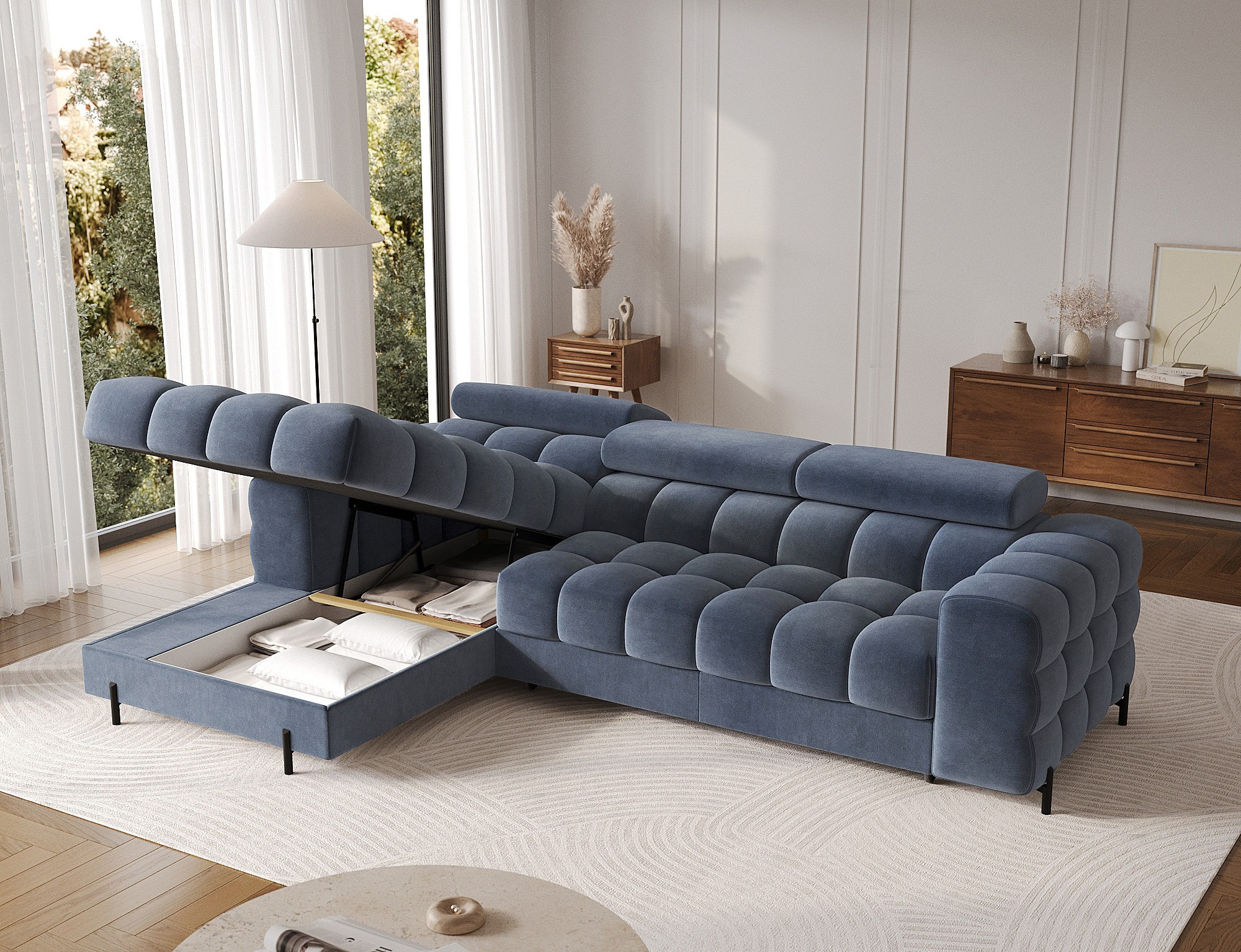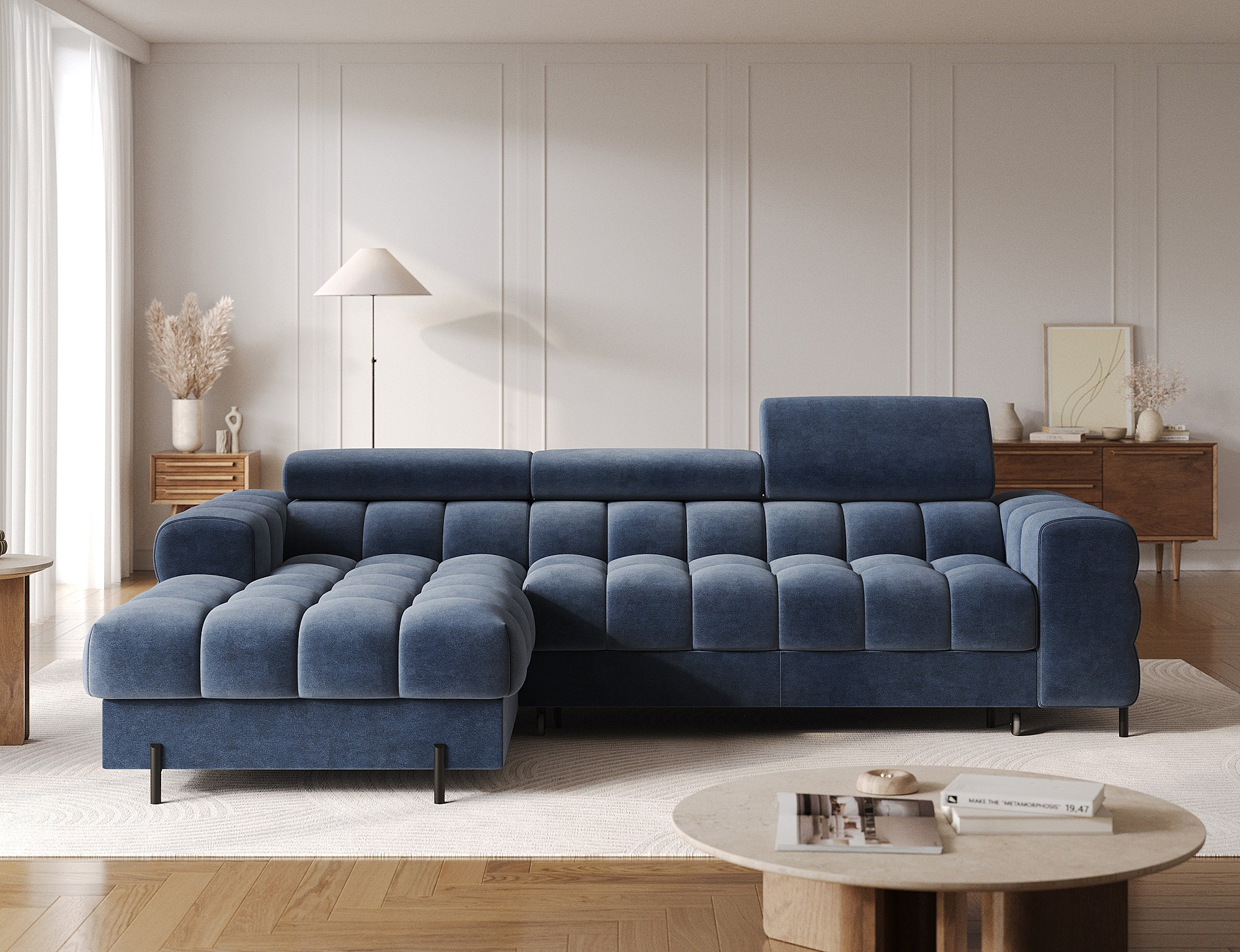 Rohová pohovka Felro je kombinací moderního designu, pohodlí a funkčnosti. Sedák pohovky je vyplněn vlnovými pružinami typu B a vysoce kvalitní pěnou T3030 a HR3030, což zajišťuje výjimečné pohodlí pro každodenní použití a relaxaci. To činí nábytek nejen měkkým a flexibilním, ale také odolným vůči deformaci, což zaručuje dlouhotrvající trvanlivost.Robustní konstrukce je podepřena kovovými nohami, které jsou opatřeny černým práškovým nástřikem, což celkovému designu dodává elegantní a moderní nádech. Felro má také funkci spaní, což z něj činí ideální volbu pro obývací pokoj, kde záleží jak na stylu, tak na praktičnosti. Mechanismus rozkládání "Dolphin" umožňuje snadnou a rychlou přeměnu pohovky na pohodlné lůžko.Další výhodou je čalouněné opěradlo, které zajišťuje, že pohovka vypadá skvěle z každého úhlu a může být umístěna buď proti zdi, nebo uprostřed místnosti. Celý design se nese v moderním stylu, díky čemuž je Felro ideální pro současné interiéry, přičemž přidává jak eleganci, tak funkčnost.