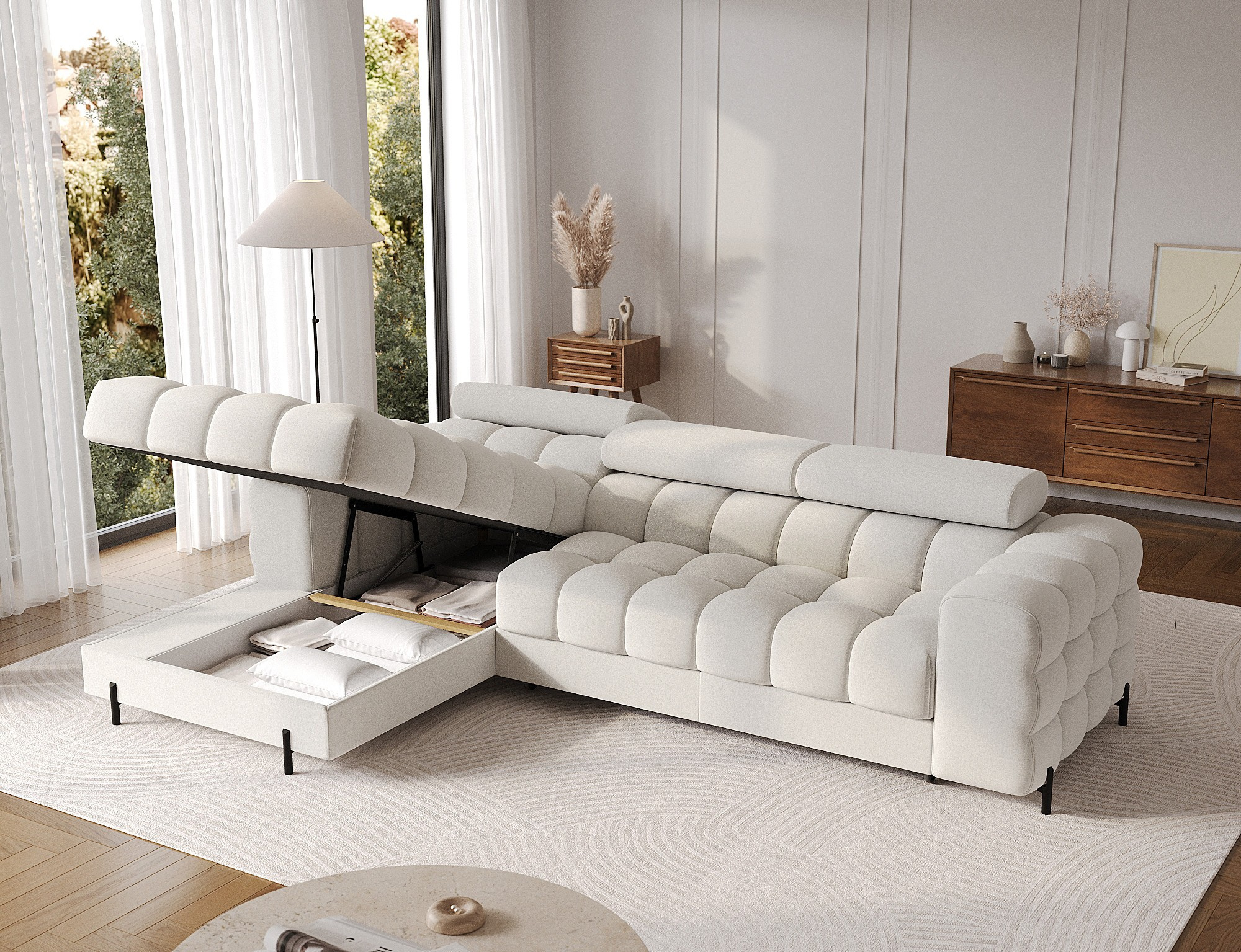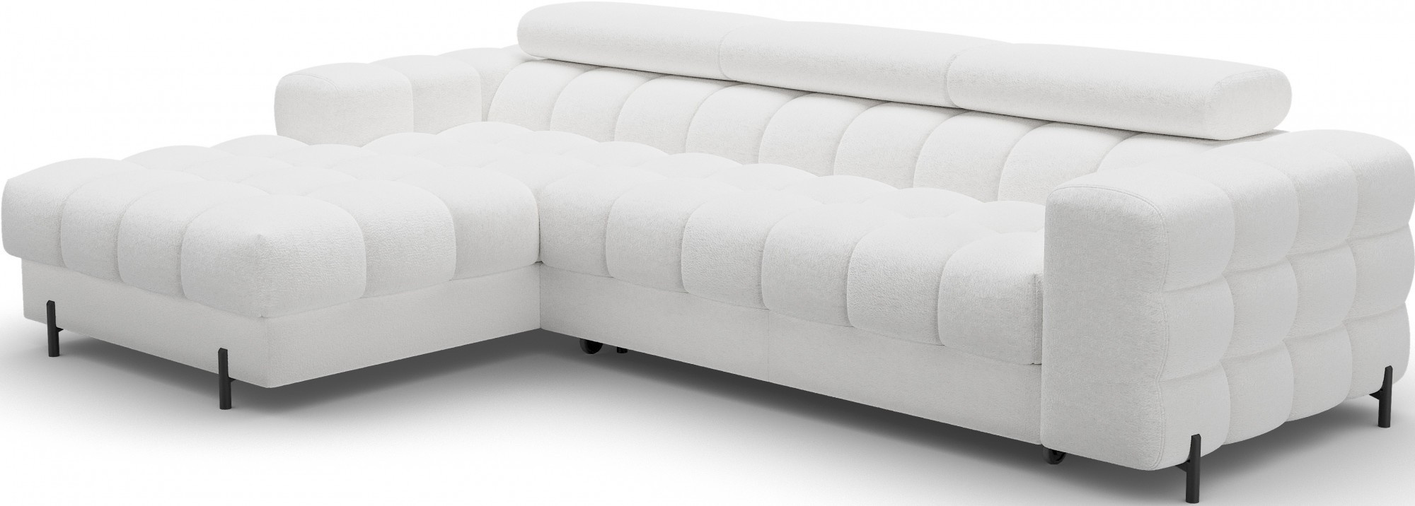 Rohová pohovka Felro je kombinací moderního designu, pohodlí a funkčnosti. Sedák pohovky je vyplněn vlnovými pružinami typu B a vysoce kvalitní pěnou T3030 a HR3030, což zajišťuje výjimečné pohodlí pro každodenní použití a relaxaci. To činí nábytek nejen měkkým a flexibilním, ale také odolným vůči deformaci, což zaručuje dlouhotrvající trvanlivost.Robustní konstrukce je podepřena kovovými nohami, které jsou opatřeny černým práškovým nástřikem, což celkovému designu dodává elegantní a moderní nádech. Felro má také funkci spaní, což z něj činí ideální volbu pro obývací pokoj, kde záleží jak na stylu, tak na praktičnosti. Mechanismus rozkládání "Dolphin" umožňuje snadnou a rychlou přeměnu pohovky na pohodlné lůžko.Další výhodou je čalouněné opěradlo, které zajišťuje, že pohovka vypadá skvěle z každého úhlu a může být umístěna buď proti zdi, nebo uprostřed místnosti. Celý design se nese v moderním stylu, díky čemuž je Felro ideální pro současné interiéry, přičemž přidává jak eleganci, tak funkčnost.
