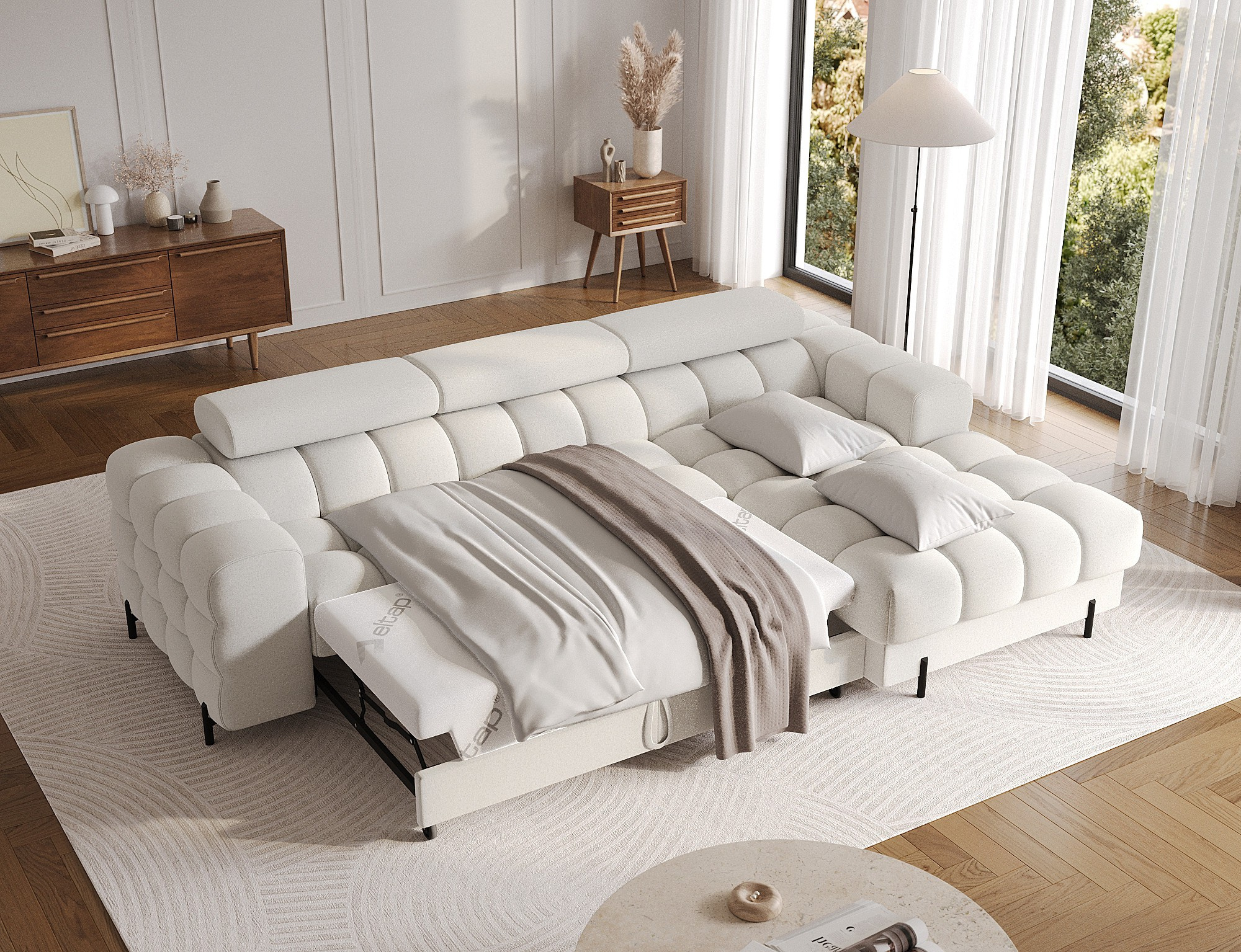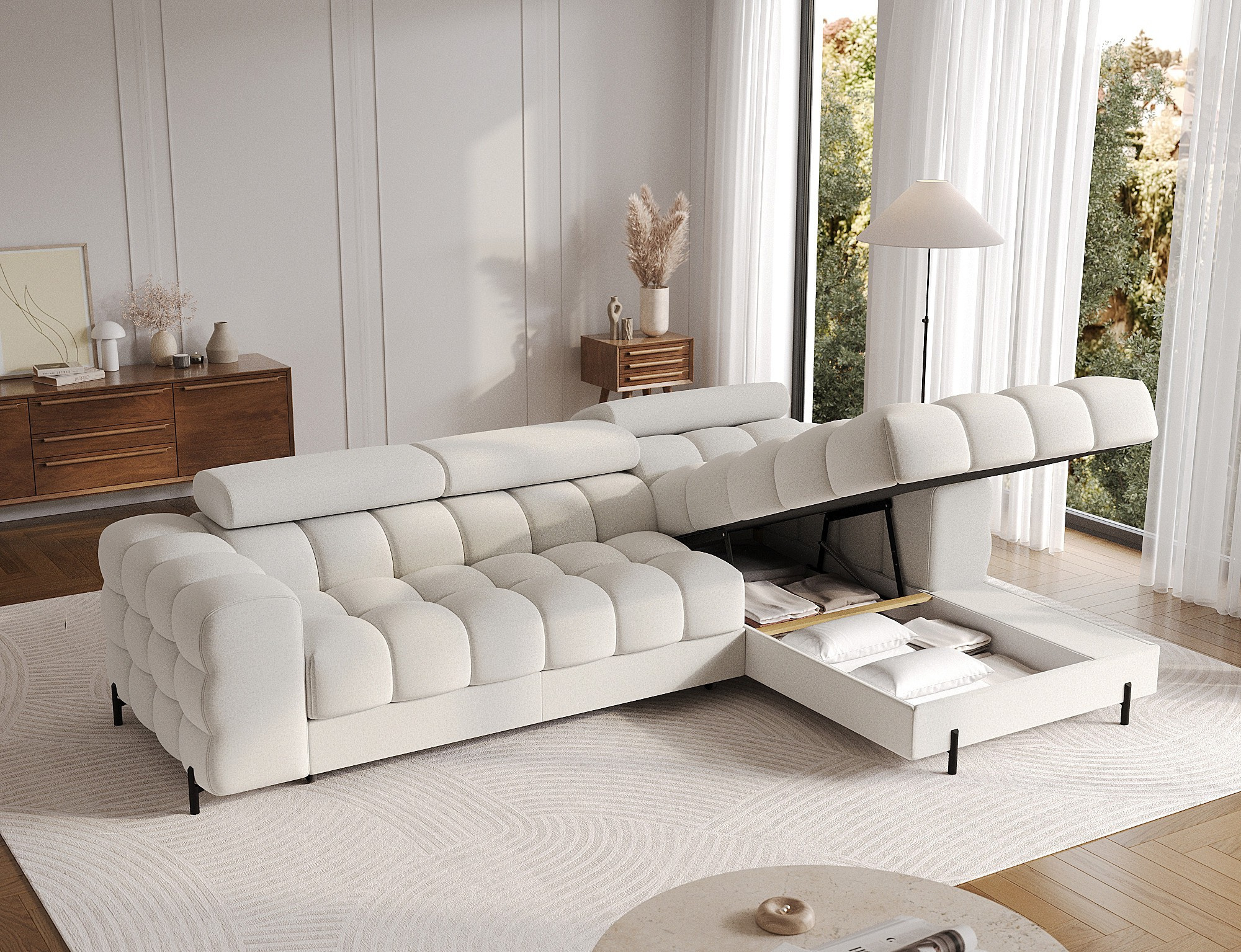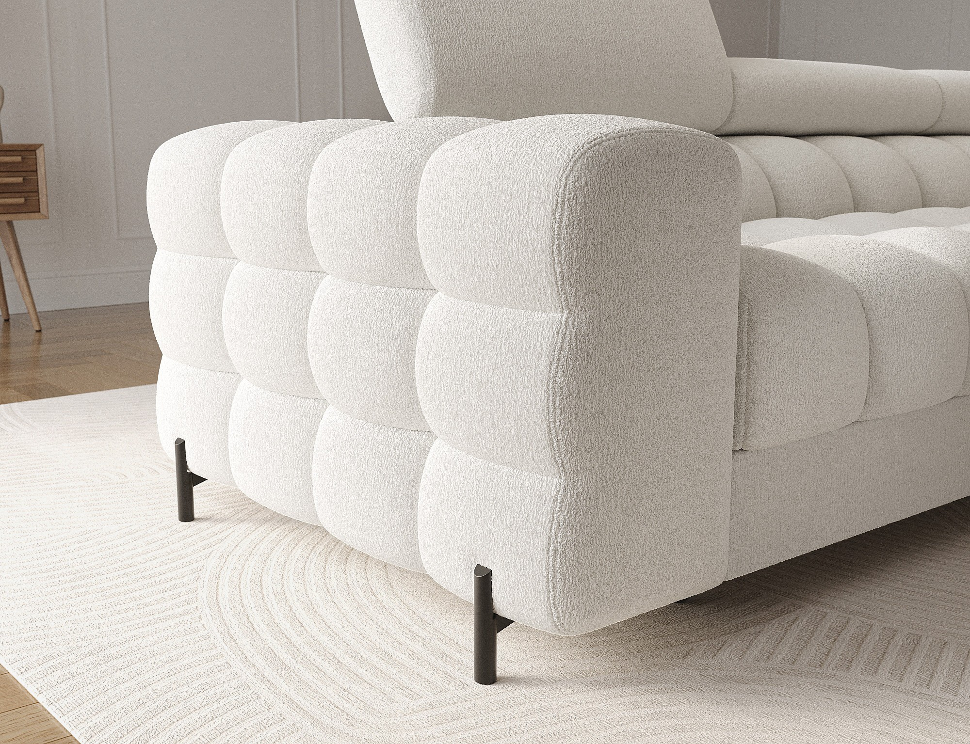 Rohová pohovka Felro je kombinací moderního designu, pohodlí a funkčnosti. Sedák pohovky je vyplněn vlnovými pružinami typu B a vysoce kvalitní pěnou T3030 a HR3030, což zajišťuje výjimečné pohodlí pro každodenní použití a relaxaci. To činí nábytek nejen měkkým a flexibilním, ale také odolným vůči deformaci, což zaručuje dlouhotrvající trvanlivost.Robustní konstrukce je podepřena kovovými nohami, které jsou opatřeny černým práškovým nástřikem, což celkovému designu dodává elegantní a moderní nádech. Felro má také funkci spaní, což z něj činí ideální volbu pro obývací pokoj, kde záleží jak na stylu, tak na praktičnosti. Mechanismus rozkládání "Dolphin" umožňuje snadnou a rychlou přeměnu pohovky na pohodlné lůžko.Další výhodou je čalouněné opěradlo, které zajišťuje, že pohovka vypadá skvěle z každého úhlu a může být umístěna buď proti zdi, nebo uprostřed místnosti. Celý design se nese v moderním stylu, díky čemuž je Felro ideální pro současné interiéry, přičemž přidává jak eleganci, tak funkčnost.
