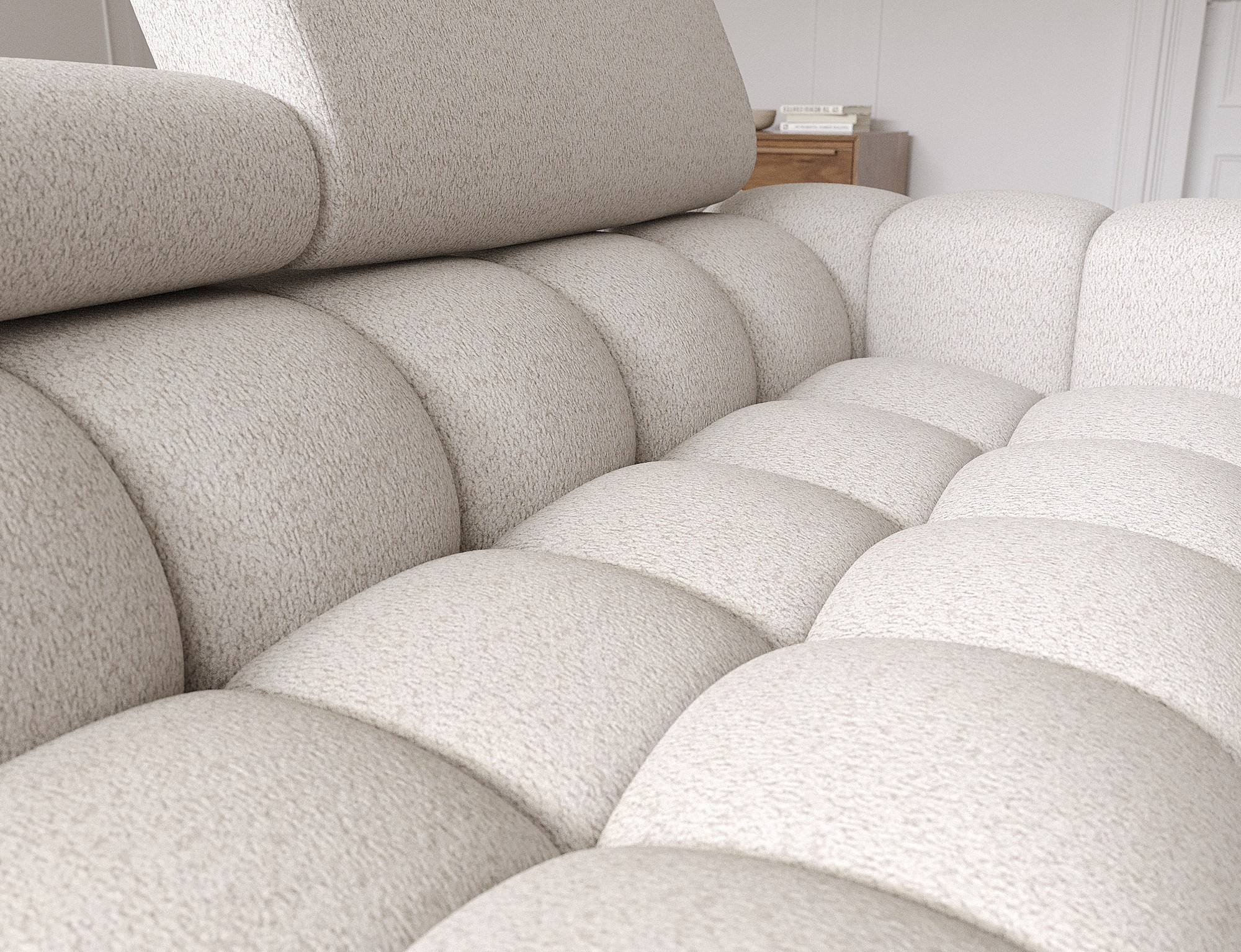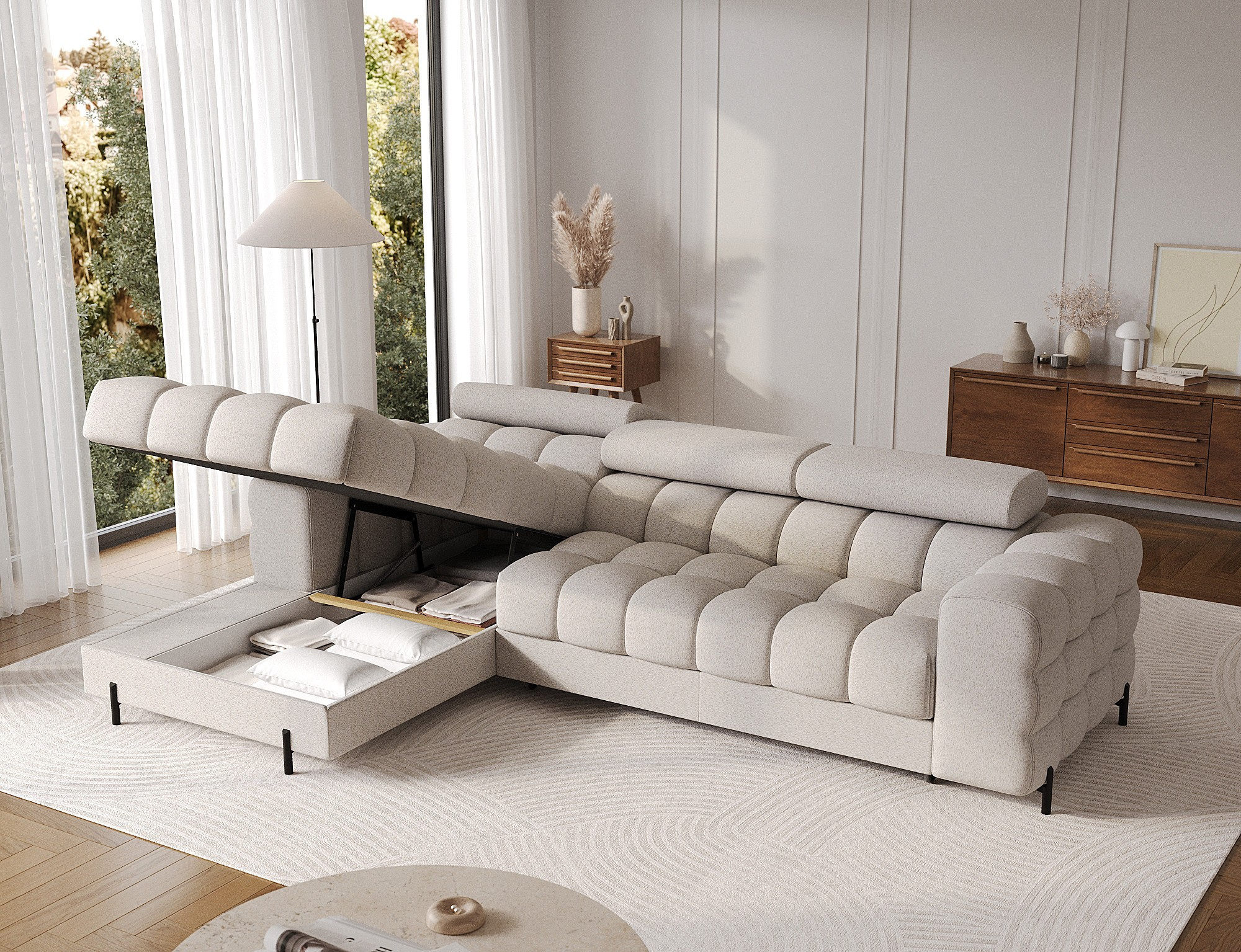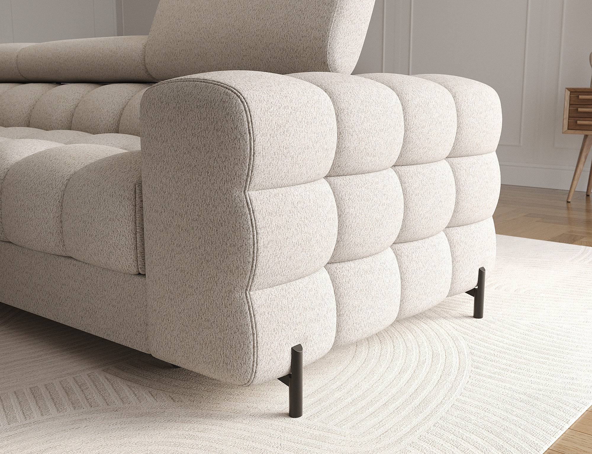 Rohová pohovka Felro je kombinací moderního designu, pohodlí a funkčnosti. Sedák pohovky je vyplněn vlnovými pružinami typu B a vysoce kvalitní pěnou T3030 a HR3030, což zajišťuje výjimečné pohodlí pro každodenní použití a relaxaci. To činí nábytek nejen měkkým a flexibilním, ale také odolným vůči deformaci, což zaručuje dlouhotrvající trvanlivost.Robustní konstrukce je podepřena kovovými nohami, které jsou opatřeny černým práškovým nástřikem, což celkovému designu dodává elegantní a moderní nádech. Felro má také funkci spaní, což z něj činí ideální volbu pro obývací pokoj, kde záleží jak na stylu, tak na praktičnosti. Mechanismus rozkládání "Dolphin" umožňuje snadnou a rychlou přeměnu pohovky na pohodlné lůžko.Další výhodou je čalouněné opěradlo, které zajišťuje, že pohovka vypadá skvěle z každého úhlu a může být umístěna buď proti zdi, nebo uprostřed místnosti. Celý design se nese v moderním stylu, díky čemuž je Felro ideální pro současné interiéry, přičemž přidává jak eleganci, tak funkčnost.