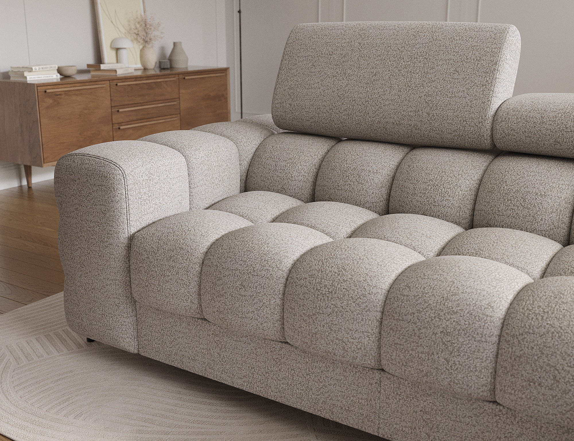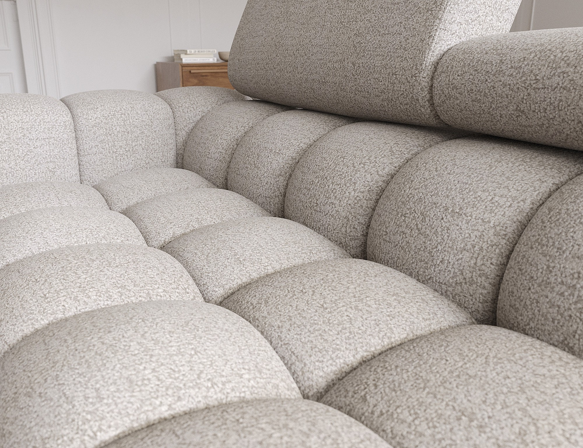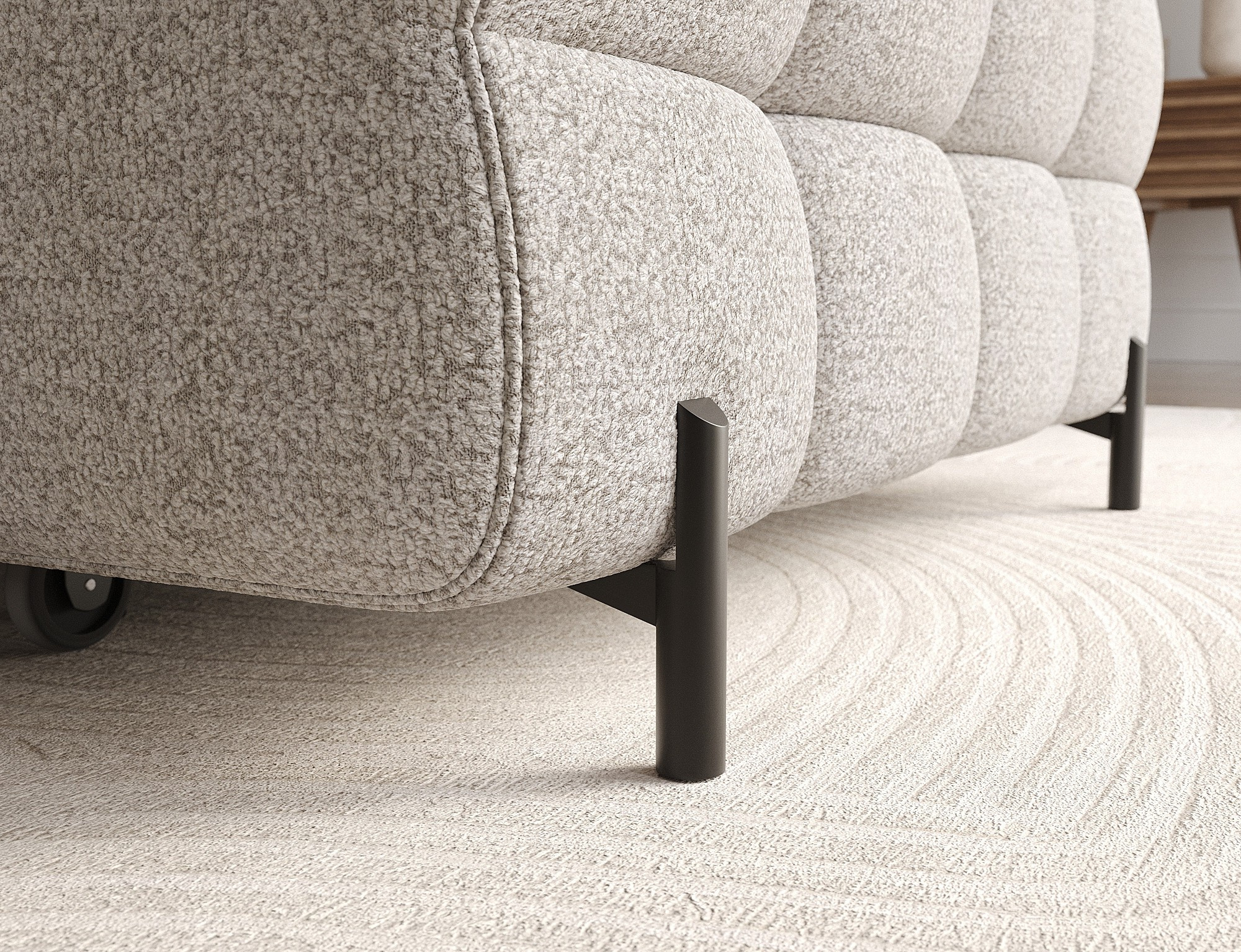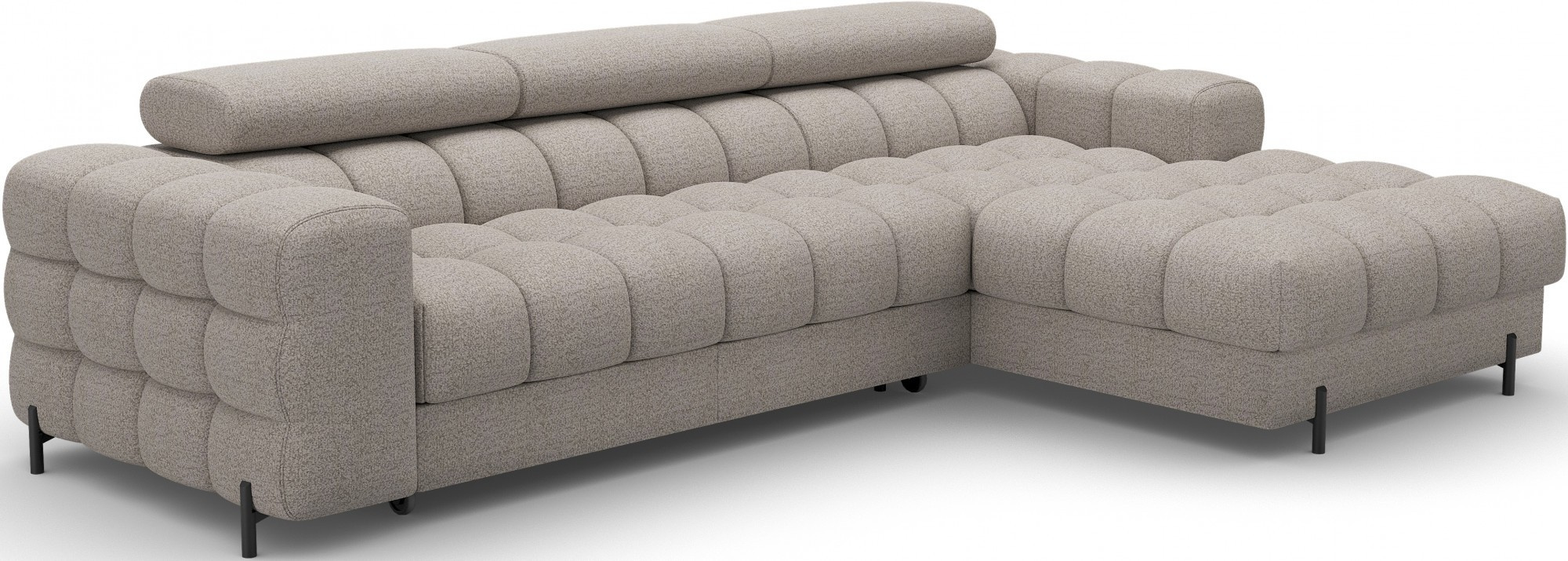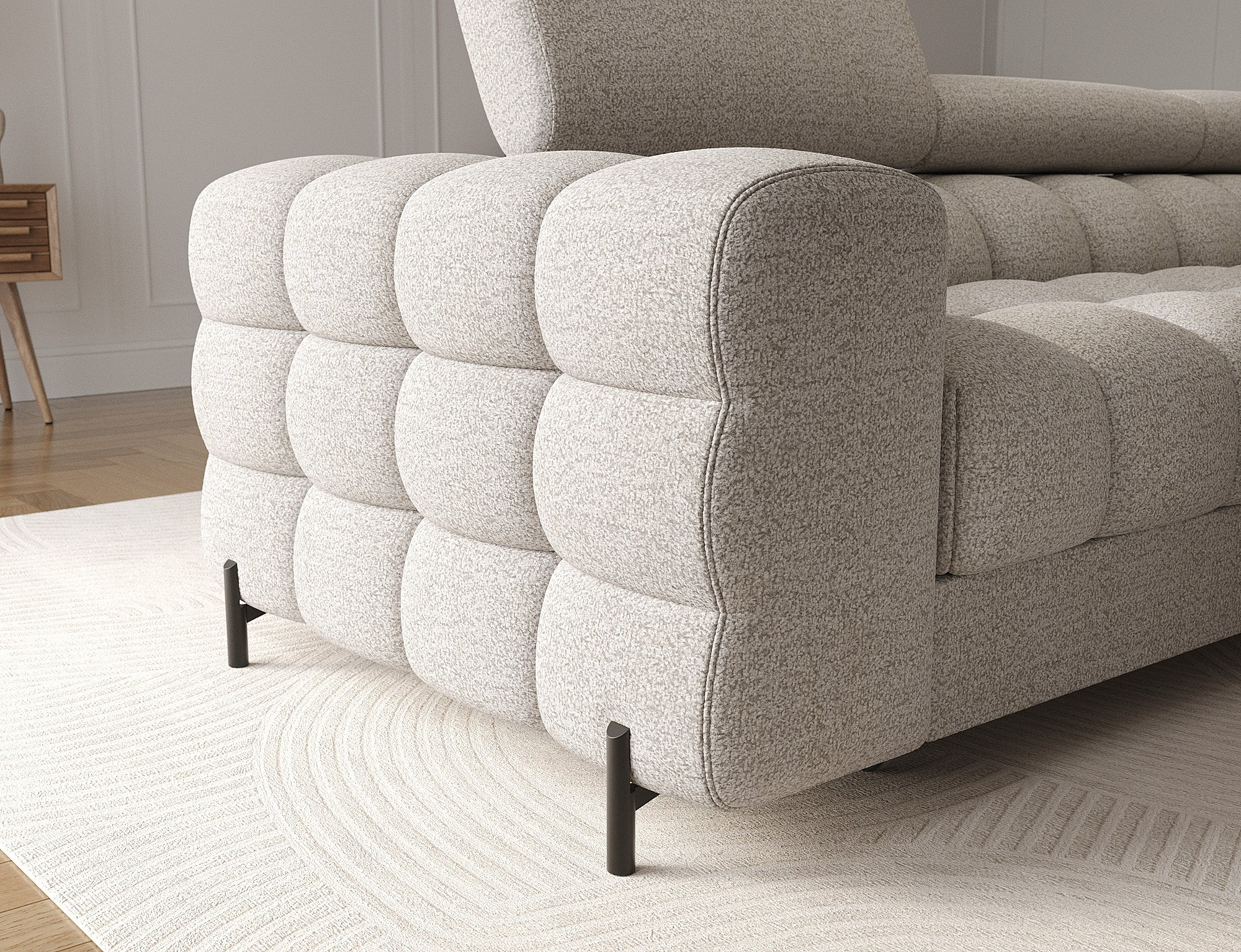 Rohová pohovka Felro je kombinací moderního designu, pohodlí a funkčnosti. Sedák pohovky je vyplněn vlnovými pružinami typu B a vysoce kvalitní pěnou T3030 a HR3030, což zajišťuje výjimečné pohodlí pro každodenní použití a relaxaci. To činí nábytek nejen měkkým a flexibilním, ale také odolným vůči deformaci, což zaručuje dlouhotrvající trvanlivost.Robustní konstrukce je podepřena kovovými nohami, které jsou opatřeny černým práškovým nástřikem, což celkovému designu dodává elegantní a moderní nádech. Felro má také funkci spaní, což z něj činí ideální volbu pro obývací pokoj, kde záleží jak na stylu, tak na praktičnosti. Mechanismus rozkládání "Dolphin" umožňuje snadnou a rychlou přeměnu pohovky na pohodlné lůžko.Další výhodou je čalouněné opěradlo, které zajišťuje, že pohovka vypadá skvěle z každého úhlu a může být umístěna buď proti zdi, nebo uprostřed místnosti. Celý design se nese v moderním stylu, díky čemuž je Felro ideální pro současné interiéry, přičemž přidává jak eleganci, tak funkčnost.