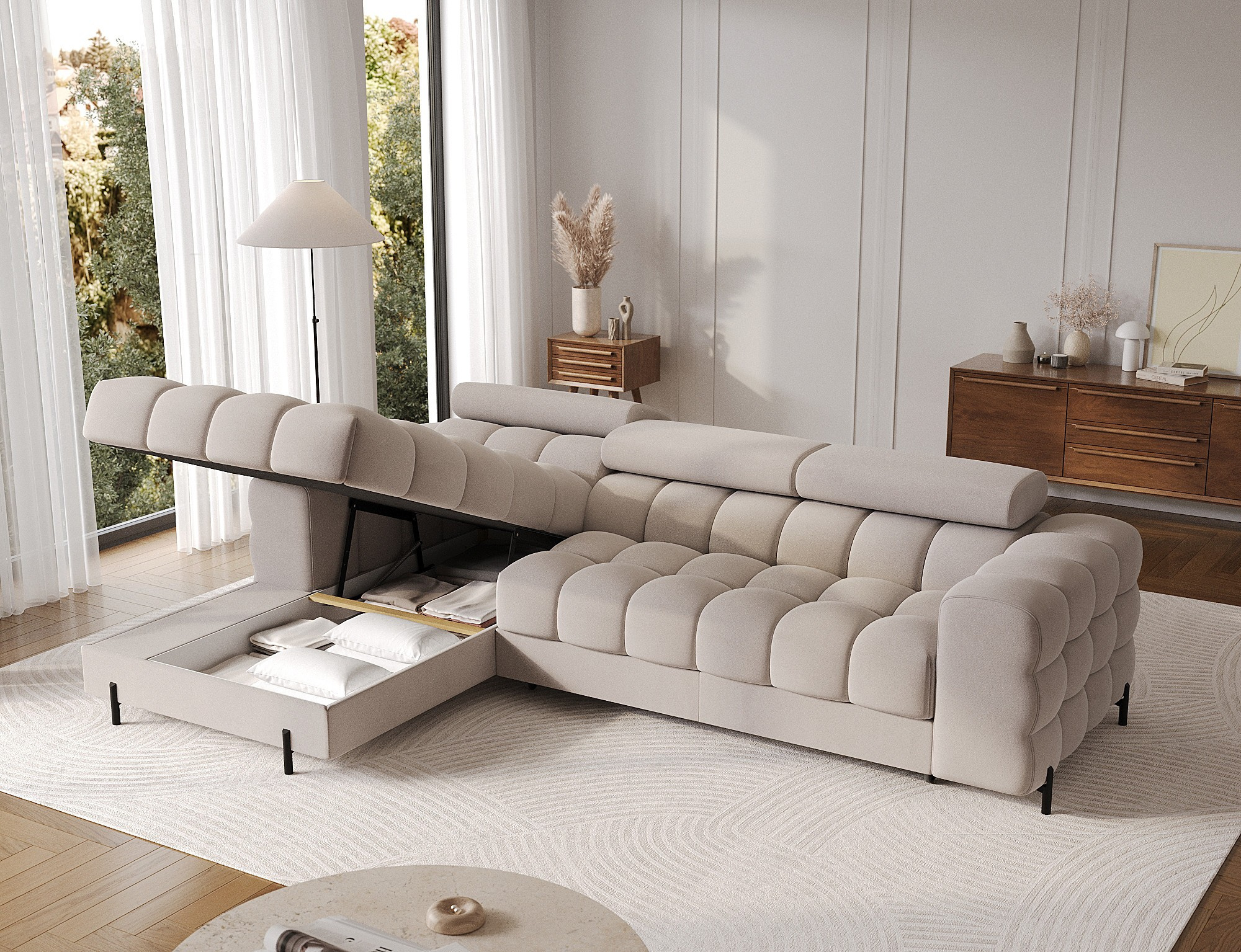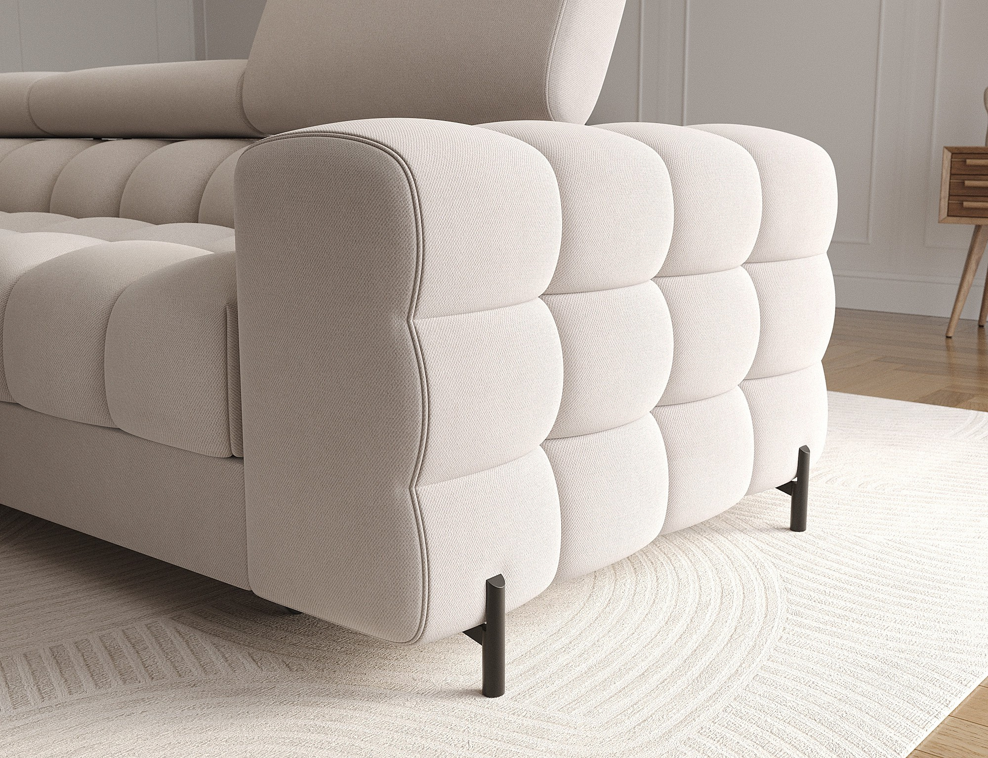 Rohová pohovka Felro je kombinací moderního designu, pohodlí a funkčnosti. Sedák pohovky je vyplněn vlnovými pružinami typu B a vysoce kvalitní pěnou T3030 a HR3030, což zajišťuje výjimečné pohodlí pro každodenní použití a relaxaci. To činí nábytek nejen měkkým a flexibilním, ale také odolným vůči deformaci, což zaručuje dlouhotrvající trvanlivost.Robustní konstrukce je podepřena kovovými nohami, které jsou opatřeny černým práškovým nástřikem, což celkovému designu dodává elegantní a moderní nádech. Felro má také funkci spaní, což z něj činí ideální volbu pro obývací pokoj, kde záleží jak na stylu, tak na praktičnosti. Mechanismus rozkládání "Dolphin" umožňuje snadnou a rychlou přeměnu pohovky na pohodlné lůžko.Další výhodou je čalouněné opěradlo, které zajišťuje, že pohovka vypadá skvěle z každého úhlu a může být umístěna buď proti zdi, nebo uprostřed místnosti. Celý design se nese v moderním stylu, díky čemuž je Felro ideální pro současné interiéry, přičemž přidává jak eleganci, tak funkčnost.