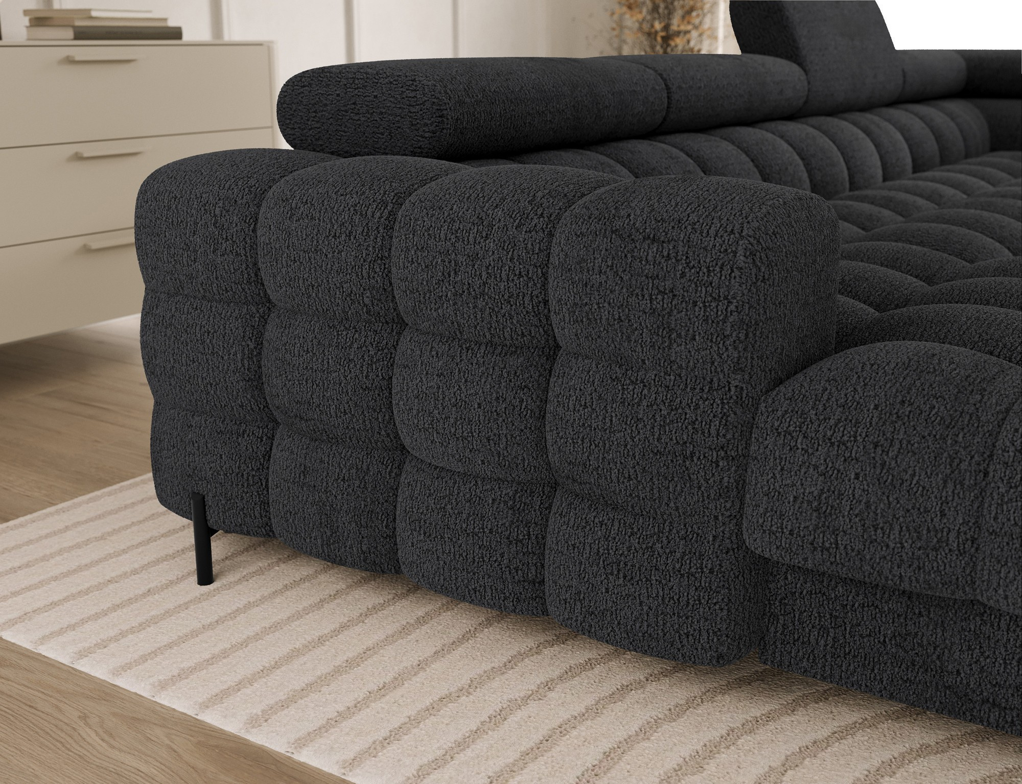 Jednou z hlavních předností této sedací soupravy je její úložný prostor. Už nikdy nebudete muset řešit, kam uložit deky, polštáře nebo sezónní dekorace. Všechny tyto věci můžete snadno a rychle uschovat přímo v sedací soupravě, což vám pomůže udržet váš obývací pokoj čistý a uspořádaný.