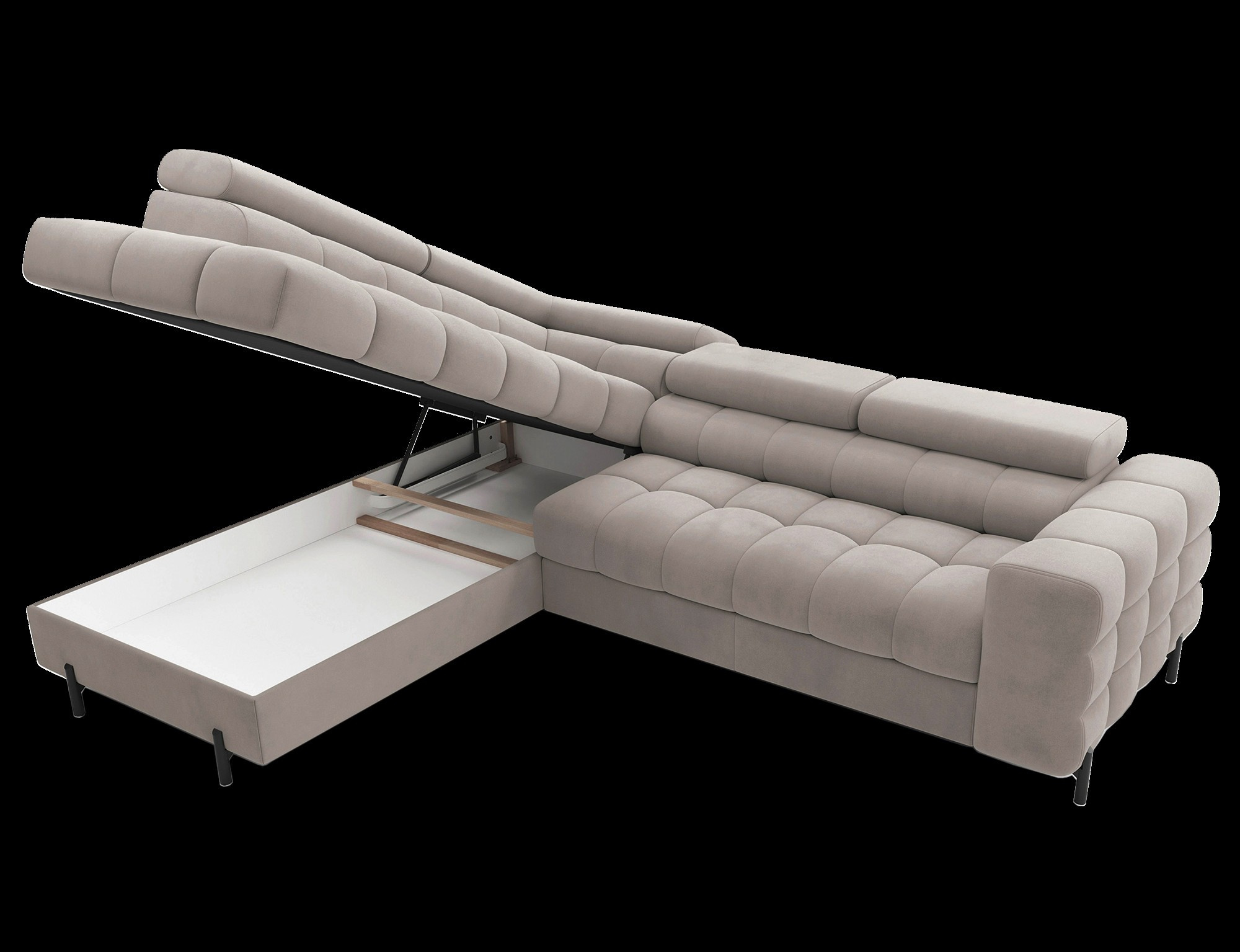 Tato sedací souprava není jen o vzhledu, ale také o funkčnosti. Disponuje praktickým úložným prostorem, který je ideální pro uschování přikrývek, polštářů nebo dalších nezbytností. Díky možnosti rozkládání se snadno promění v pohodlné lůžko s plochou na spaní o rozměrech 195 x 123 cm, což je ideální pro nečekané návštěvy nebo příležitostné přespání.