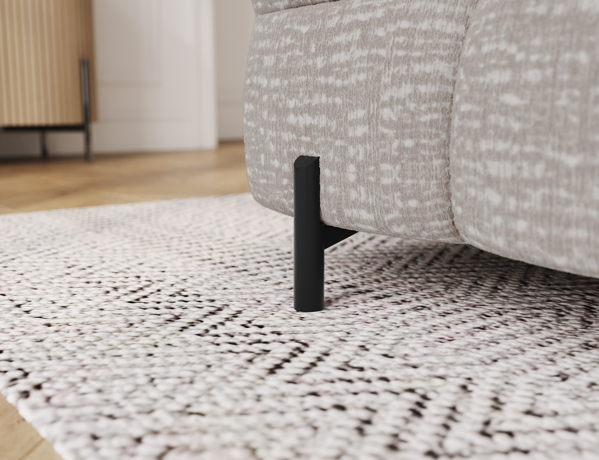 Pohovka je vybavena kovovými nožkami v elegantní černé barvě o výšce 9 cm, které dodávají celkovému vzhledu moderní nádech. I když pohovka nemá úložný prostor, její design a funkčnost to více než vynahrazují.