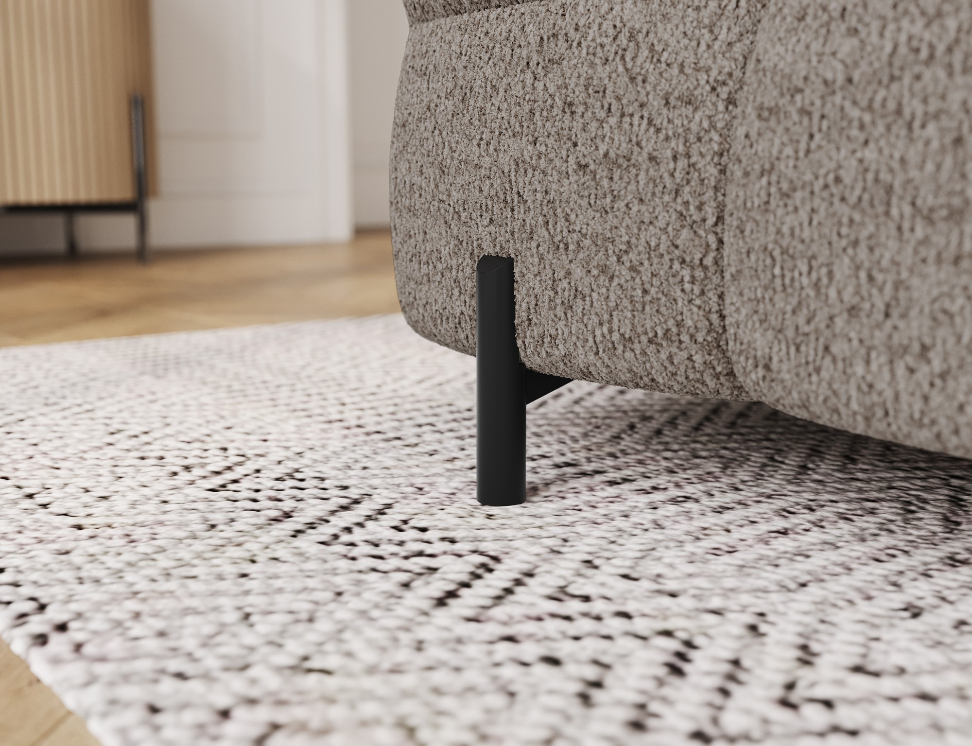 Pohovka je vybavena kovovými nožkami v elegantní černé barvě o výšce 9 cm, které dodávají celkovému vzhledu moderní nádech. I když pohovka nemá úložný prostor, její design a funkčnost to více než vynahrazují.