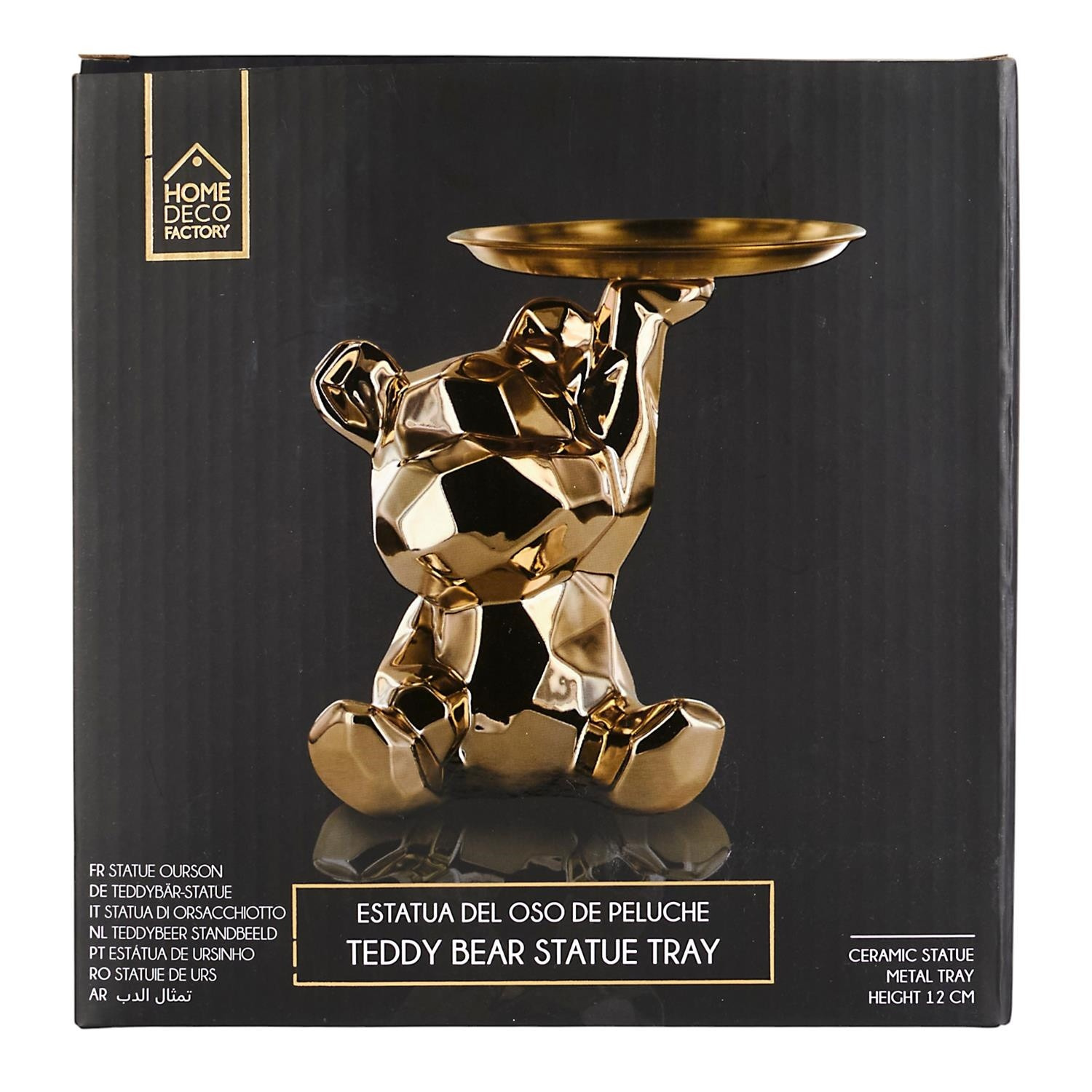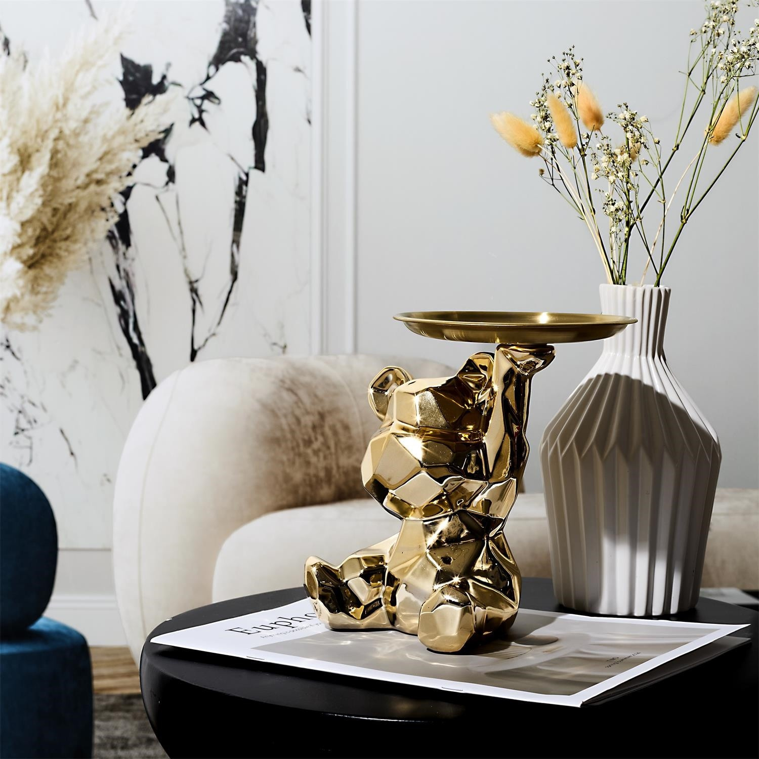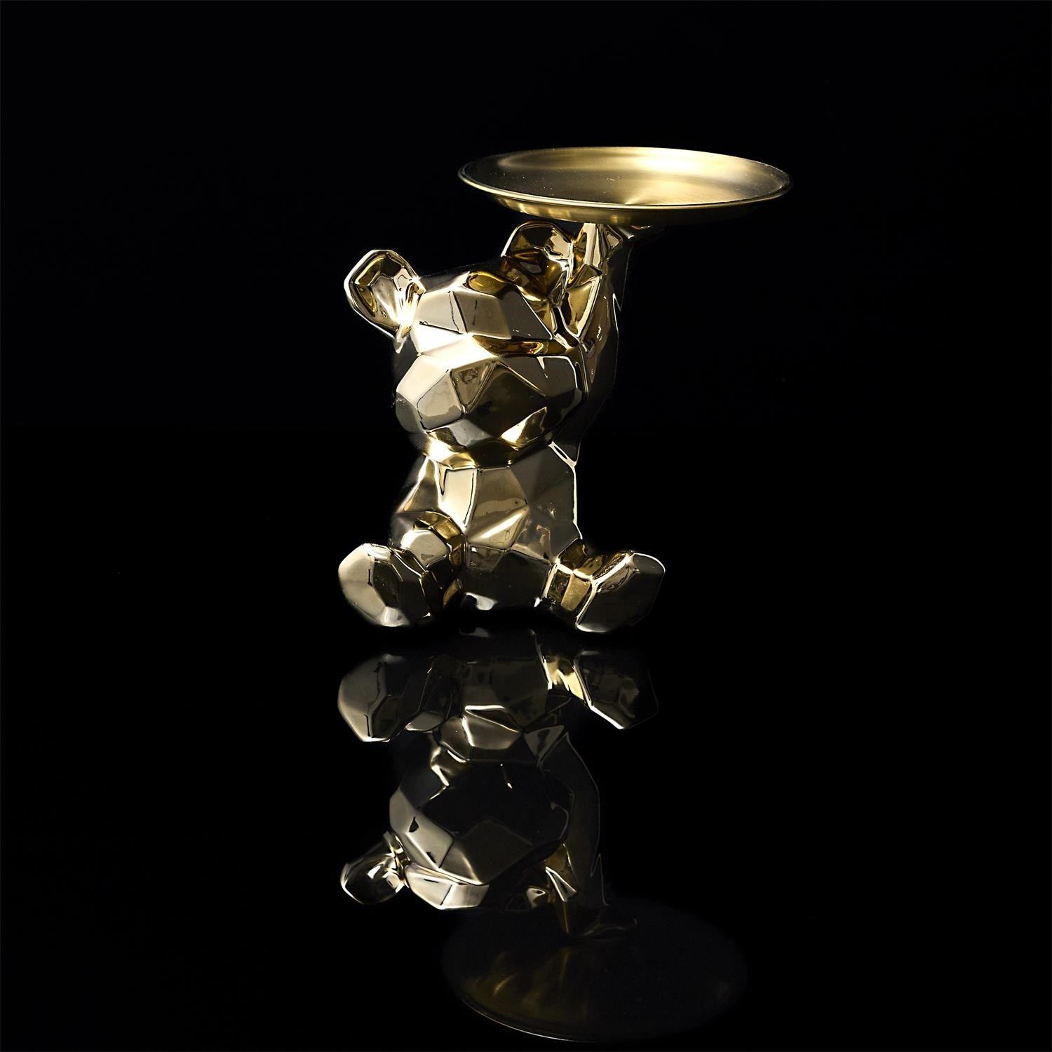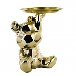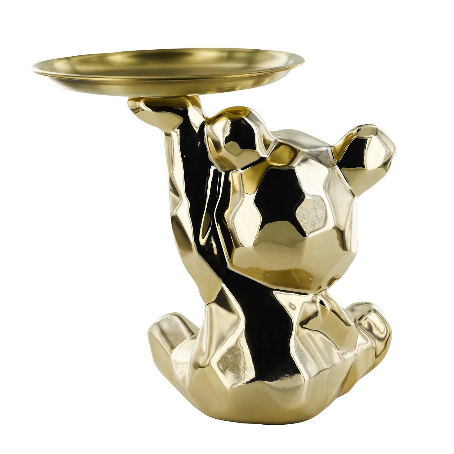 Keramická figurka připomínající medvídka se zlatým, kovovým podnosem je ideálním dekorativním prvkem, který také udělá pořádek s klíči nebo jinými drobnými předměty.
