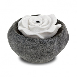Zahradní fontána ve tvaru květu růže. Je vyrobena z polyresinu v dekoru černý kámen granit a polyresinový květ v dekoru bílého písku. Podsvětlení tryskající vody je LED diodami ve studeně modrém odstínu. Miničerpadlo je elektrické 240V / 12V s plynulou regulací. Zahradní nebo bytové fontány se staly již tradiční součástí našeho života. Správně místěné pomáhají správnému proudění energie a nastavení rovnováhy, ale jsou výrazným dekorativním i funkčním prvkem.