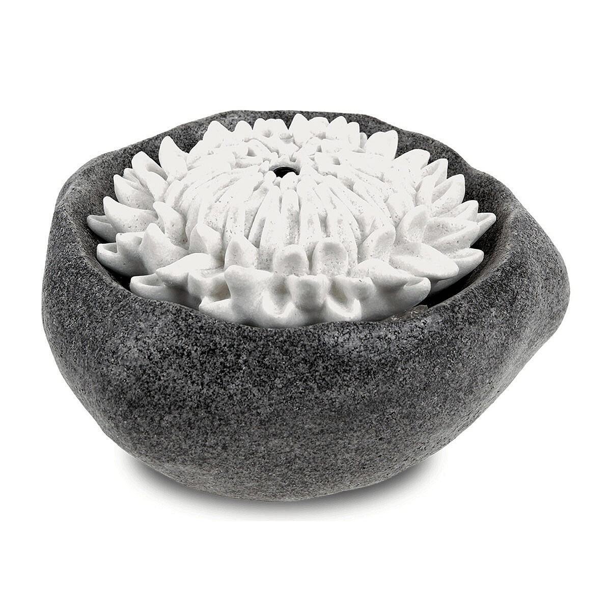 Zahradní fontána ve tvaru květu chrysantémy. Je vyrobena z polyresinu v dekoru černý kámen granit a polyresinový květ v dekoru bílého písku. Podsvětlení tryskající vody je LED diodami ve studeně modrém odstínu. Miničerpadlo je elektrické 240V / 12V s plynulou regulací. Zahradní nebo bytové fontány se staly již tradiční součástí našeho života. Správně místěné pomáhají správnému proudění energie a nastavení rovnováhy, ale jsou výrazným dekorativním i funkčním prvkem.
