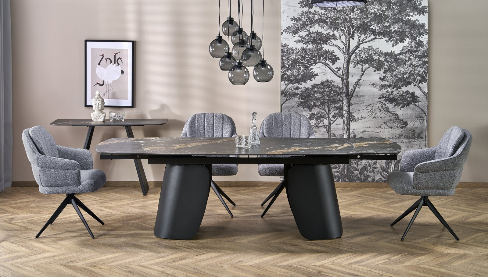 Díky svému modernímu designu a elegantnímu provedení se jídelní stůl FORUM hodí do jakéhokoli interiéru. Černá barva a efekt mramoru vytvářejí sofistikovaný vzhled, který se snadno kombinuje s různými styly nábytku a dekorací. Tento stůl je nejen praktickým kusem nábytku, ale také stylovým doplňkem, který dodá vaší jídelně jedinečný charakter.