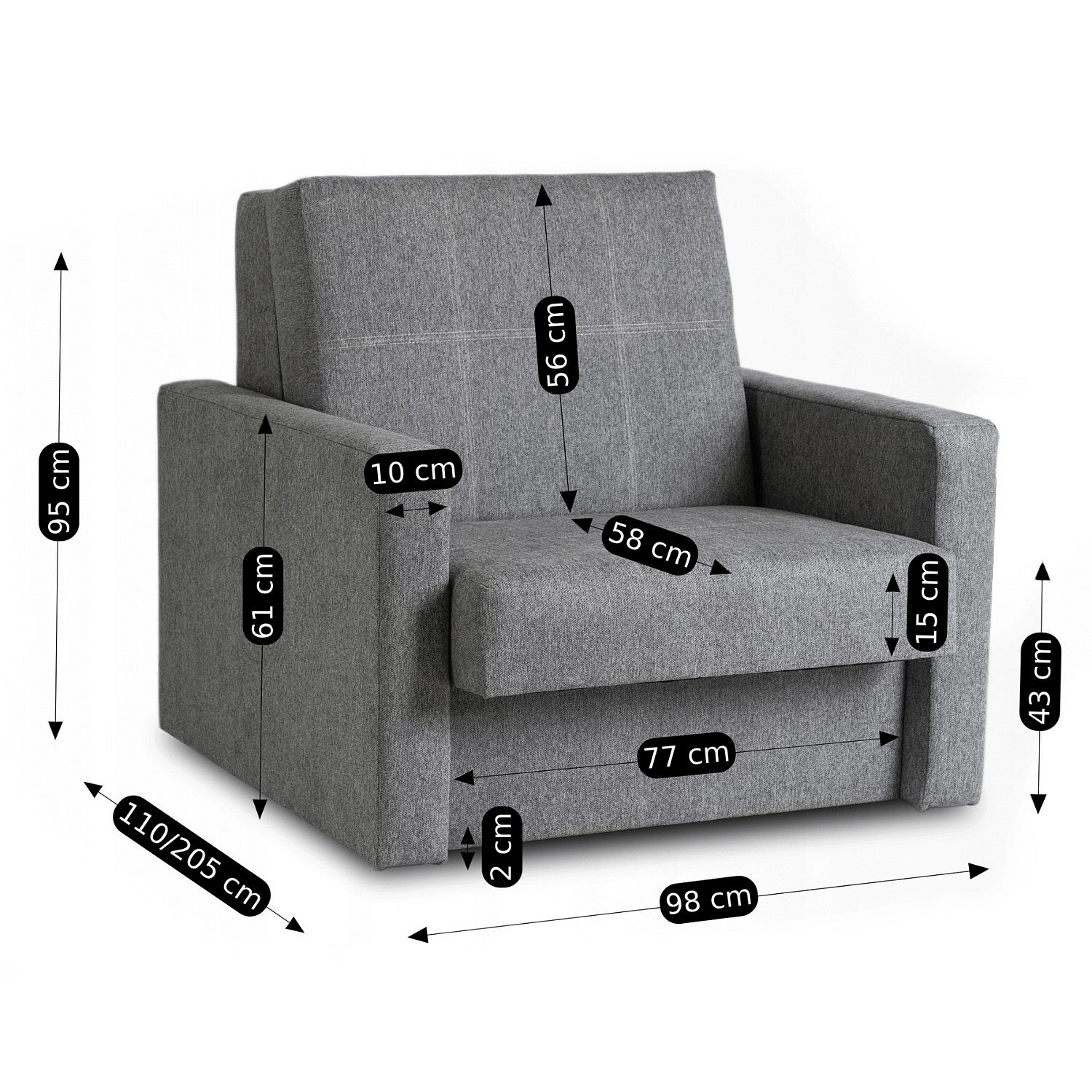 | Głębokość fotela po rozłożeniu | 205 cm |