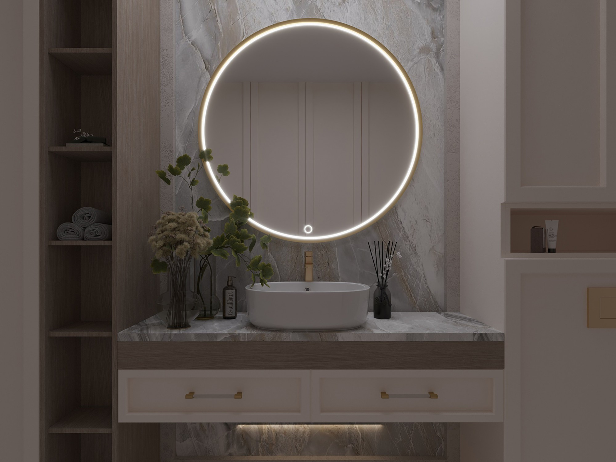 Gerbinie L je jedinečné zrcadlo s osvětlením, které vás okouzlí svou elegancí a funkčností. Toto zrcadlo má rozměry 60 cm x 60 cm a hloubku panelu 2 cm, což z něj činí ideální volbu pro různé prostory. Jeho kulatý rám ve zlatém provedení mu dodává luxusní charakter a činí z něj designový kousek ve vašem interiéru. Tento zlatý rám není jen esteticky příjemný, ale také odolný, což zajišťuje dlouhodobé používání zrcadla. Gerbinie L má ochrannou třídu IP45, což znamená, že je odolná proti prachu a vlhkosti. Můžete jej umístit do koupelen nebo jiných vlhkých prostor, aniž byste se museli obávat o narušení jeho bezchybného vzhledu. Toto zrcadlo je vybaveno energeticky úsporným LED světelným zdrojem s výkonem 15W, který poskytuje jasné a rovnoměrné osvětlení. Je napájen speciálním LED Slim zdrojem, který je nejen šetrný k životnímu prostředí, ale také přispívá k úsporám energie. V balení najdete vše, co potřebujete pro snadnou a bezproblémovou instalaci, včetně zástrček, šroubů a háčků. Hmotnost zrcadla je 7.5 kg a rozměry balení jsou 67.8 cm x 71 cm x 8 cm, usnadňuje přepravu a instalaci. Gerbinie L není jen zrcadlo s osvětlením; je to také jedinečný prvek interiérového designu, který přidává sofistikovanost a eleganci vašemu prostoru.