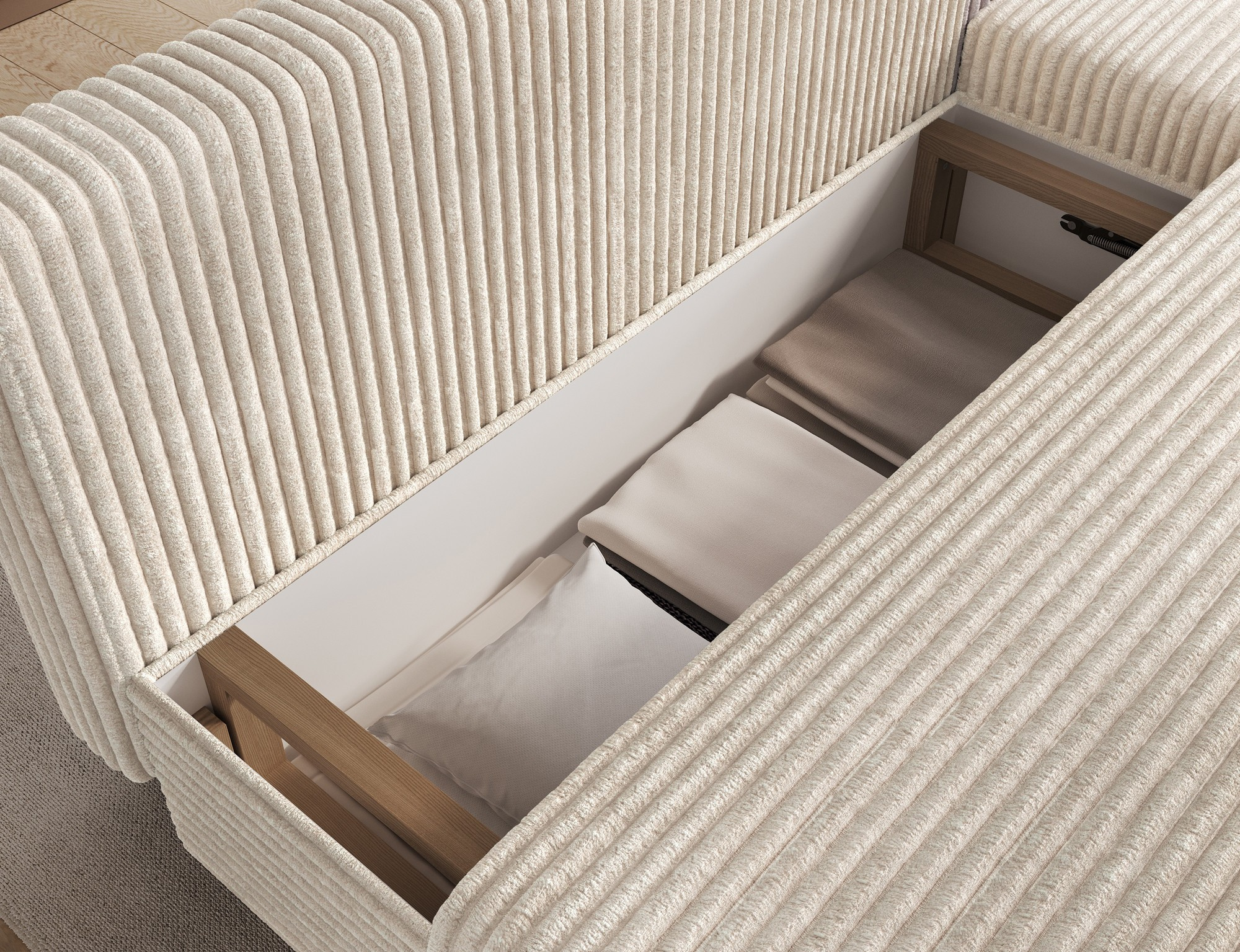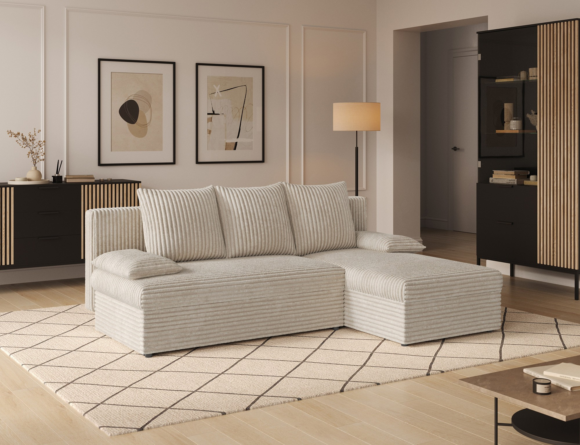 Tato sedací souprava je nejen krásná, ale také velmi praktická. Díky úložnému prostoru můžete snadno uschovat deky, polštáře nebo jiné předměty, které chcete mít po ruce, ale zároveň je mít úhledně uklizené. Souprava je vybavena funkcí rozkládání, což z ní činí ideální volbu pro hosty nebo pro ty, kteří si rádi dopřejí pohodlný odpočinek. Po rozložení nabízí plochu na spaní o rozměrech 124 x 201 cm, což poskytuje dostatek prostoru pro pohodlný spánek.