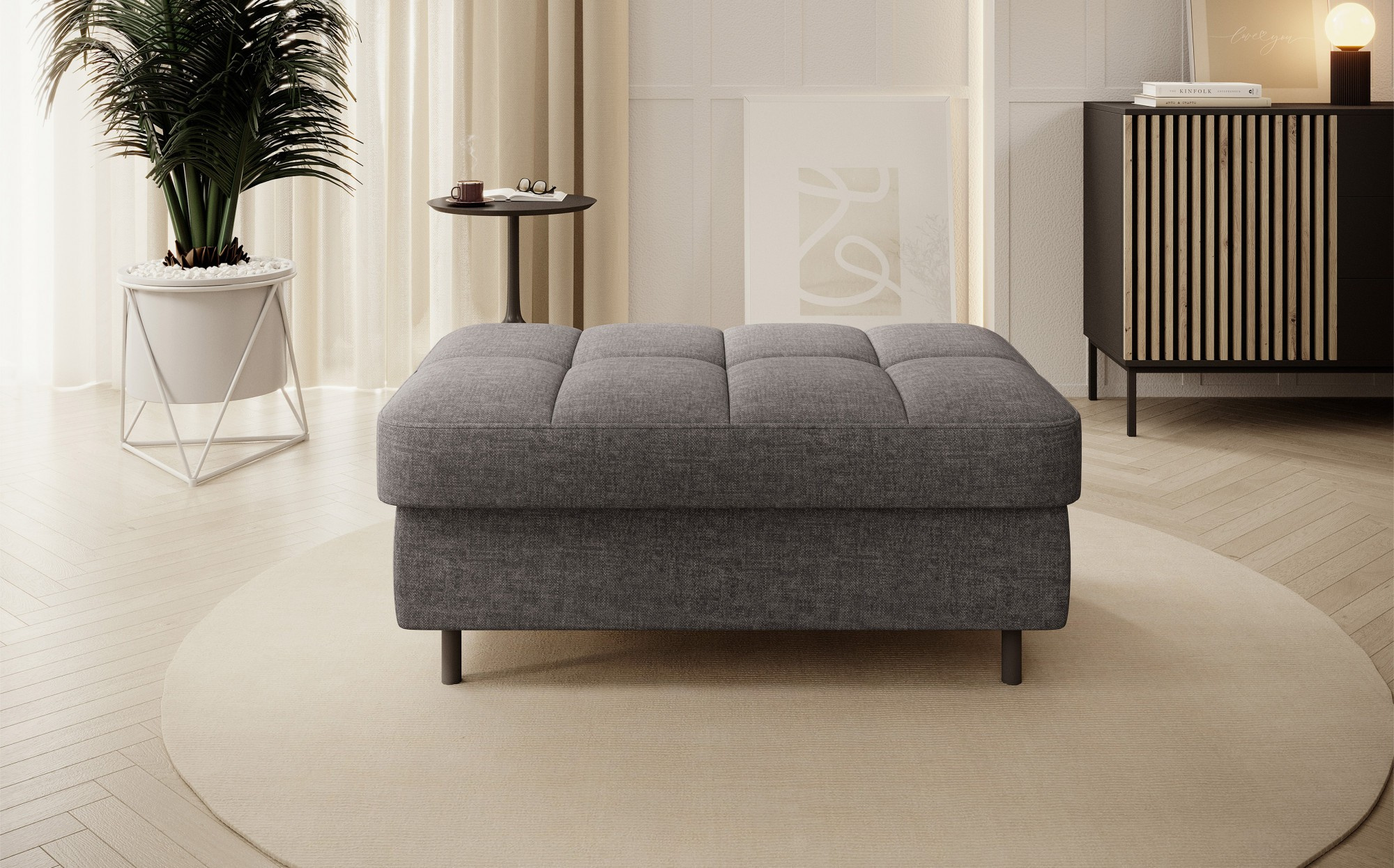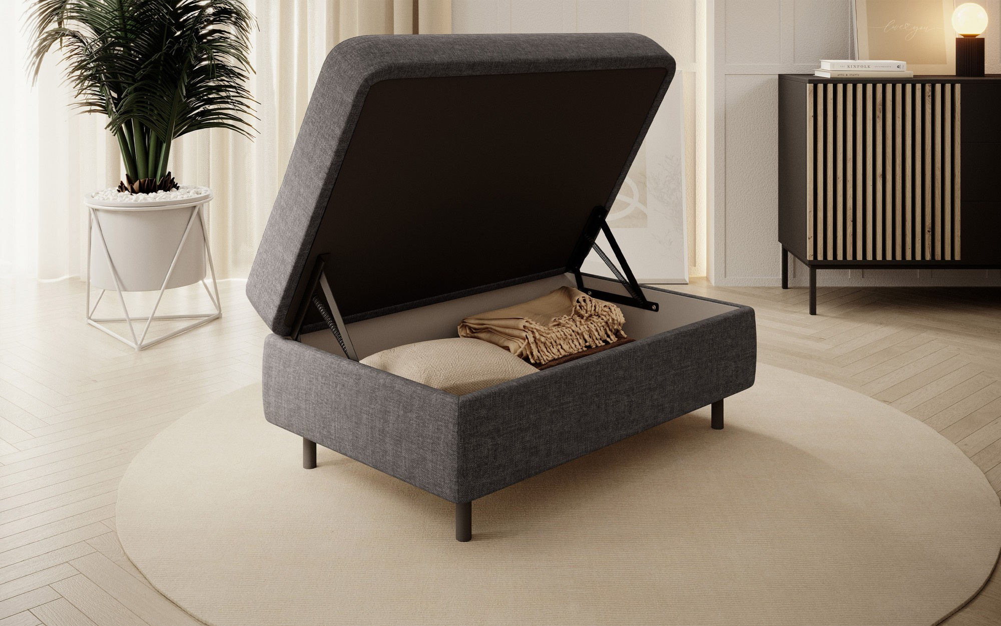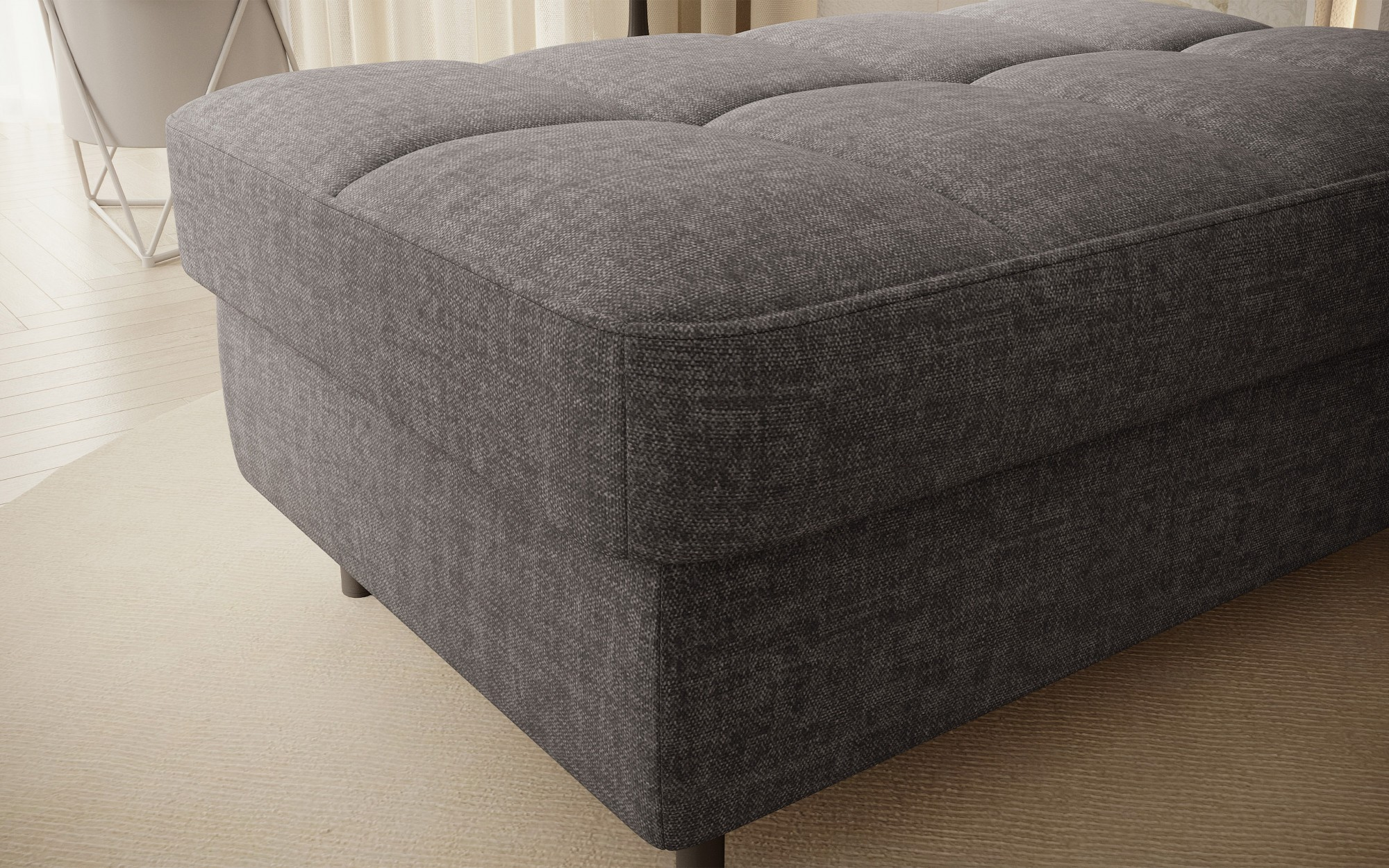Gomsi puf s rozměry 45 cm (výška) x 72 cm (šířka) x 104 cm (délka) je elegantní a funkční kus nábytku. Taburet má pevné černé kovové nohy, které zajišťují stabilitu a dodávají moderní vzhled. Vestavěný úložný prostor na ložní prádlo umožňuje praktické uložení dalších věcí, což z něj činí ideální řešení pro malé prostory, kde se počítá každý centimetr. Pohodlí při používání zajišťují vysoce kvalitní materiály, jako je HR pěna a T2130 pěna, které zaručují komfort a odolnost. Povrchová úprava taburetu je estetická a moderní, což z něj činí ideální doplněk pro různé styly interiérového designu.
