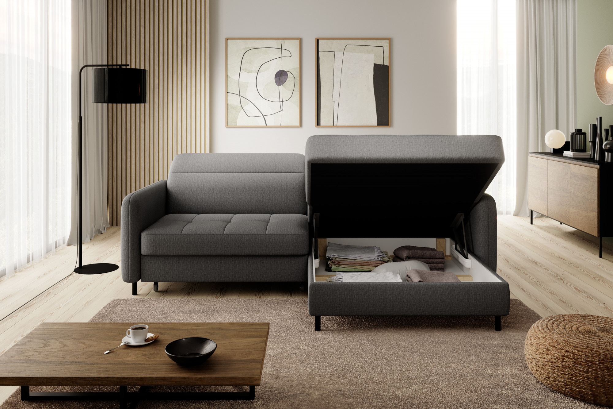 Tato rohová sedací souprava je navržena s ohledem na vaše potřeby. Disponuje praktickým úložným prostorem, který vám umožní snadno uschovat deky, polštáře nebo jiné předměty, které chcete mít po ruce, ale zároveň je mít úhledně uklizené. Rozkládací mechanismus promění sedací soupravu v pohodlné lůžko s plochou na spaní o rozměrech 128 x 200 cm, což je ideální pro hosty nebo pro příležitostné přespání.