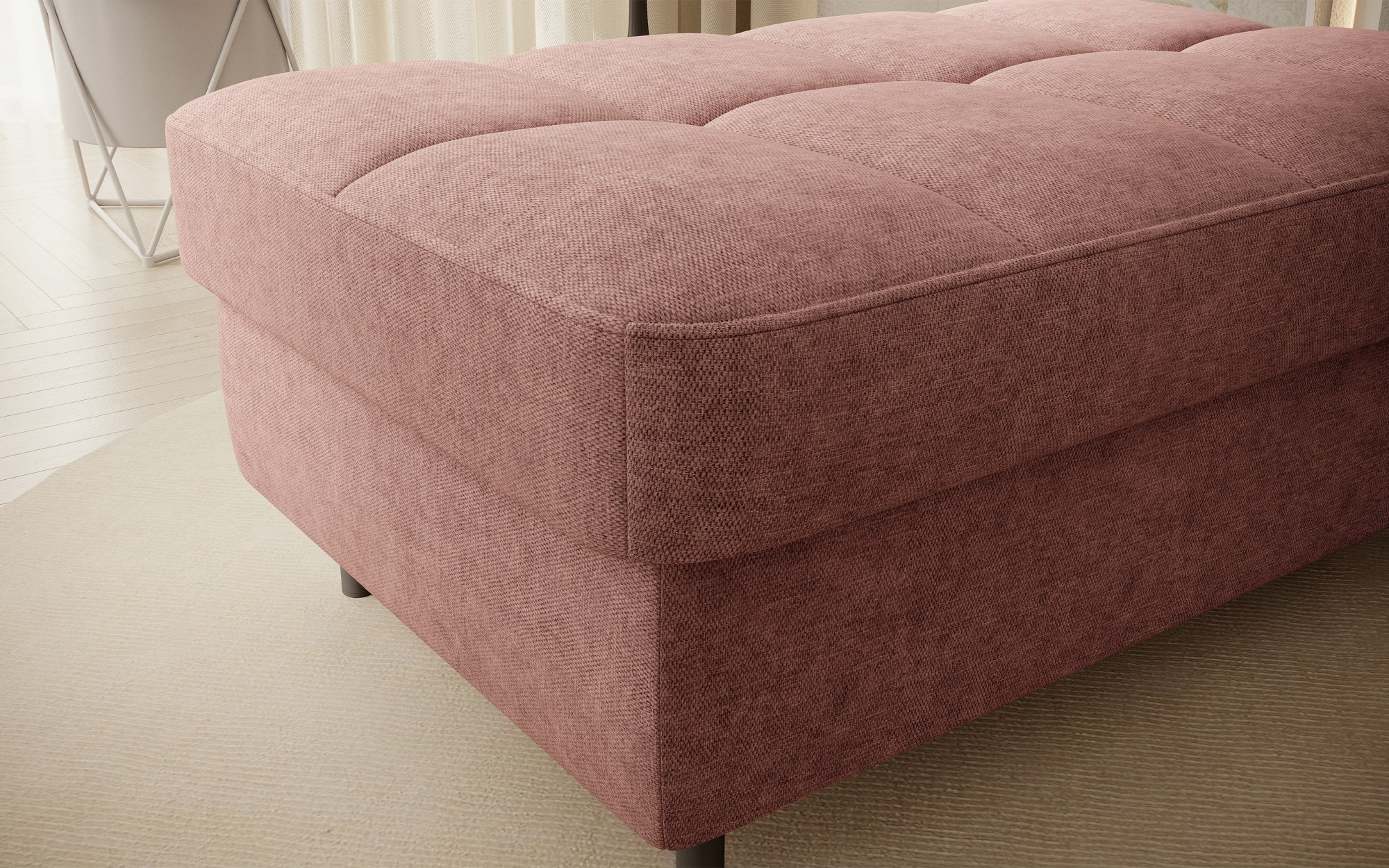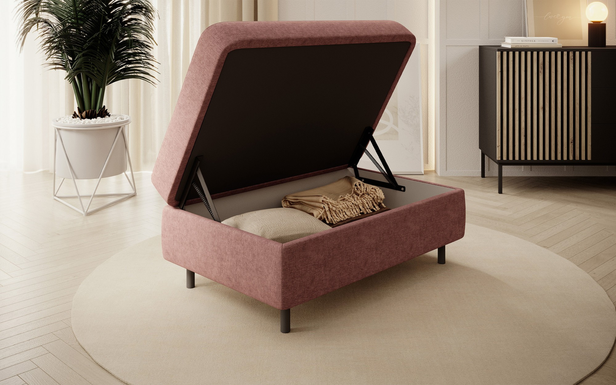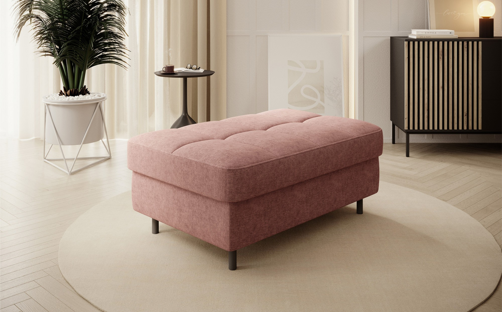 Gomsi puf s rozměry 45 cm (výška) x 72 cm (šířka) x 104 cm (délka) je elegantní a funkční kus nábytku. Taburet má pevné černé kovové nohy, které zajišťují stabilitu a dodávají moderní vzhled. Vestavěný úložný prostor na ložní prádlo umožňuje praktické uložení dalších věcí, což z něj činí ideální řešení pro malé prostory, kde se počítá každý centimetr. Pohodlí při používání zajišťují vysoce kvalitní materiály, jako je HR pěna a T2130 pěna, které zaručují komfort a odolnost. Povrchová úprava taburetu je estetická a moderní, což z něj činí ideální doplněk pro různé styly interiérového designu.