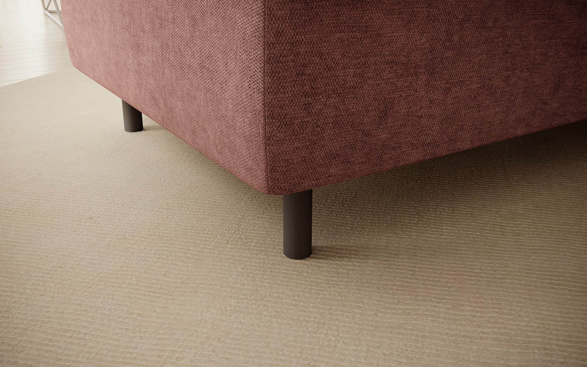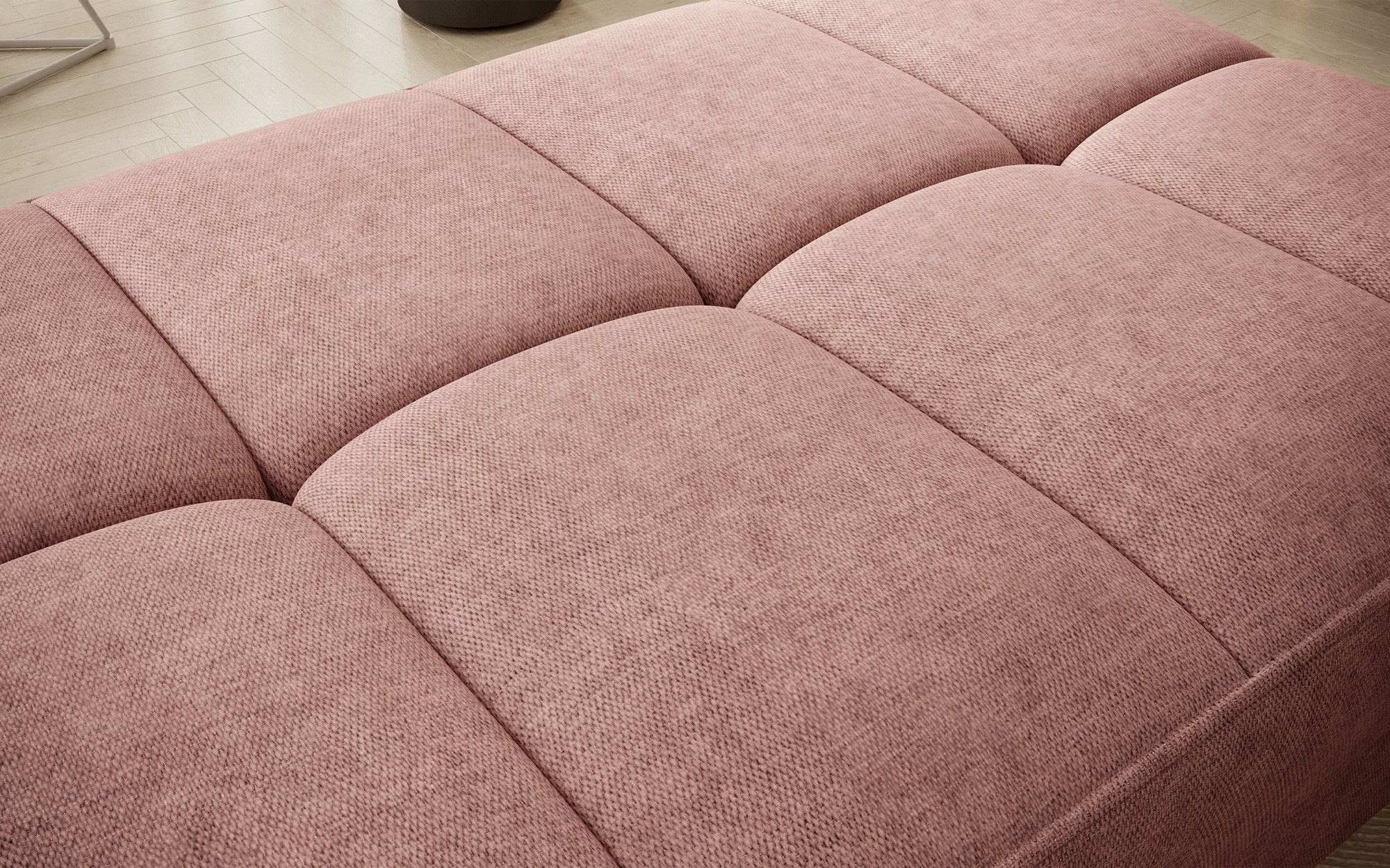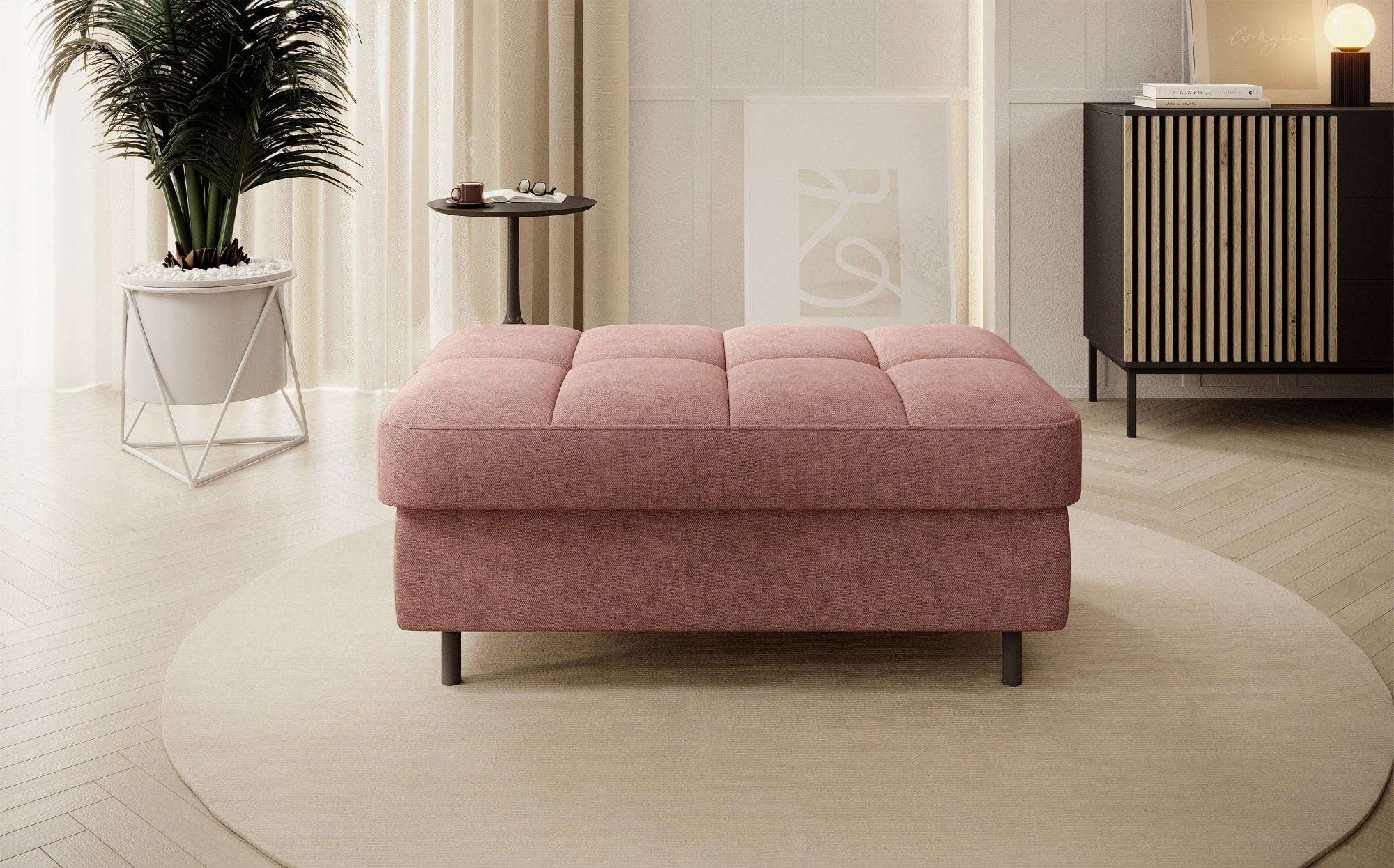 Gomsi puf s rozměry 45 cm (výška) x 72 cm (šířka) x 104 cm (délka) je elegantní a funkční kus nábytku. Taburet má pevné černé kovové nohy, které zajišťují stabilitu a dodávají moderní vzhled. Vestavěný úložný prostor na ložní prádlo umožňuje praktické uložení dalších věcí, což z něj činí ideální řešení pro malé prostory, kde se počítá každý centimetr. Pohodlí při používání zajišťují vysoce kvalitní materiály, jako je HR pěna a T2130 pěna, které zaručují komfort a odolnost. Povrchová úprava taburetu je estetická a moderní, což z něj činí ideální doplněk pro různé styly interiérového designu.