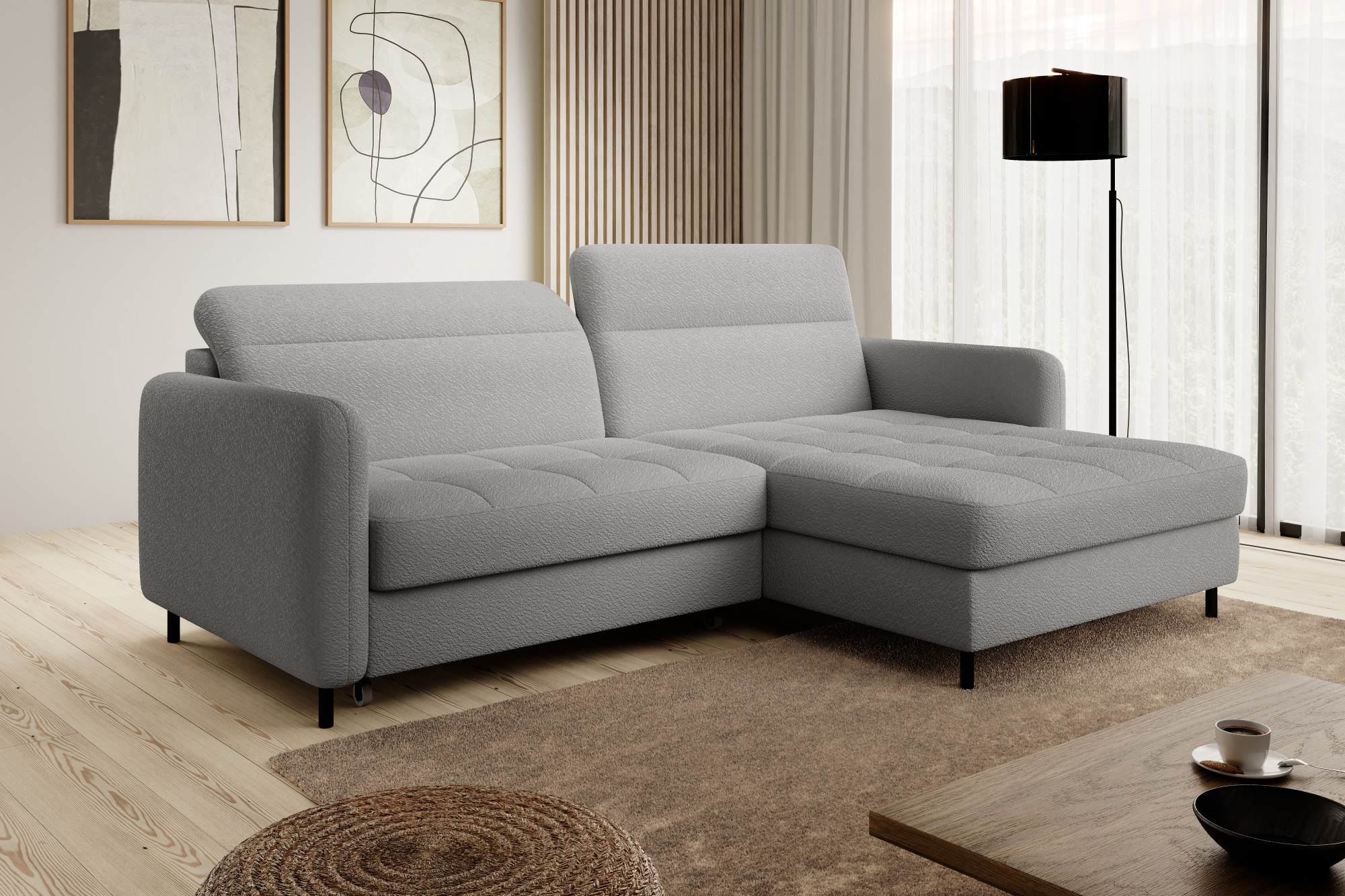 Tato rohová sedací souprava je navržena s ohledem na vaše potřeby. Disponuje praktickým úložným prostorem, který vám umožní snadno uschovat deky, polštáře nebo jiné předměty, které chcete mít po ruce, ale zároveň je mít úhledně uklizené. Rozkládací mechanismus promění sedací soupravu v pohodlné lůžko s plochou na spaní o rozměrech 128 x 200 cm, což je ideální pro hosty nebo pro příležitostné přespání.