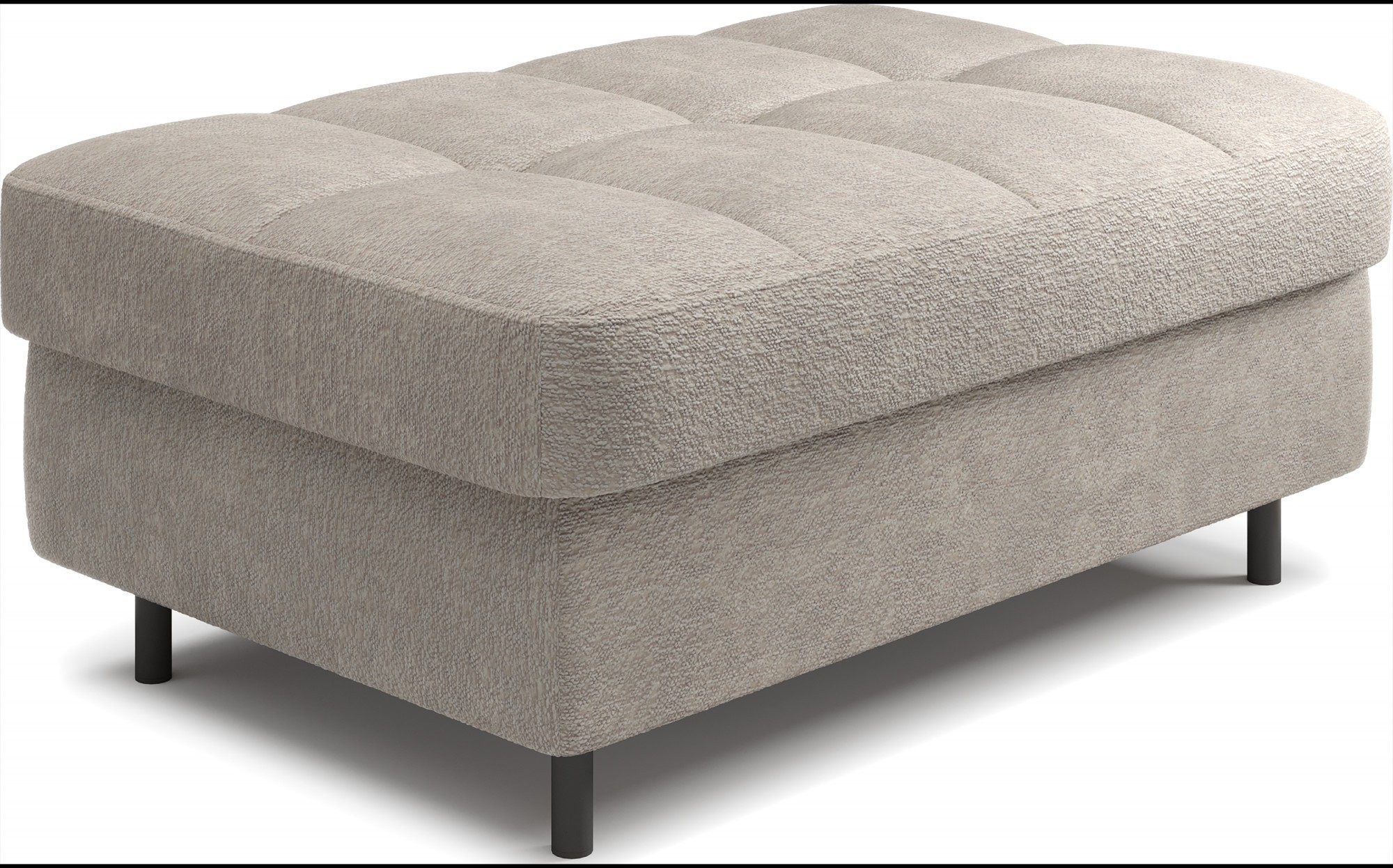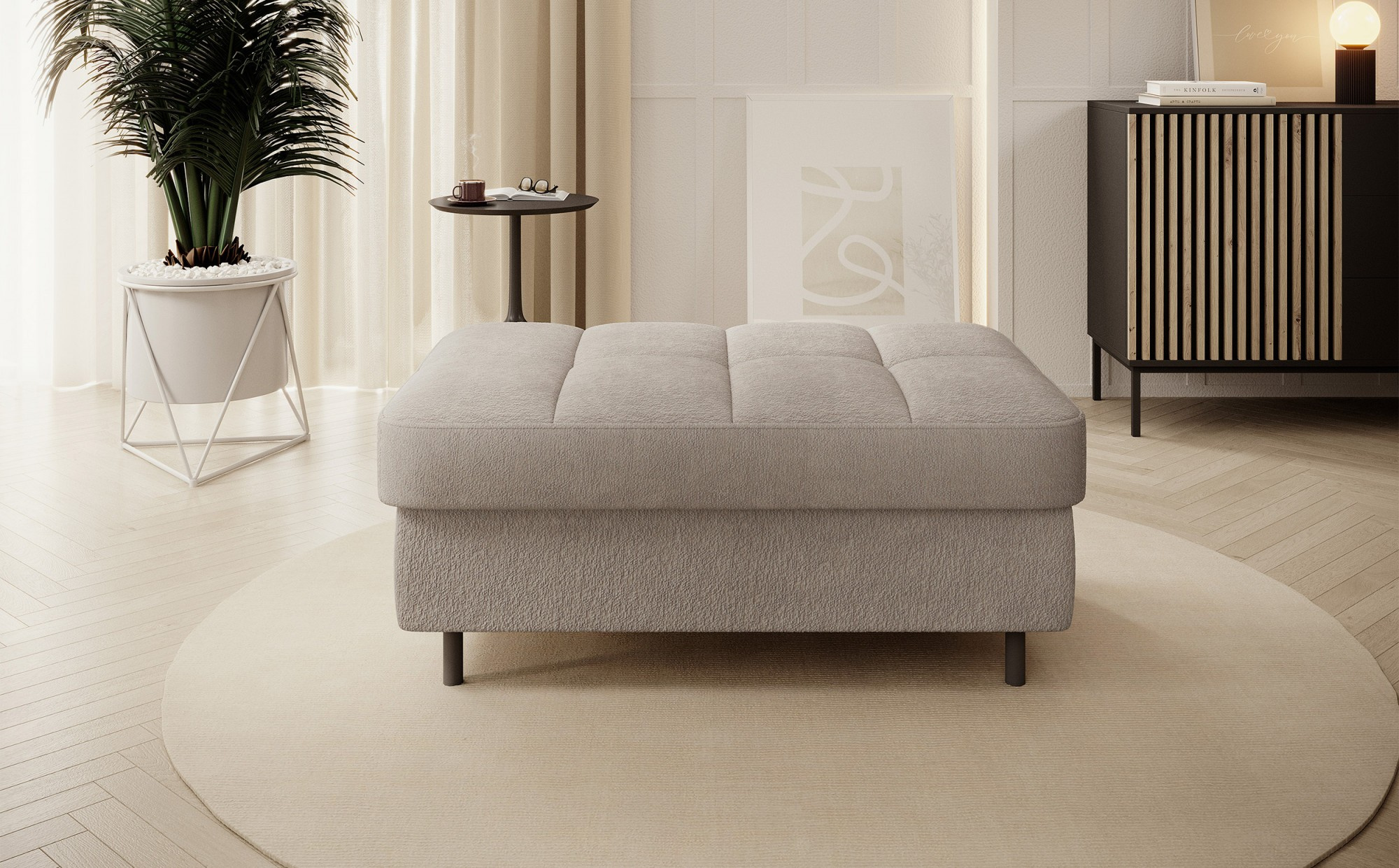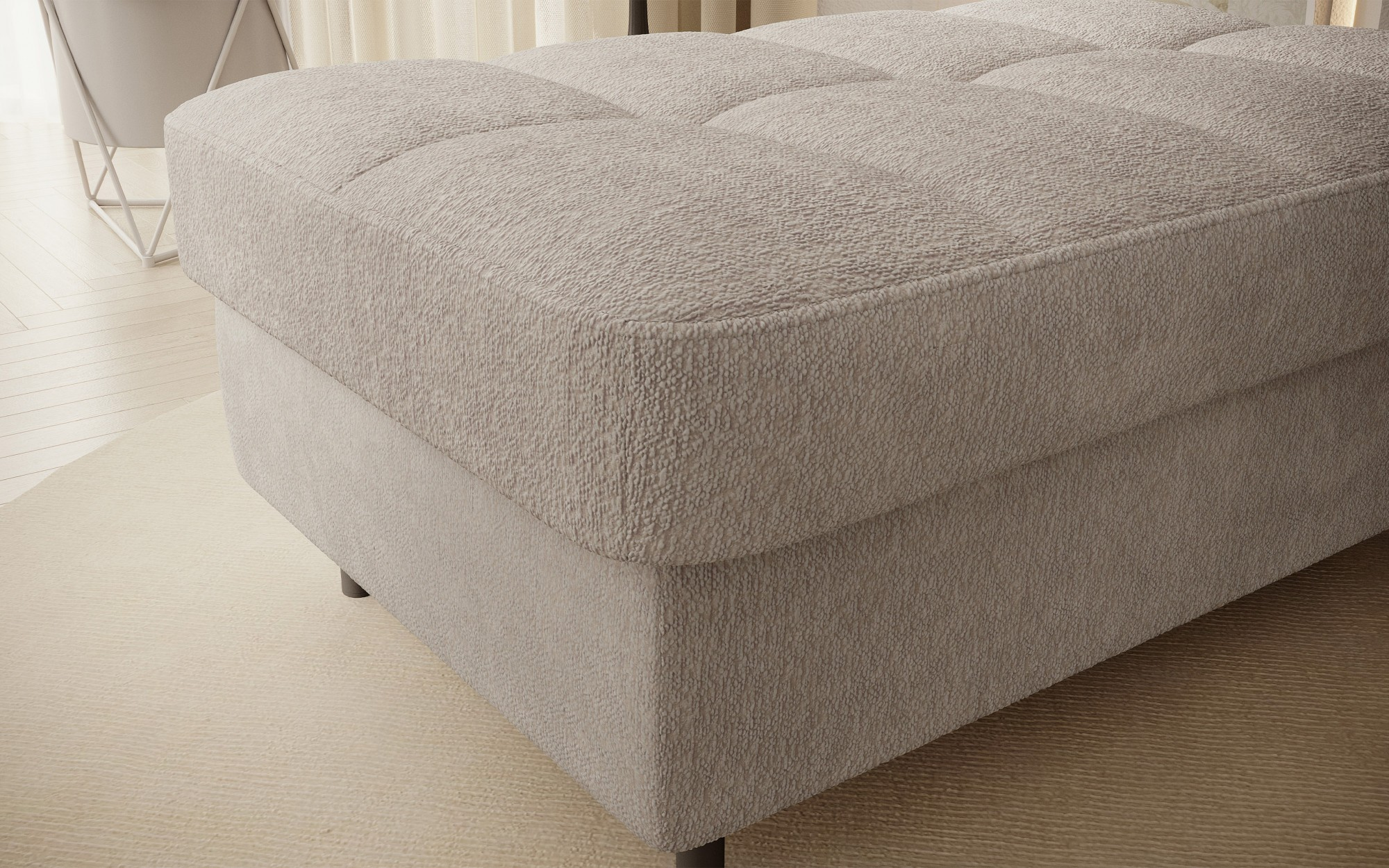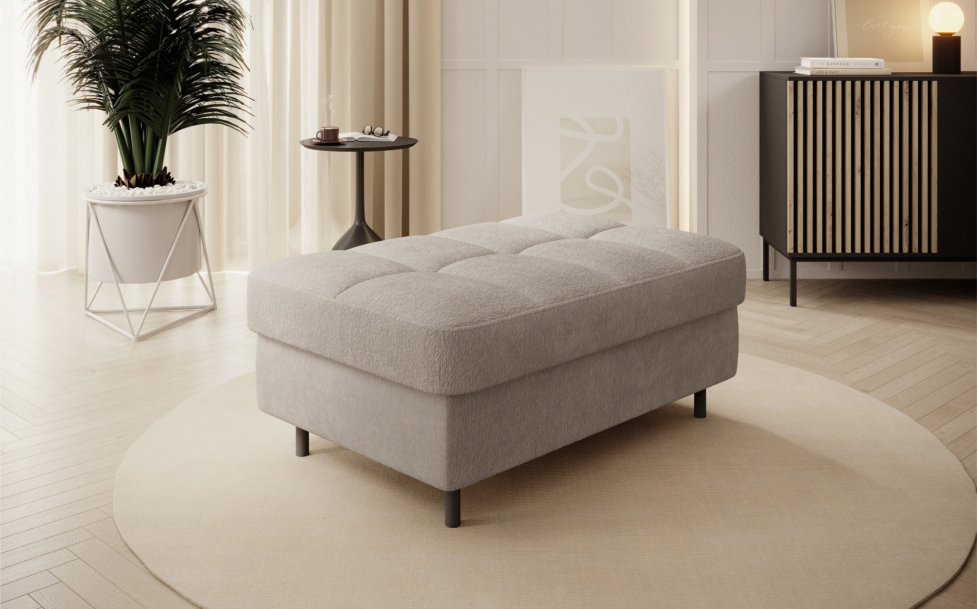 Gomsi puf s rozměry 45 cm (výška) x 72 cm (šířka) x 104 cm (délka) je elegantní a funkční kus nábytku. Taburet má pevné černé kovové nohy, které zajišťují stabilitu a dodávají moderní vzhled. Vestavěný úložný prostor na ložní prádlo umožňuje praktické uložení dalších věcí, což z něj činí ideální řešení pro malé prostory, kde se počítá každý centimetr. Pohodlí při používání zajišťují vysoce kvalitní materiály, jako je HR pěna a T2130 pěna, které zaručují komfort a odolnost. Povrchová úprava taburetu je estetická a moderní, což z něj činí ideální doplněk pro různé styly interiérového designu.
