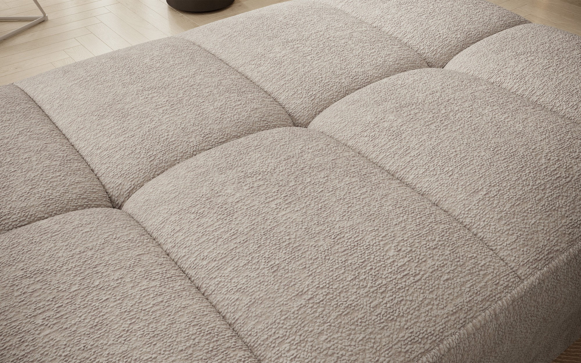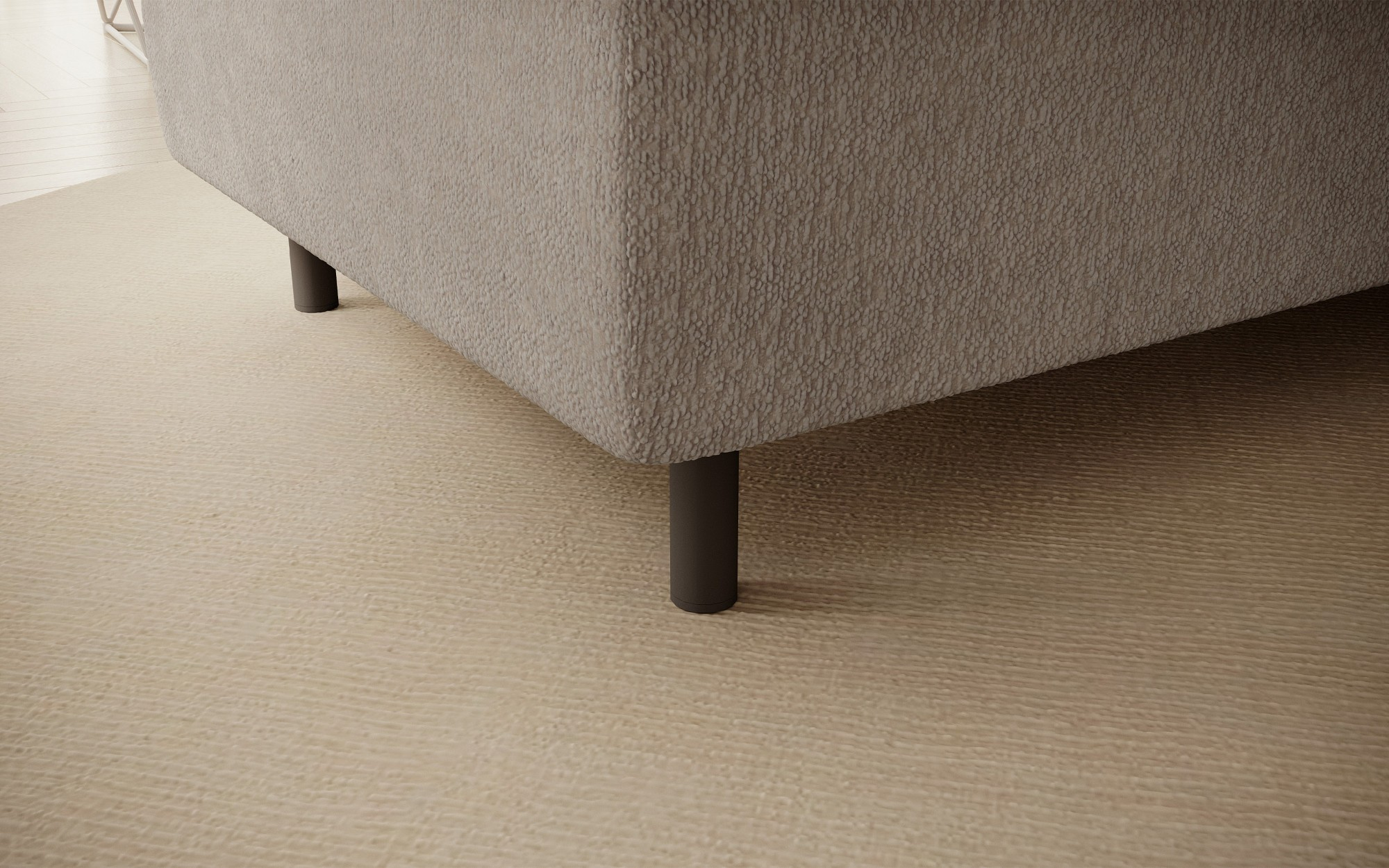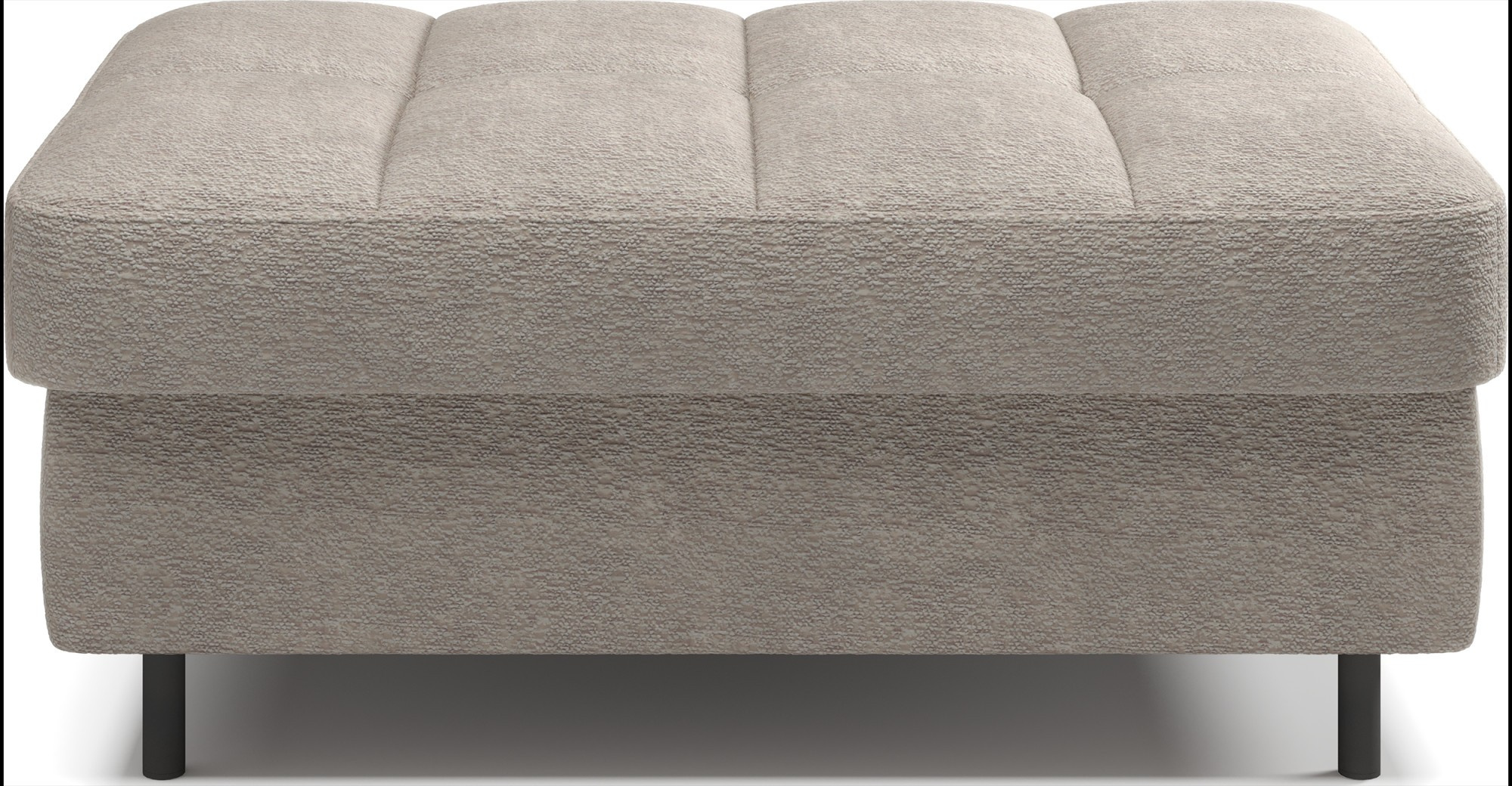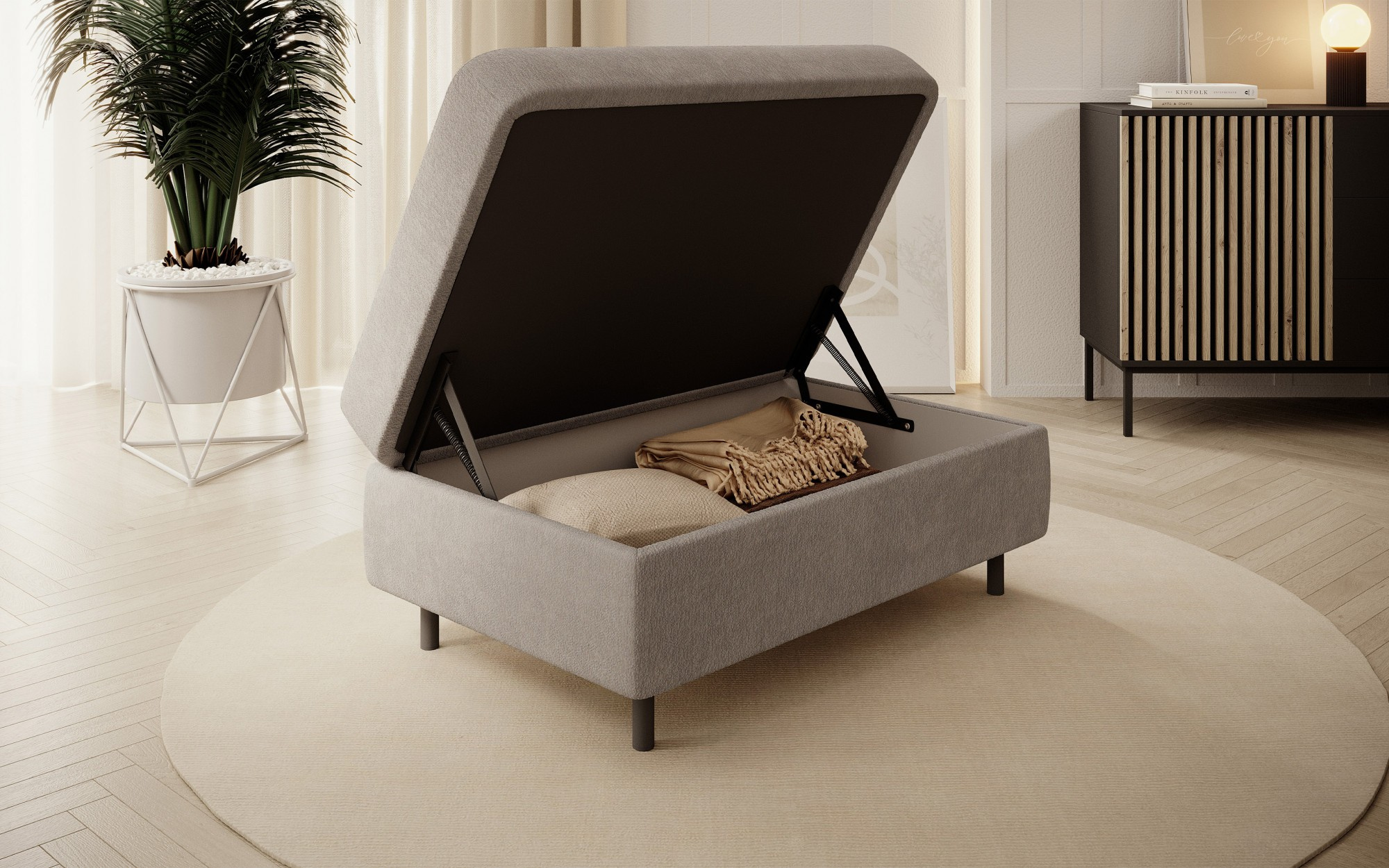 Gomsi puf s rozměry 45 cm (výška) x 72 cm (šířka) x 104 cm (délka) je elegantní a funkční kus nábytku. Taburet má pevné černé kovové nohy, které zajišťují stabilitu a dodávají moderní vzhled. Vestavěný úložný prostor na ložní prádlo umožňuje praktické uložení dalších věcí, což z něj činí ideální řešení pro malé prostory, kde se počítá každý centimetr. Pohodlí při používání zajišťují vysoce kvalitní materiály, jako je HR pěna a T2130 pěna, které zaručují komfort a odolnost. Povrchová úprava taburetu je estetická a moderní, což z něj činí ideální doplněk pro různé styly interiérového designu.