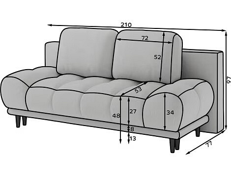 Se šířkou 210 cm, hloubkou 91 cm a výškou 97 cm se pohovka GUAVIO snadno vejde do většiny obývacích pokojů. Výška sedu 48 cm je ideální pro pohodlné vstávání a sezení. Nosnost pohovky je až 250 kg, což zajišťuje bezpečné a pohodlné používání pro celou rodinu.