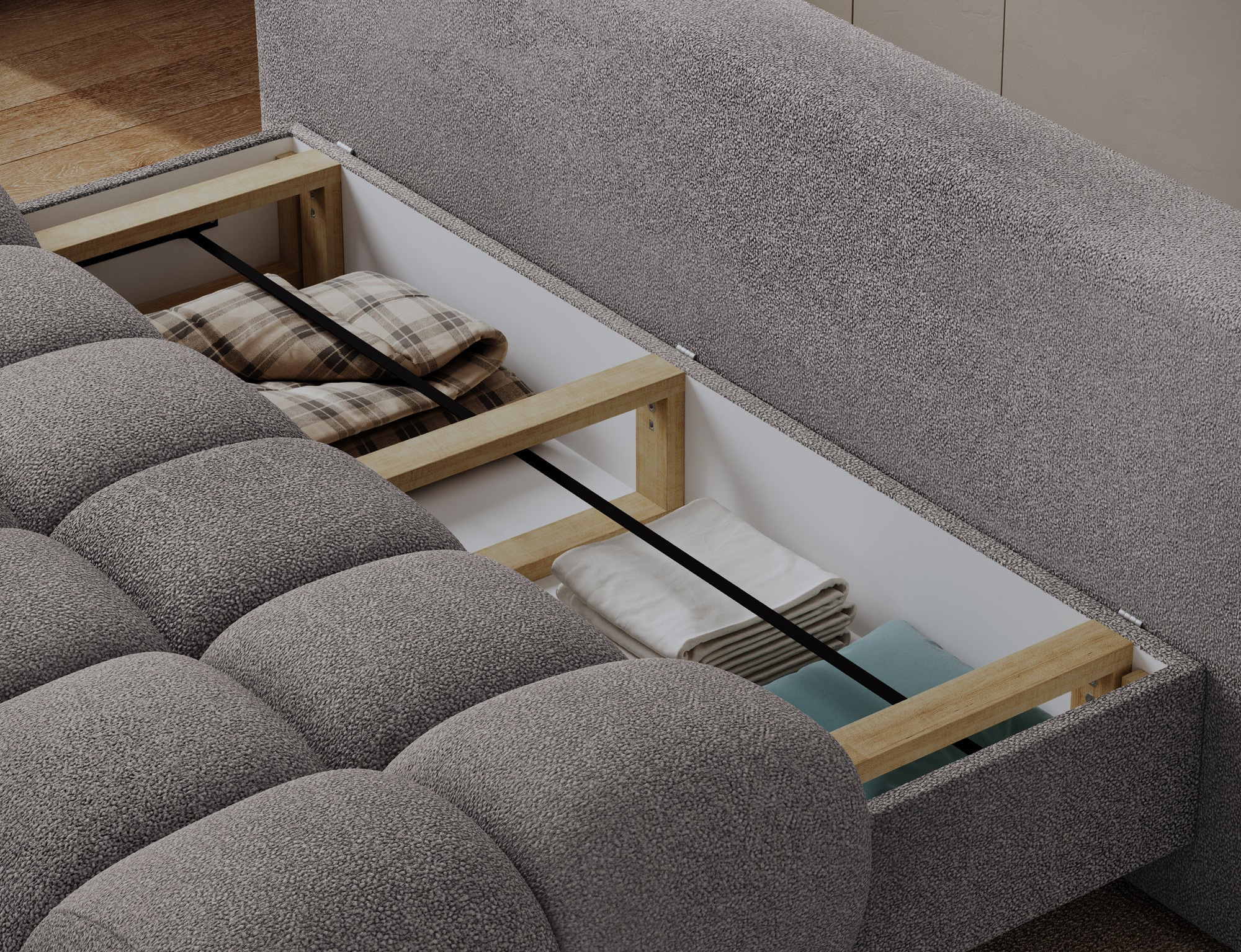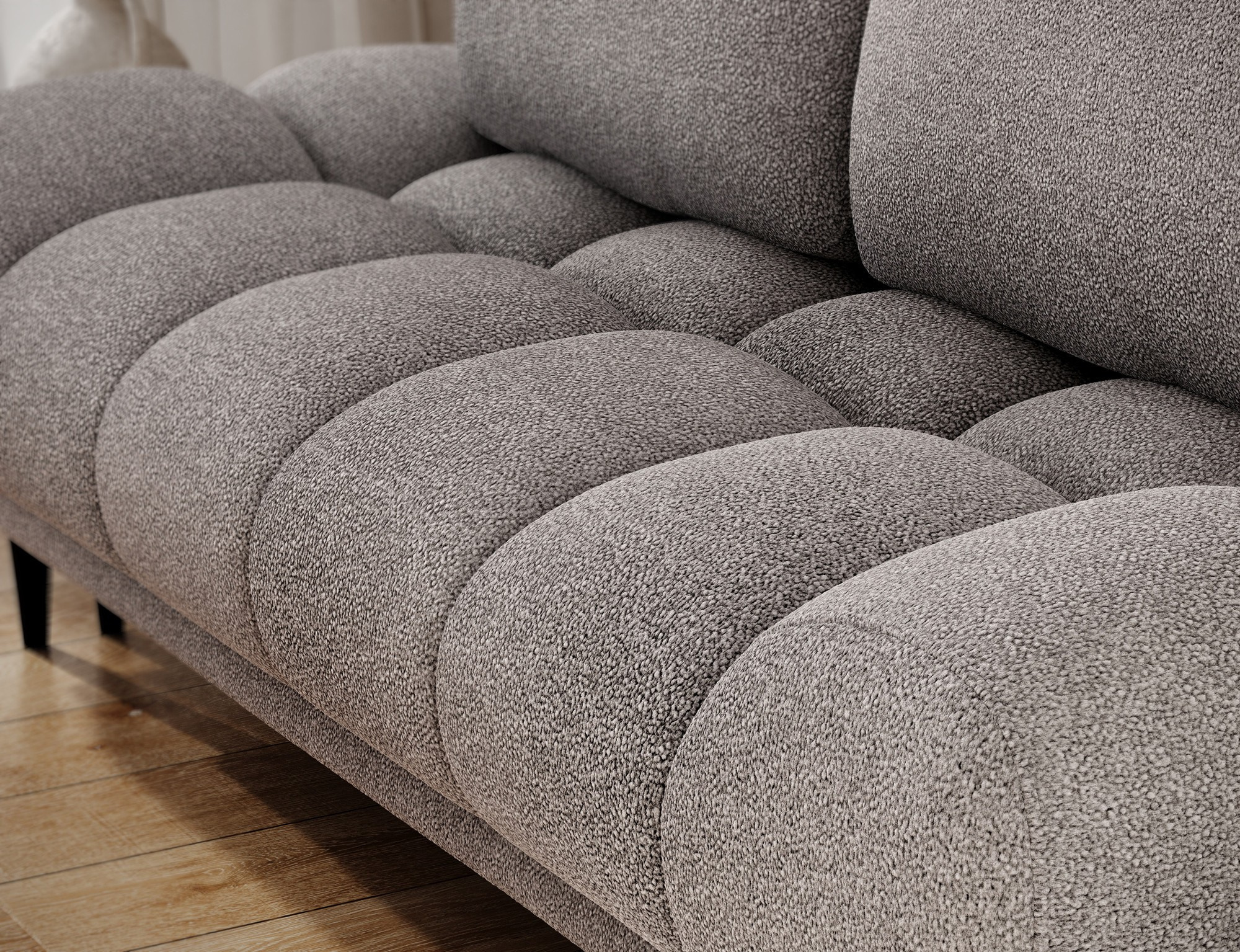 Pohovka je dodávána se dvěma sundávacími opěrnými polštáři, jejichž výplň tvoří polyuretanový granulát. Tyto polštáře nejenže zvyšují komfort, ale také umožňují snadnou údržbu a přizpůsobení vzhledu pohovky podle vašich představ.