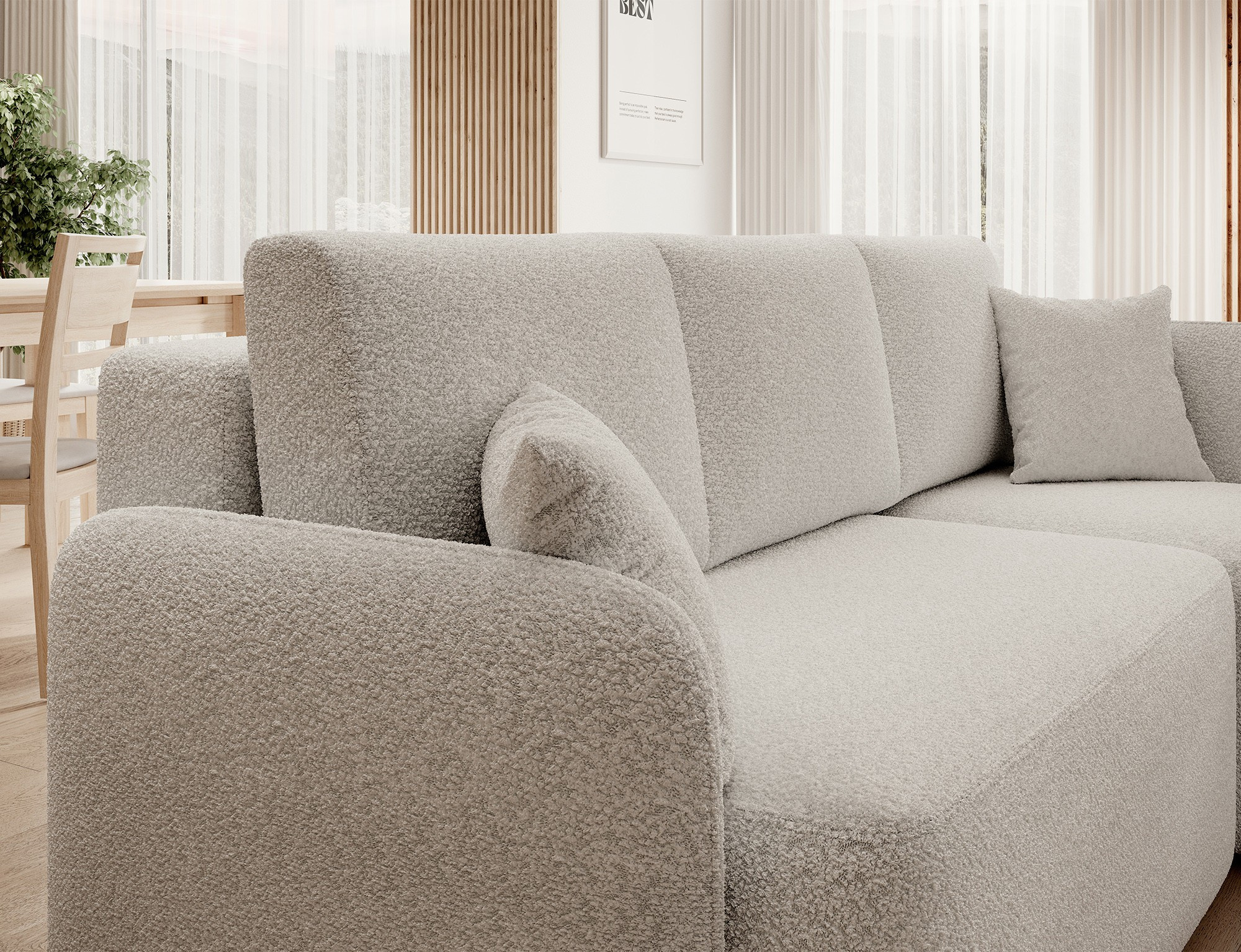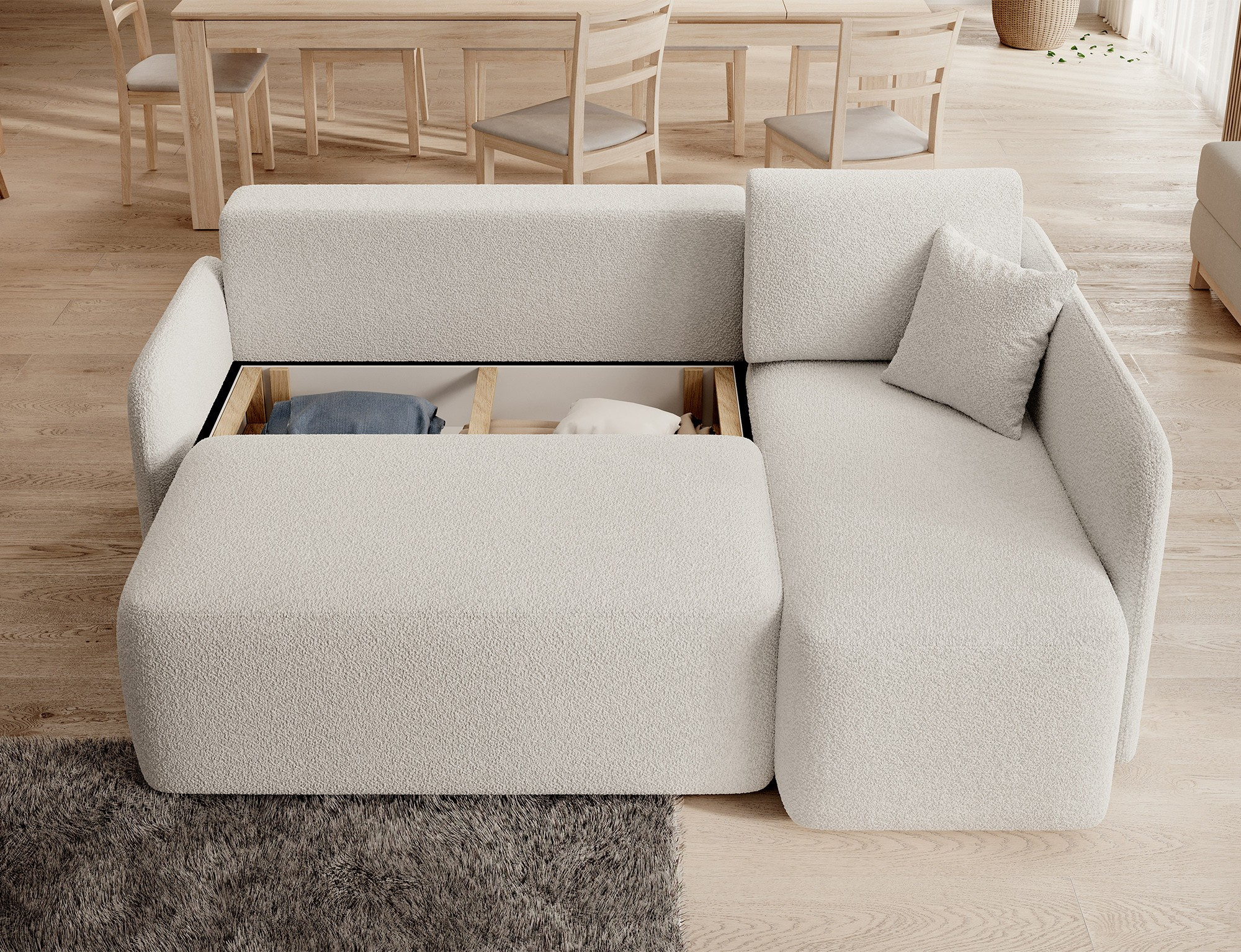 Rohová sedací souprava HADSON je vybavena praktickým úložným prostorem, který vám umožní snadno uschovat deky, polštáře nebo jiné drobnosti, které chcete mít po ruce, ale zároveň je mít úhledně uklizené. Díky této funkci bude váš obývací pokoj vždy vypadat upraveně a organizovaně.