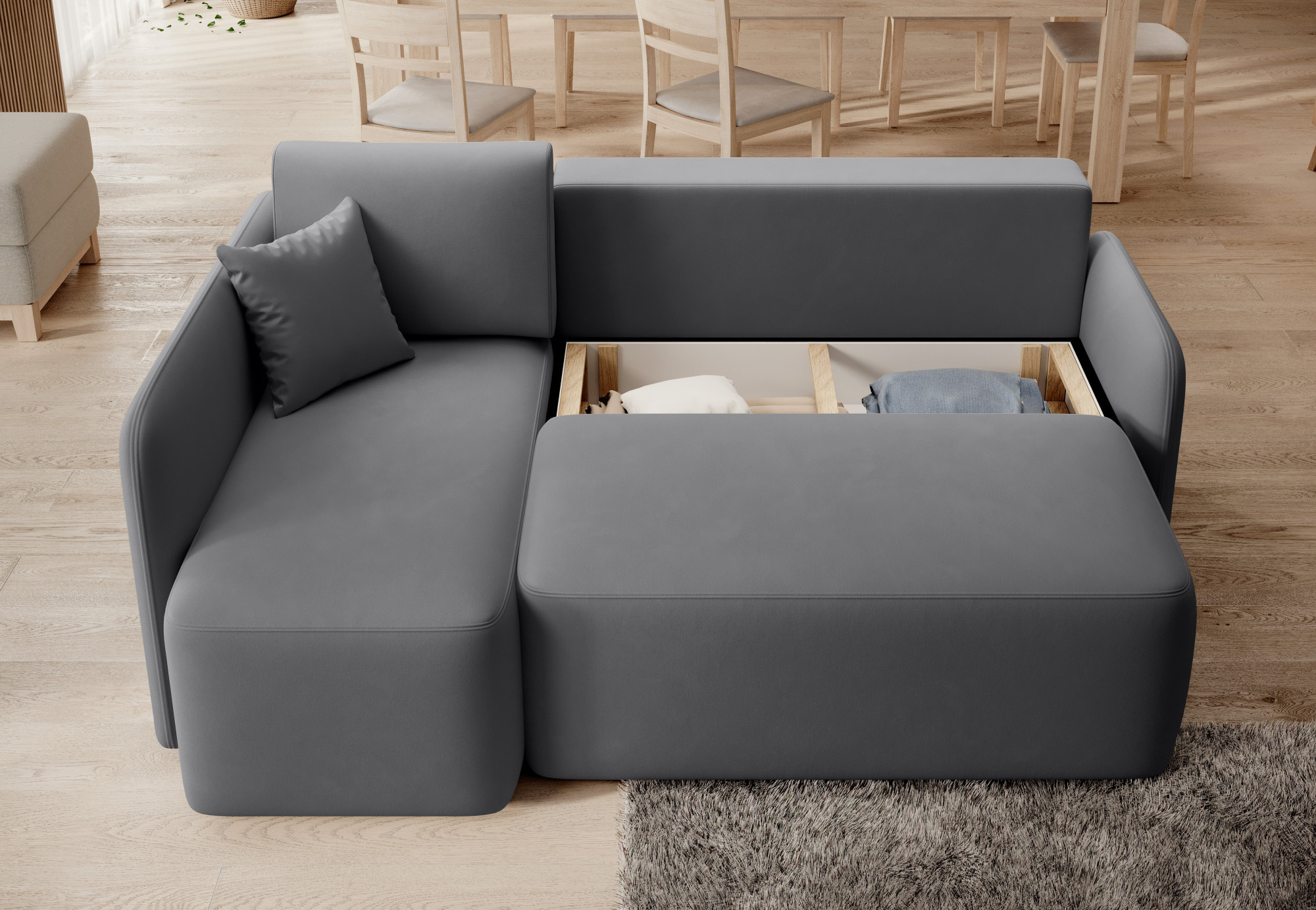 Rohová sedací souprava HADSON je vybavena praktickým úložným prostorem, který vám umožní snadno uschovat deky, polštáře nebo jiné drobnosti, které chcete mít po ruce, ale zároveň je mít úhledně uklizené. Díky této funkci bude váš obývací pokoj vždy vypadat upraveně a organizovaně.