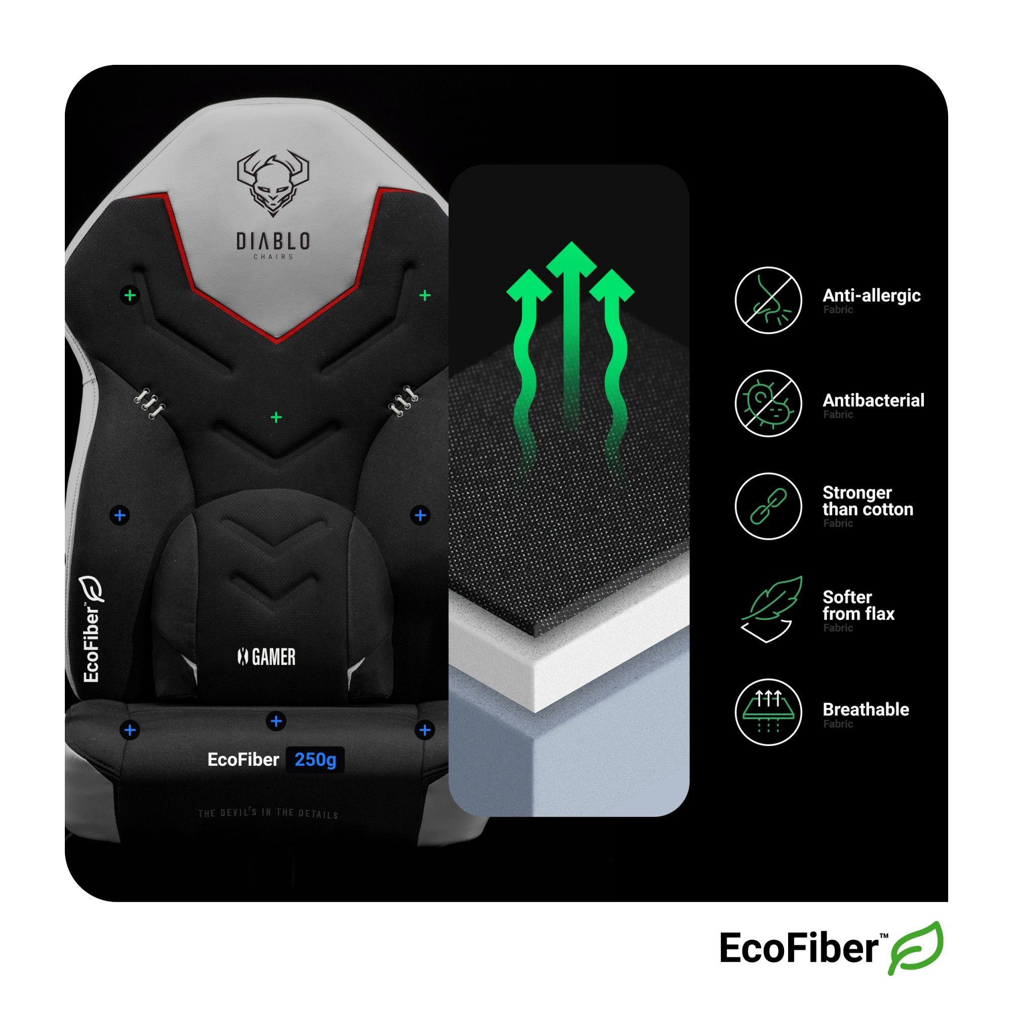 Křeslo je potaženo prodyšnou tkaninou EcoFiber™, která zajišťuje vynikající cirkulaci vzduchu a zabraňuje přehřívání i během horkých letních dnů. Materiál je příjemný na dotek a zároveň odolný proti oděru, takže si křeslo zachová svůj skvělý vzhled po dlouhou dobu.