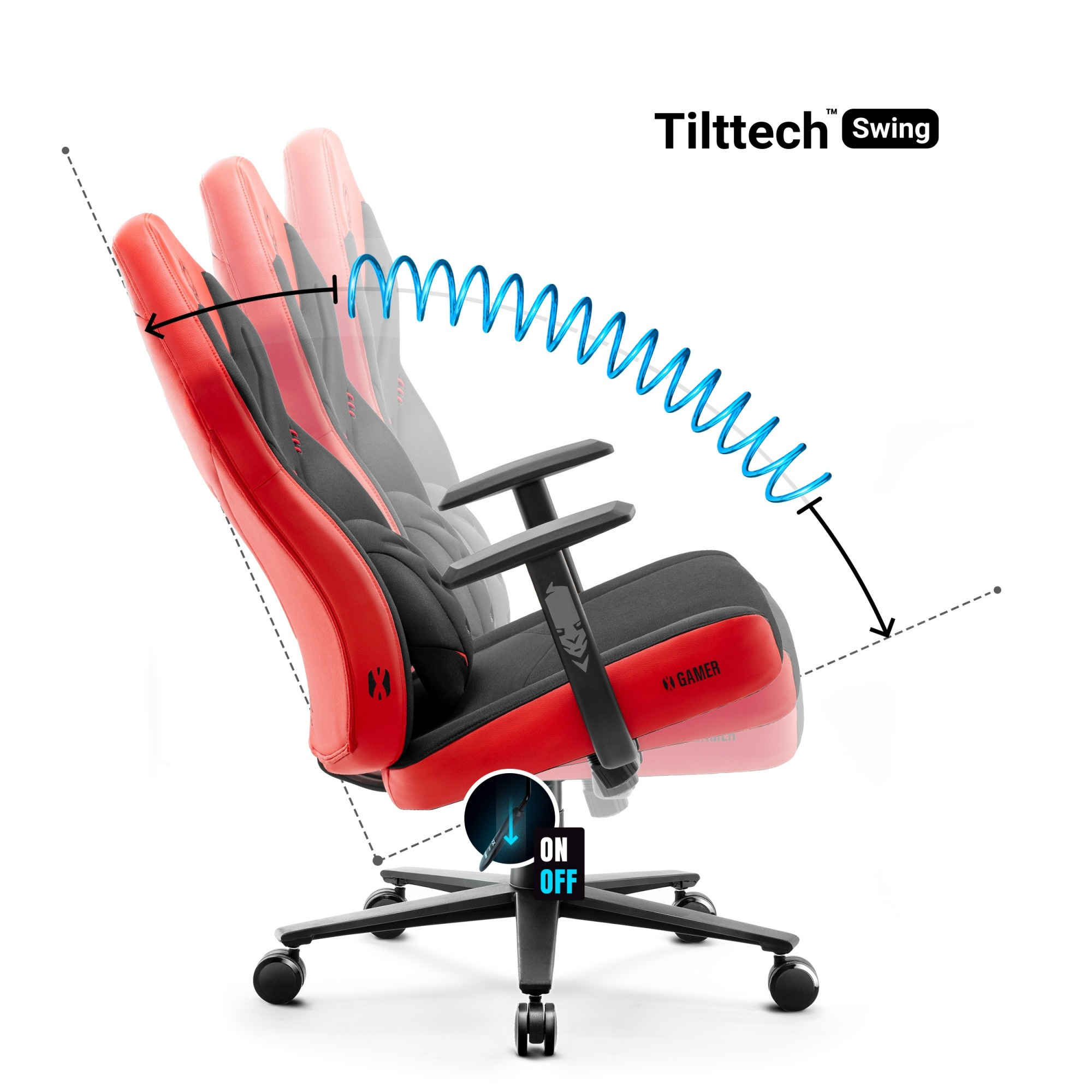 Každý hráč je jedinečný, a proto je důležité, aby se herní křeslo dalo přizpůsobit individuálním potřebám. Systém Tilttech™ Butterfly umožňuje přizpůsobení úrovně sedadla vzhledem k výšce stolu a vaší výšce. Správná regulace vám pomůže zaujmout ergonomickou pozici a zajistí dodatečné pohodlí, i po mnoha hodinách hraní, práce nebo studia. Další funkce Tilttech™ Swing umožňuje relaxační, bezpečné houpání. Snadno nastavíte sílu tlaku potřebnou k naklonění sedadla a opěradla, a přizpůsobení této síly vaší váze vám umožní pohodlně se houpat v křesle. Odchýlí se až do 115°! Uvolněte se a relaxujte po náročném herním dni.