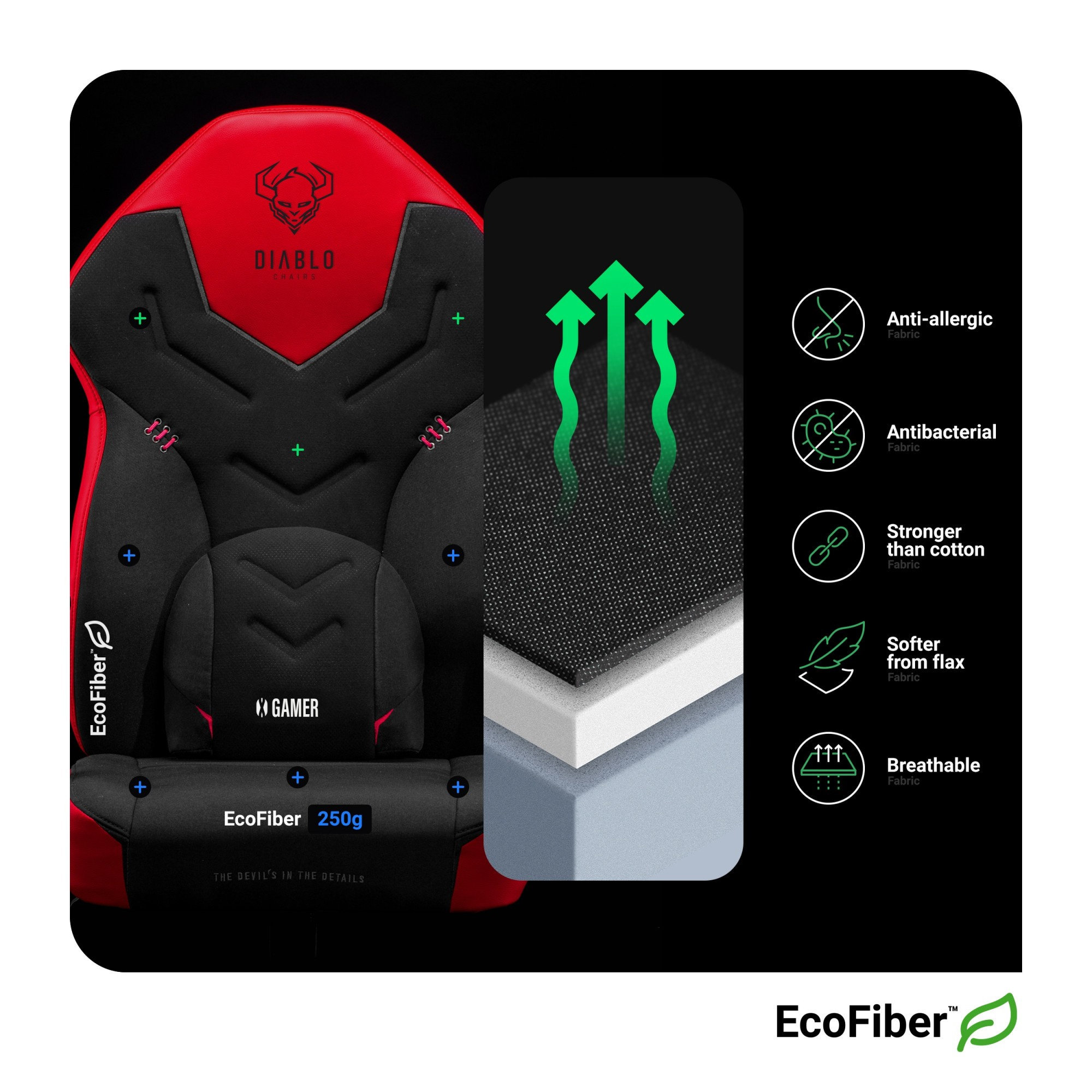 Zapomeňte na nepříjemné pocení a přehřívání. X-GAMER DEEP RED je potaženo mimořádně odolnou tkaninou EcoFiber™. Tato inovativní tkanina je nejen odolná proti oděru, ale také překvapivě prodyšná. Díky tomu vaše nové herní křeslo zajišťuje správnou cirkulaci vzduchu a dokonale chrání vaši postavu před přehřátím. S X-Gamerem bude každá hra pohodlná jako nikdy předtím, a to i během těch nejintenzivnějších herních maratonů.