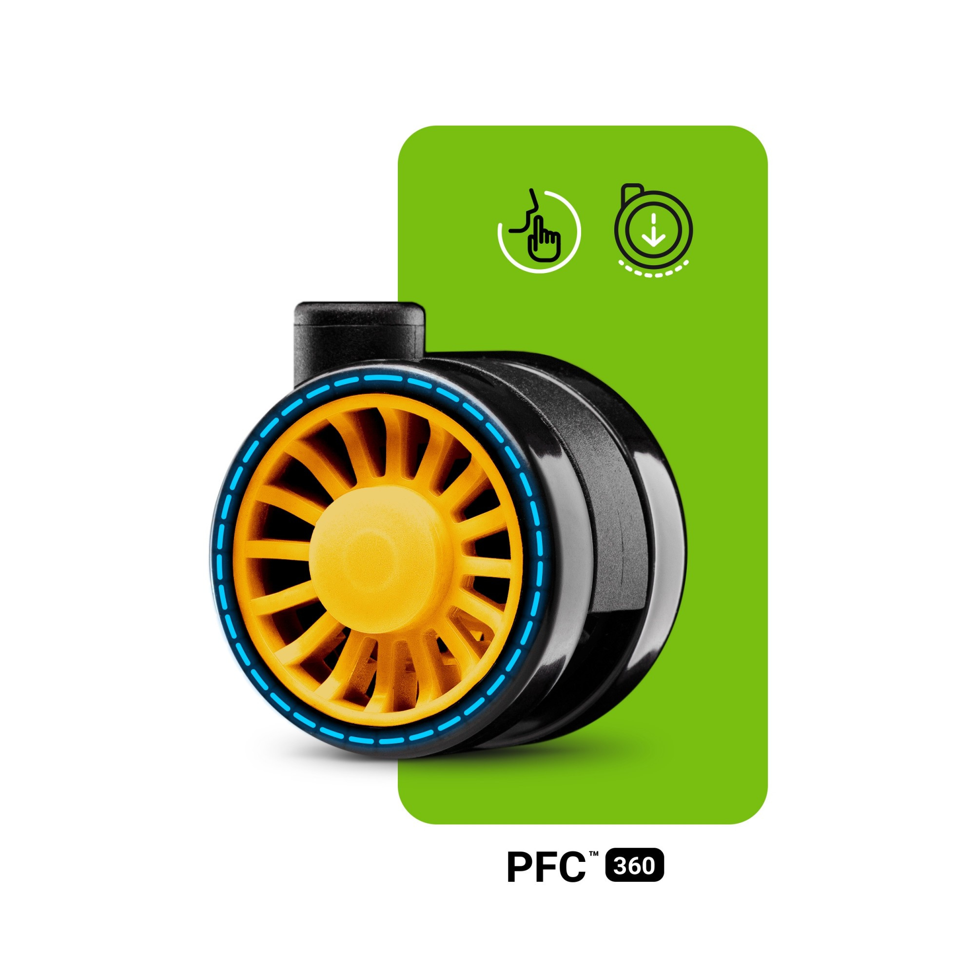- Gumová kolečka PFC™ 360: Gumová kolečka PFC™ 360 o průměru 75 mm chrání povrch podlahy před poškrábáním.