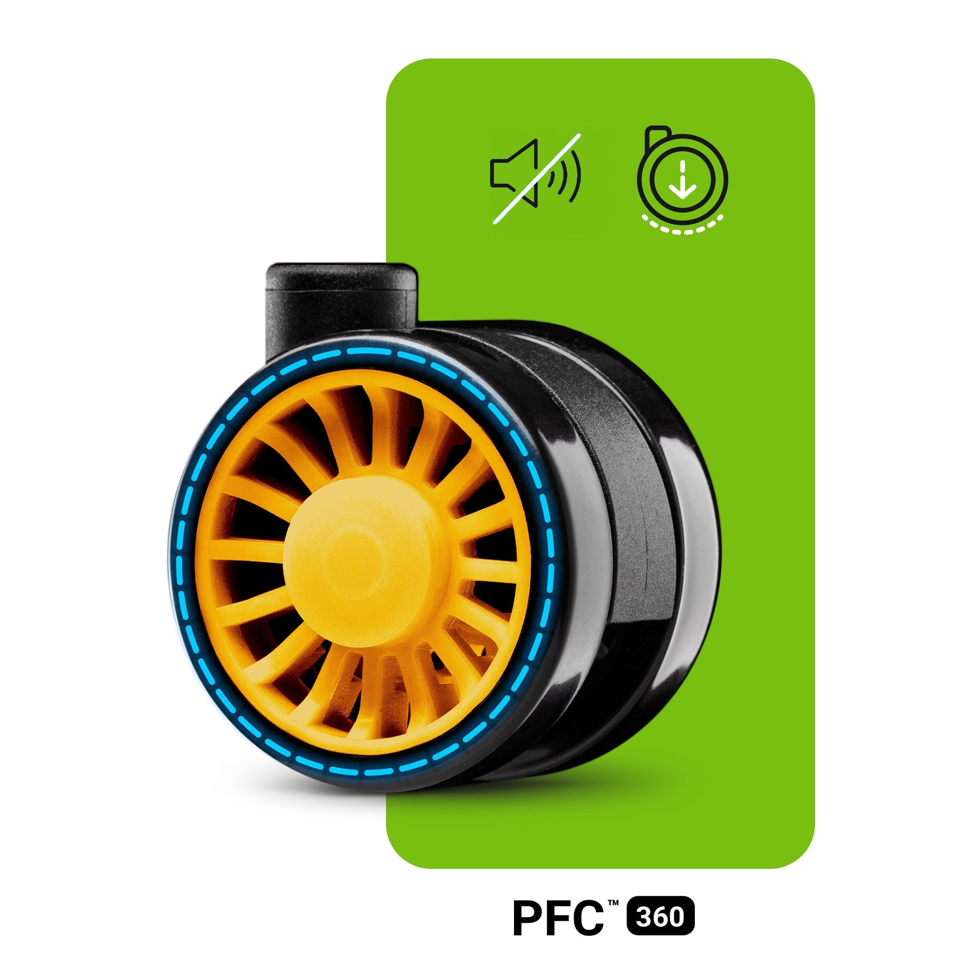 - Kolečka PFC™ 360: Kolečka PFC™ 360 s ráfky a průměrem 65 mm zajišťují plynulý pohyb na jakémkoli povrchu. Kaučukový povlak chrání podlahu před poškrábáním.