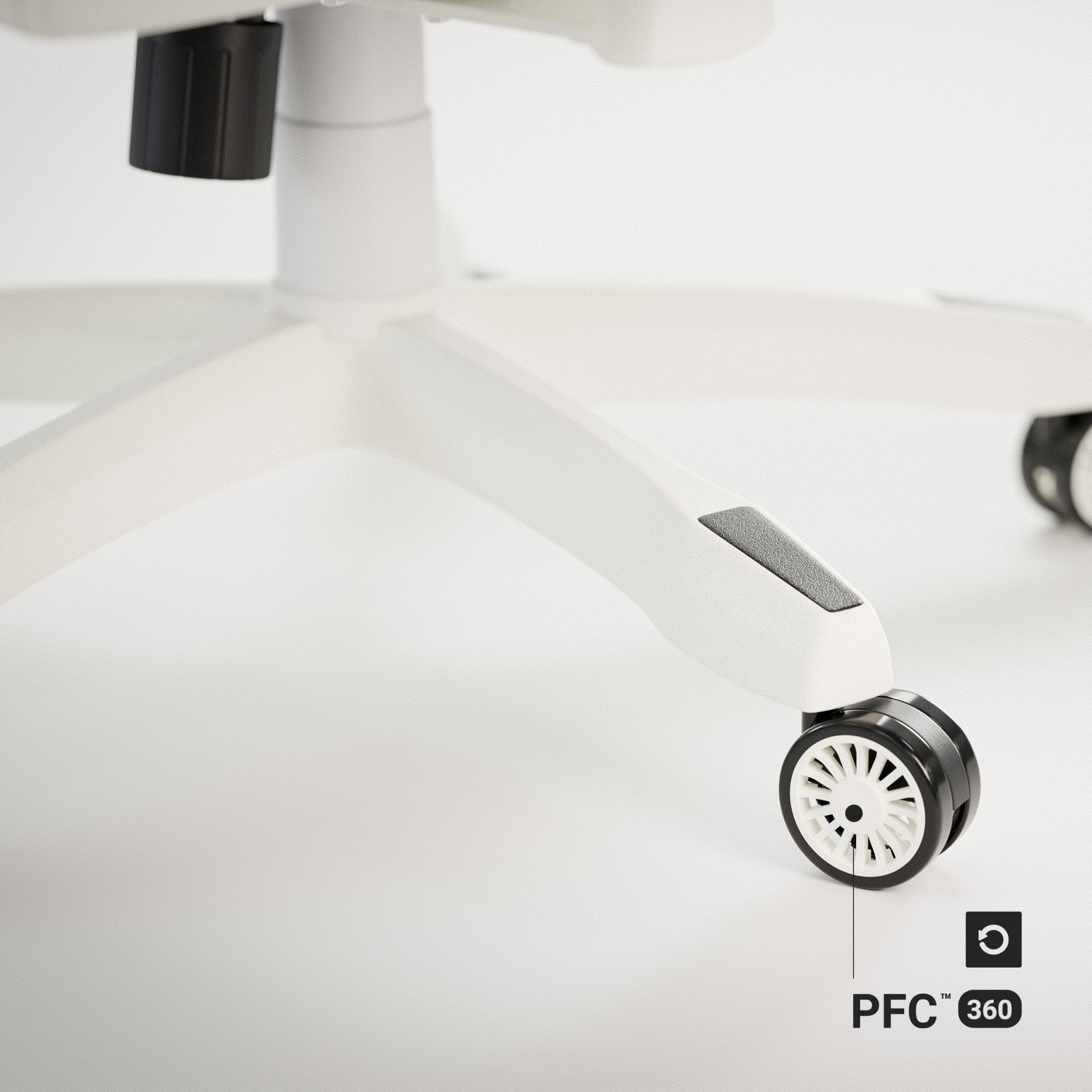 Křeslo je vybaveno gumovými kolečky PFC™ 360, která jsou bezpečná pro každý typ podlahy. Pohybujte se volně po místnosti bez obav z poškrábání podlahy.