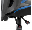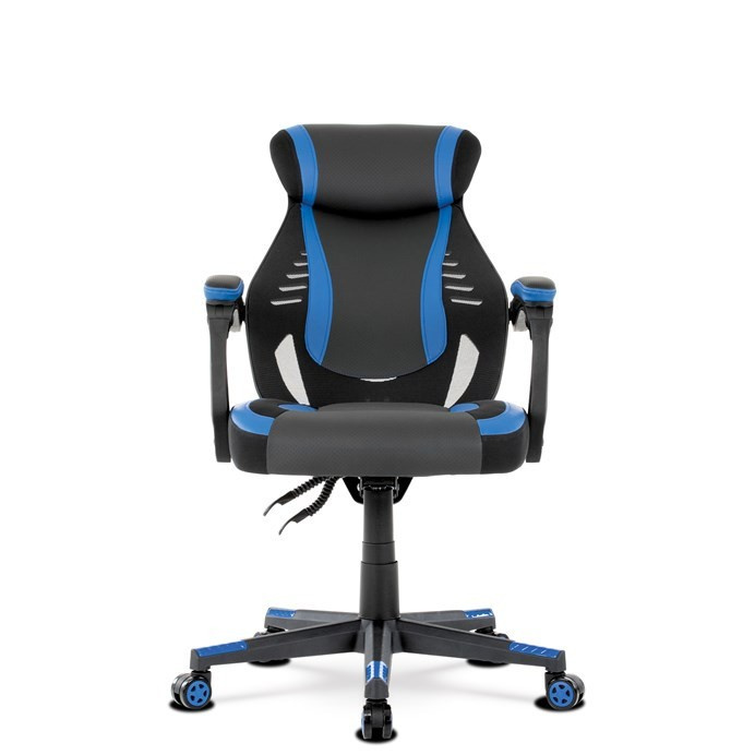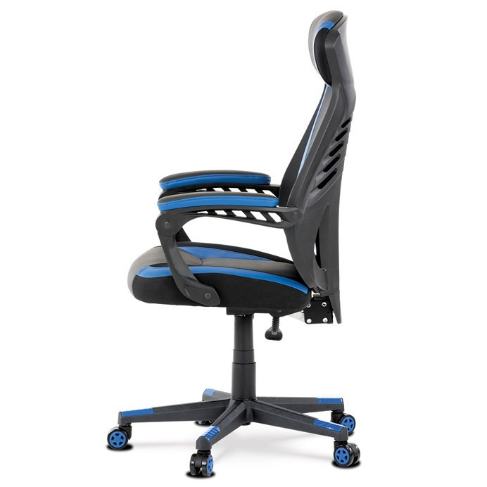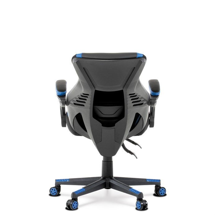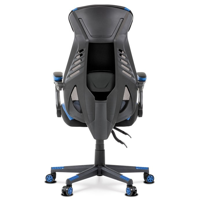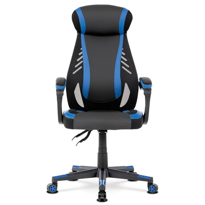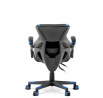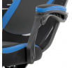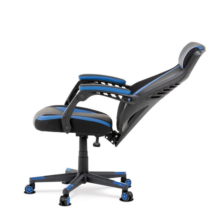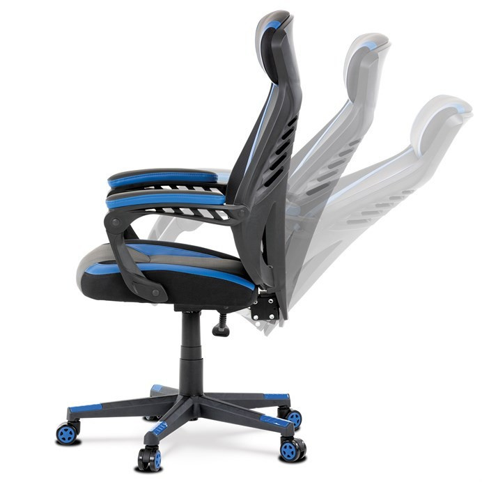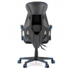 Luxusní herní a kancelářské křeslo z kolekce TOP racing. Jedná se o moderní designové křeslo, navržené nejen pro náročné požadavky PC hráčů, ale je uzpůsobené i pro standardní kancelářskou práci. To vše v maximálním pohodlí a při dokonalé ergonomii sezení. Potah je kombinací modré a černé perforované ekokůže na sedáku i opěráku, černé síťoviny MESH a černé, jemně hrubé látky látky na sedáku i bocích opěrky hlavy. Opěrák je černý plastový výlisek ve futuristickém designu. Výplň sedáku i hlavové opěrky je z velmi kvalitní a tuhé PU pěny, vyztužení a pružnost zajišťují látkové popruhy. Křeslo je vybaveno houpacím mechanismem s plynulou aretací. Při vypnutí je možné se s opěradlem volně pohupovat. Výška sezení se upravuje jednou páčkou na pravé straně přes kvalitní plynový píst. Poloha opěráku se nastavuje druhou páčkou, umístěnou rovněž na pravé straně křesla. Masivní černý plastový kříž s modrými protiskluzovými plastovými doplňky je osazen černými plastovými kolečky pr. 6 cm s modrým racing středem a gumovým obvodem ideálními na tvrdé podlahy. Se stabilitou celých 70 cm průměru kříže si můžete dovolit i ty nejnáročnější hry. Vysoký, prodyšný a ergonomicky navržený opěrák s integrovanou zesílenou opěrkou hlavy, polstrovanou a výškově nastavitelnou bederní opěrkou slouží nejen jako výborná opora celých zad a také podporuje správné držení páteře. Područky jsou plastové, polstrované a potažené modrou a černou ekokůží. Šíře je 7 cm, délka ložné plochy 33 cm a výška 3 cm. Při sklápění sedáku se pohybují a kopírují jeho pohyb a polohu. Nosnost židle je až 130 kg.