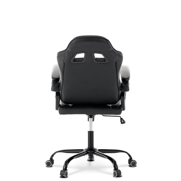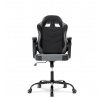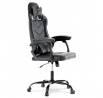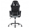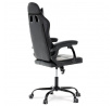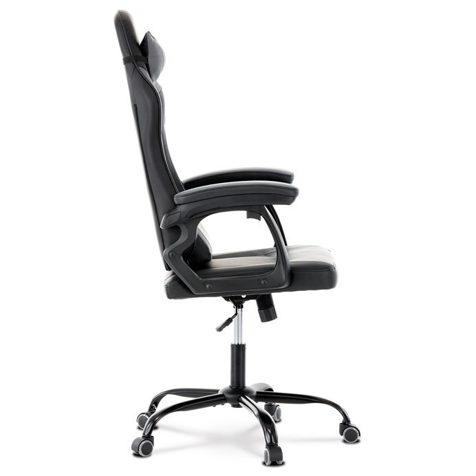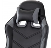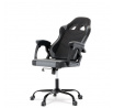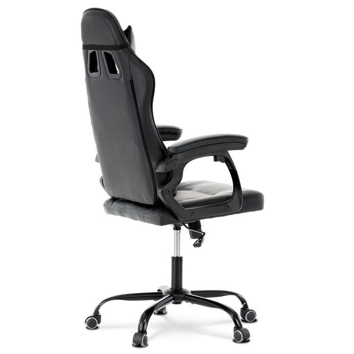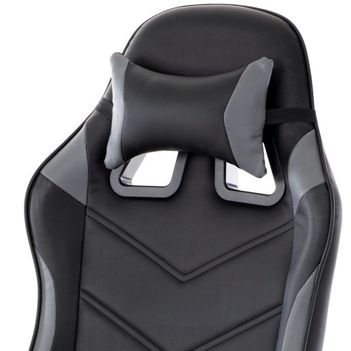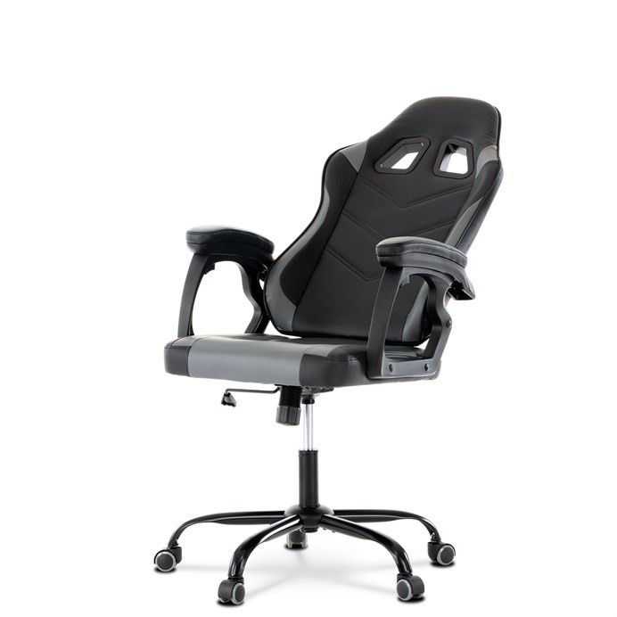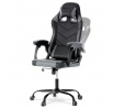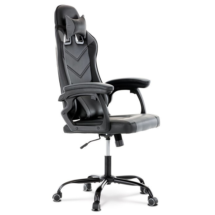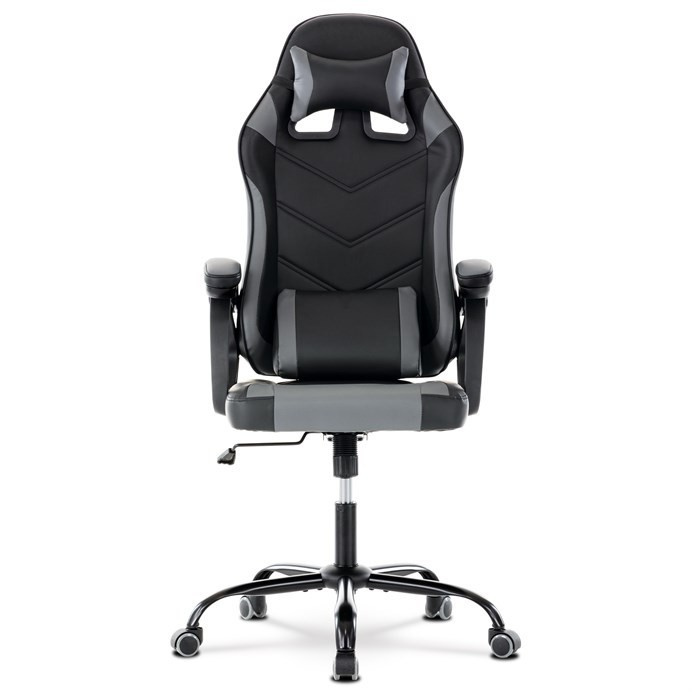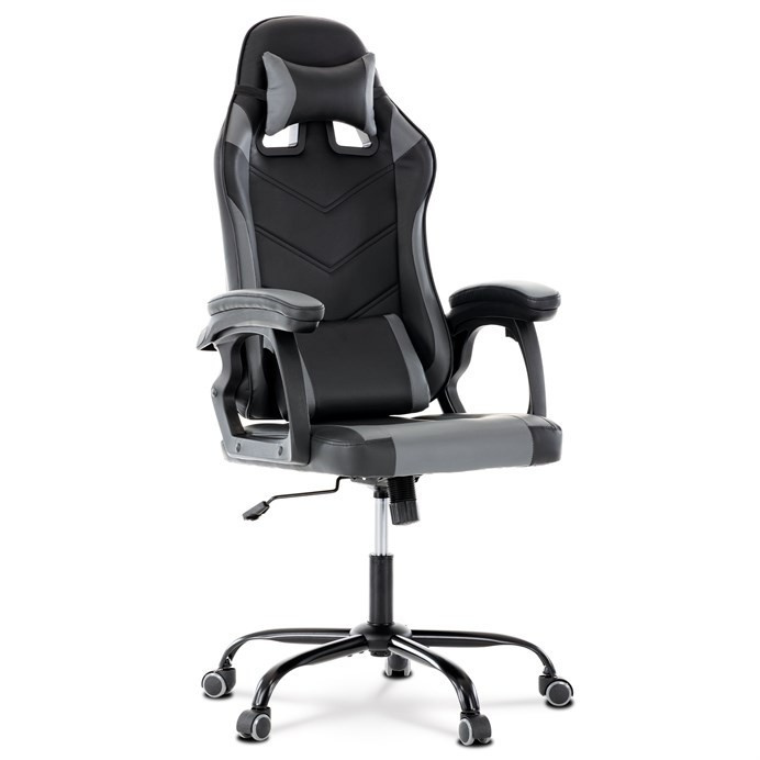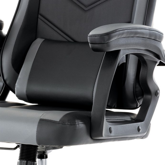 Herní křeslo v kombinaci šedé a černé ekokůže nabízí ergonomicky tvarovaný opěrák s možností houpacího polohování až do úhlu 135°, což umožňuje přizpůsobit pozici sezení podle potřeby. Vrchní část opěráku je vyměkčená pro zvýšení komfortu, doplněná o polstrovanou bederní opěrku a opěrku hlavy, které podporují správné držení těla během dlouhých herních či pracovních sezení. Pevné, čalouněné područky poskytují stabilní oporu rukou, zatímco kovový kříž zajišťuje pevnost a stabilitu celé židle. Výškově nastavitelný sedák umožňuje snadné přizpůsobení výšky sezení individuálním požadavkům uživatele. Celková konstrukce je navržena pro dlouhou životnost a pohodlí při intenzivním používání.