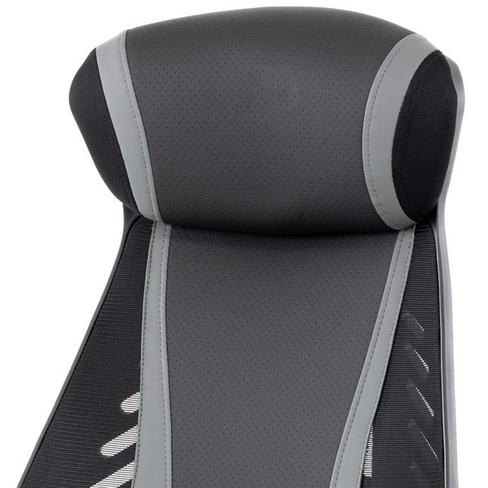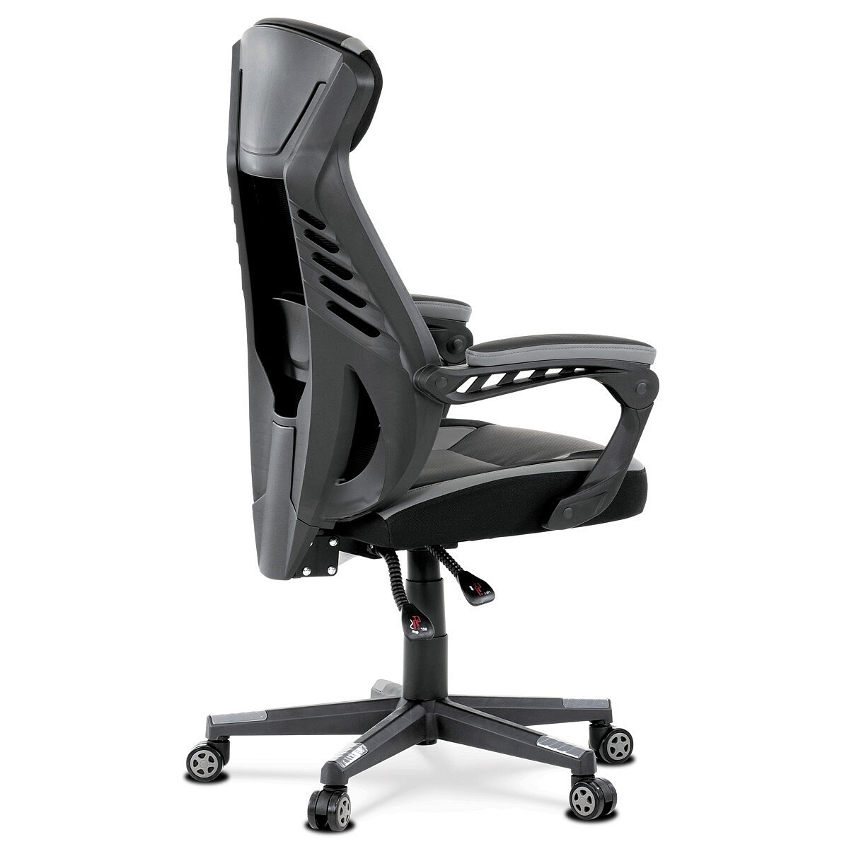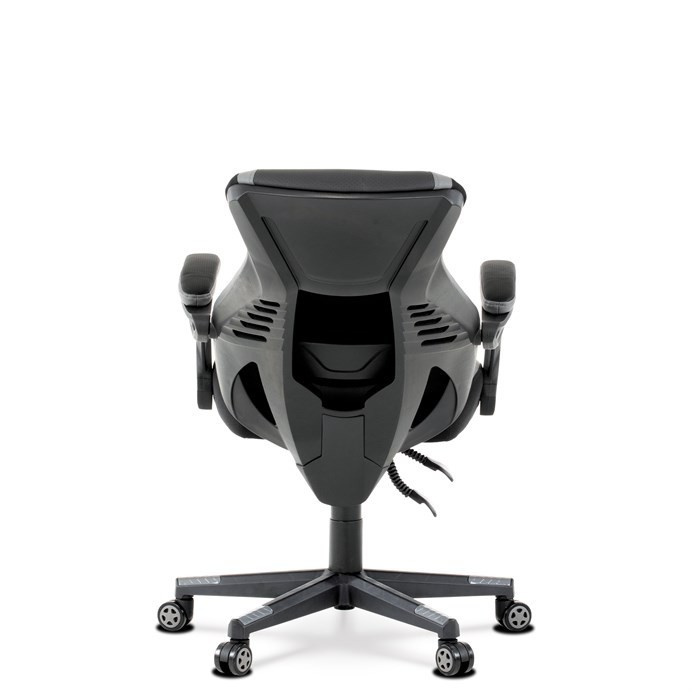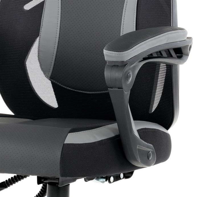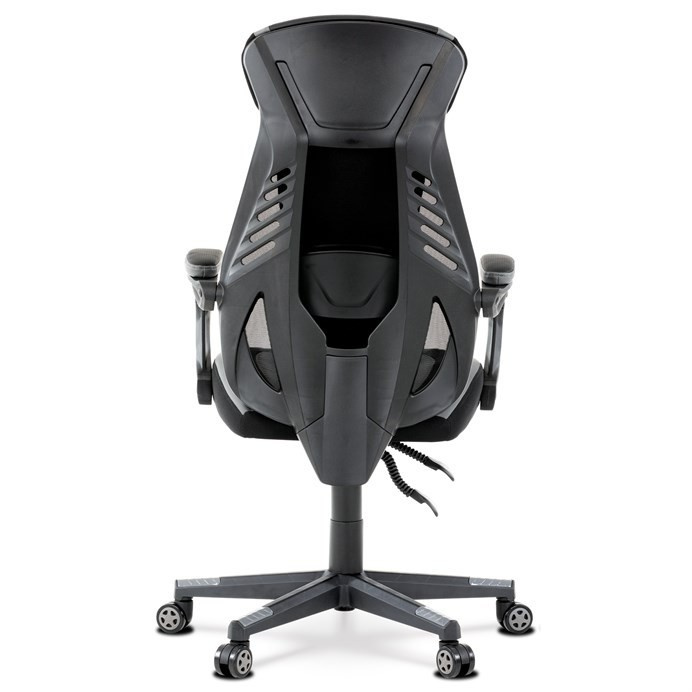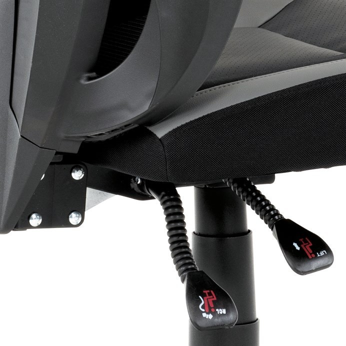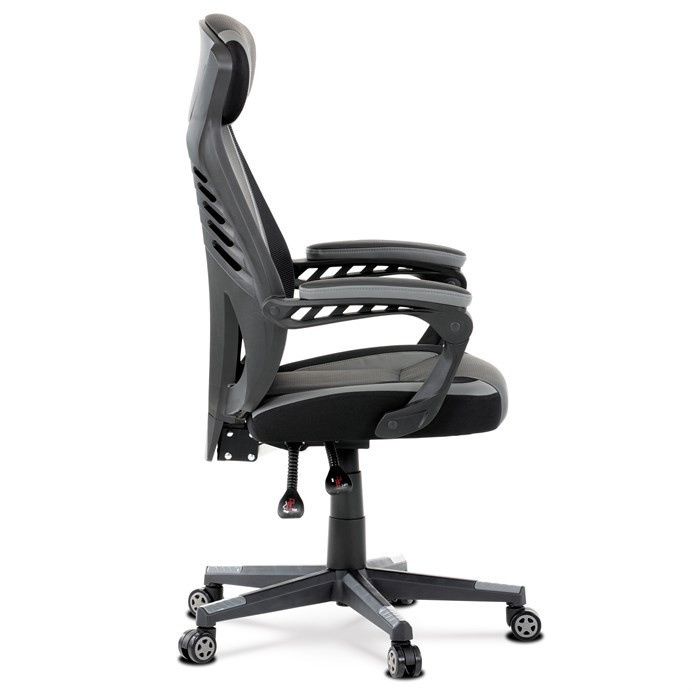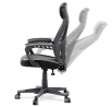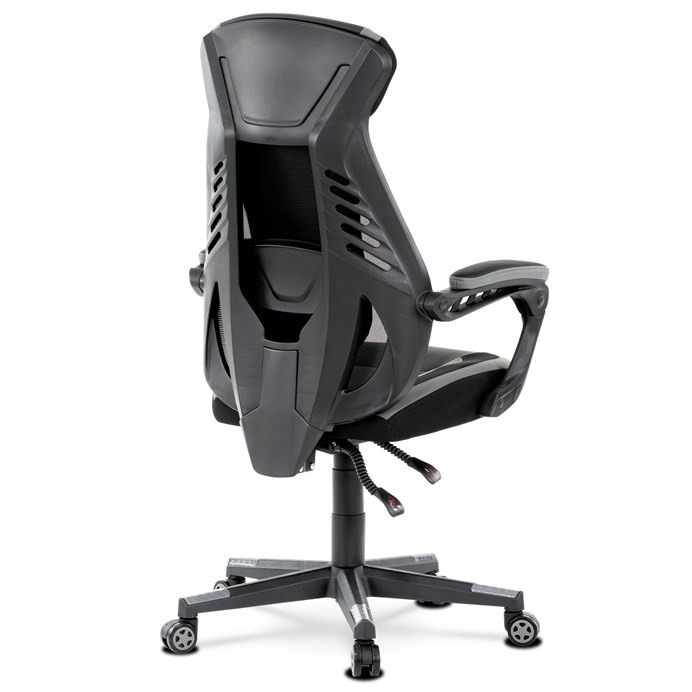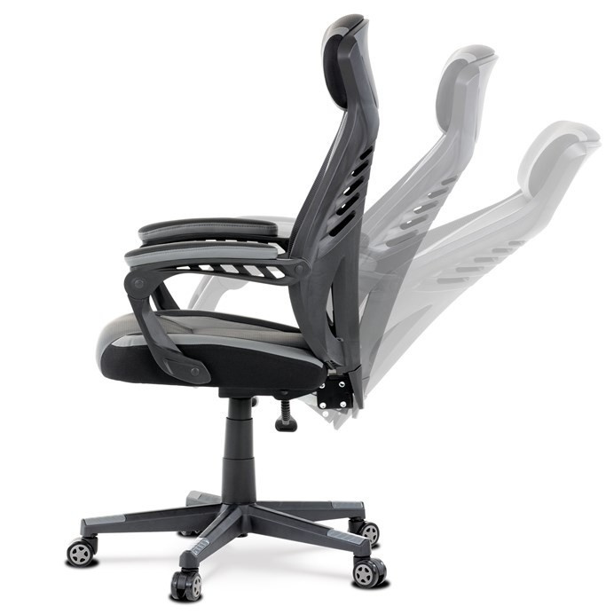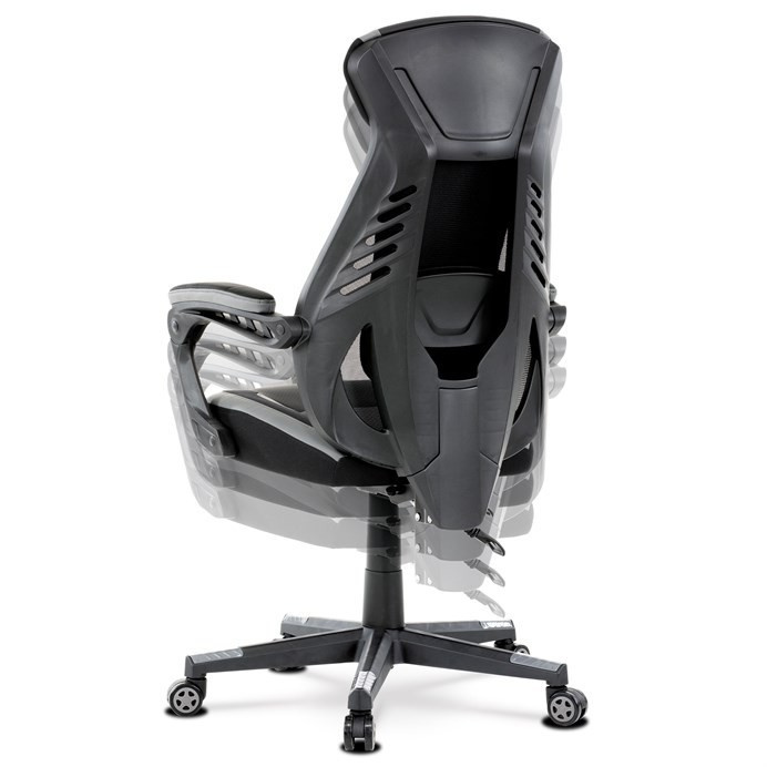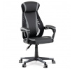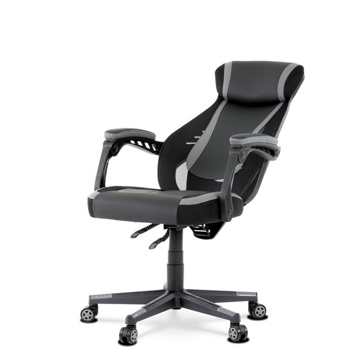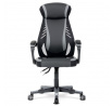 Luxusní herní a kancelářské křeslo z kolekce TOP racing. Jedná se o moderní designové křeslo, navržené nejen pro náročné požadavky PC hráčů, ale je uzpůsobené i pro standardní kancelářskou práci. To vše v maximálním pohodlí a při dokonalé ergonomii sezení. Potah je kombinací šedé a černé perforované ekokůže na sedáku i opěráku, černé síťoviny MESH a černé, jemně hrubé látky látky na sedáku i bocích opěrky hlavy. Opěrák je černý plastový výlisek ve futuristickém designu. Výplň sedáku i hlavové opěrky je z velmi kvalitní a tuhé PU pěny, vyztužení a pružnost zajišťují látkové popruhy. Křeslo je vybaveno houpacím mechanismem s plynulou aretací. Při vypnutí je možné se s opěradlem volně pohupovat. Výška sezení se upravuje jednou páčkou na pravé straně přes kvalitní plynový píst. Poloha opěráku se nastavuje druhou páčkou, umístěnou rovněž na pravé straně křesla. Masivní černý plastový kříž s šedýmii protiskluzovými plastovými doplňky je osazen černými plastovými kolečky pr. 6 cm s šedým racing středem a gumovým obvodem ideálními na tvrdé podlahy. Se stabilitou celých 70 cm průměru kříže si můžete dovolit i ty nejnáročnější hry. Vysoký, prodyšný a ergonomicky navržený opěrák s integrovanou zesílenou opěrkou hlavy, polstrovanou a výškově nastavitelnou bederní opěrkou slouží nejen jako výborná opora celých zad a také podporuje správné držení páteře. Područky jsou plastové, polstrované a potažené modrou a černou ekokůží. Šíře je 7 cm, délka ložné plochy 33 cm a výška 3 cm. Při sklápění sedáku se pohybují a kopírují jeho pohyb a polohu. Nosnost židle je až 130 kg.