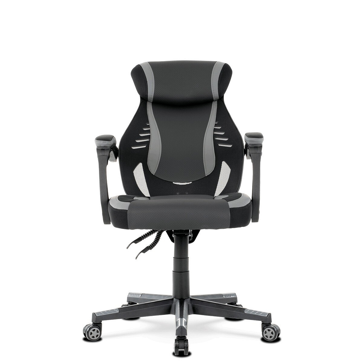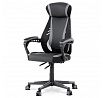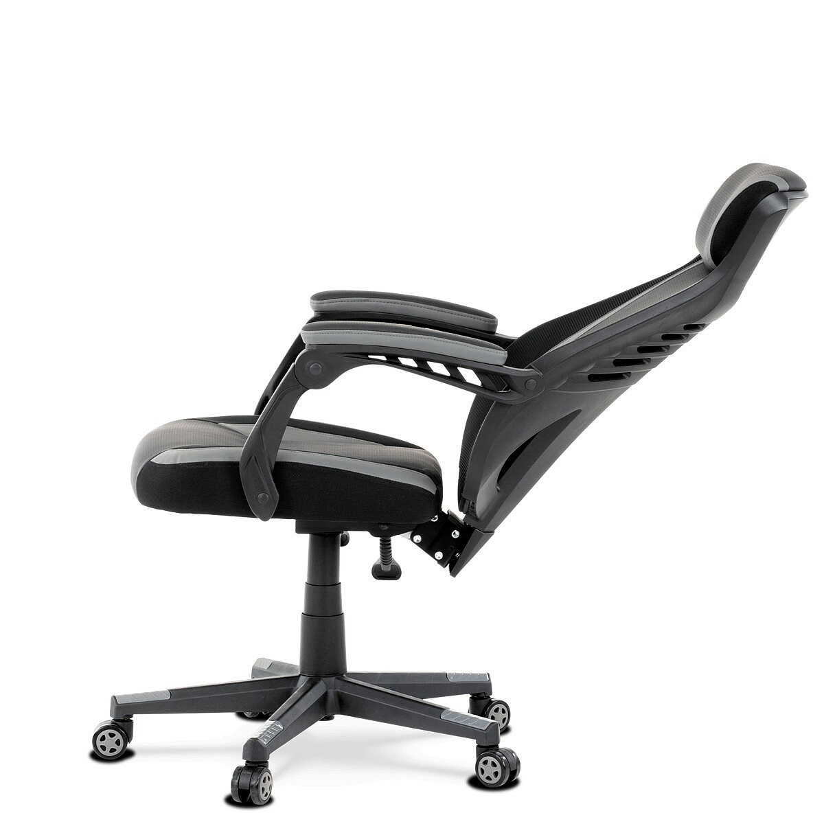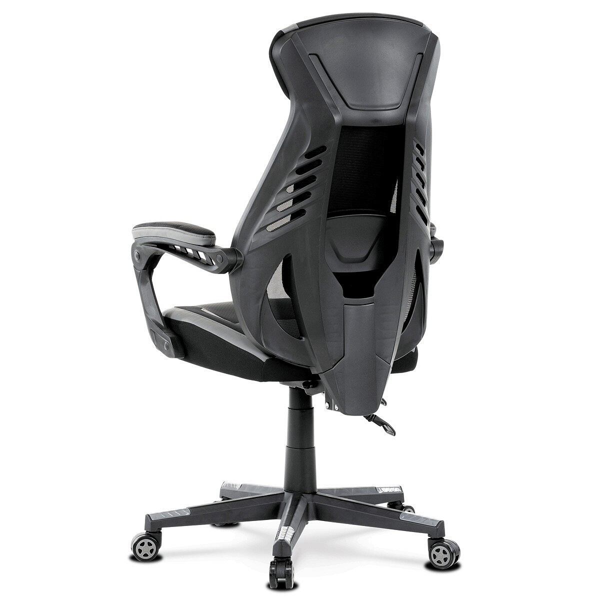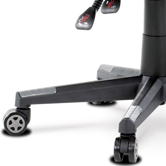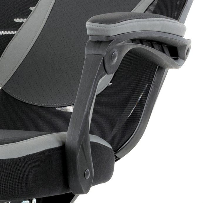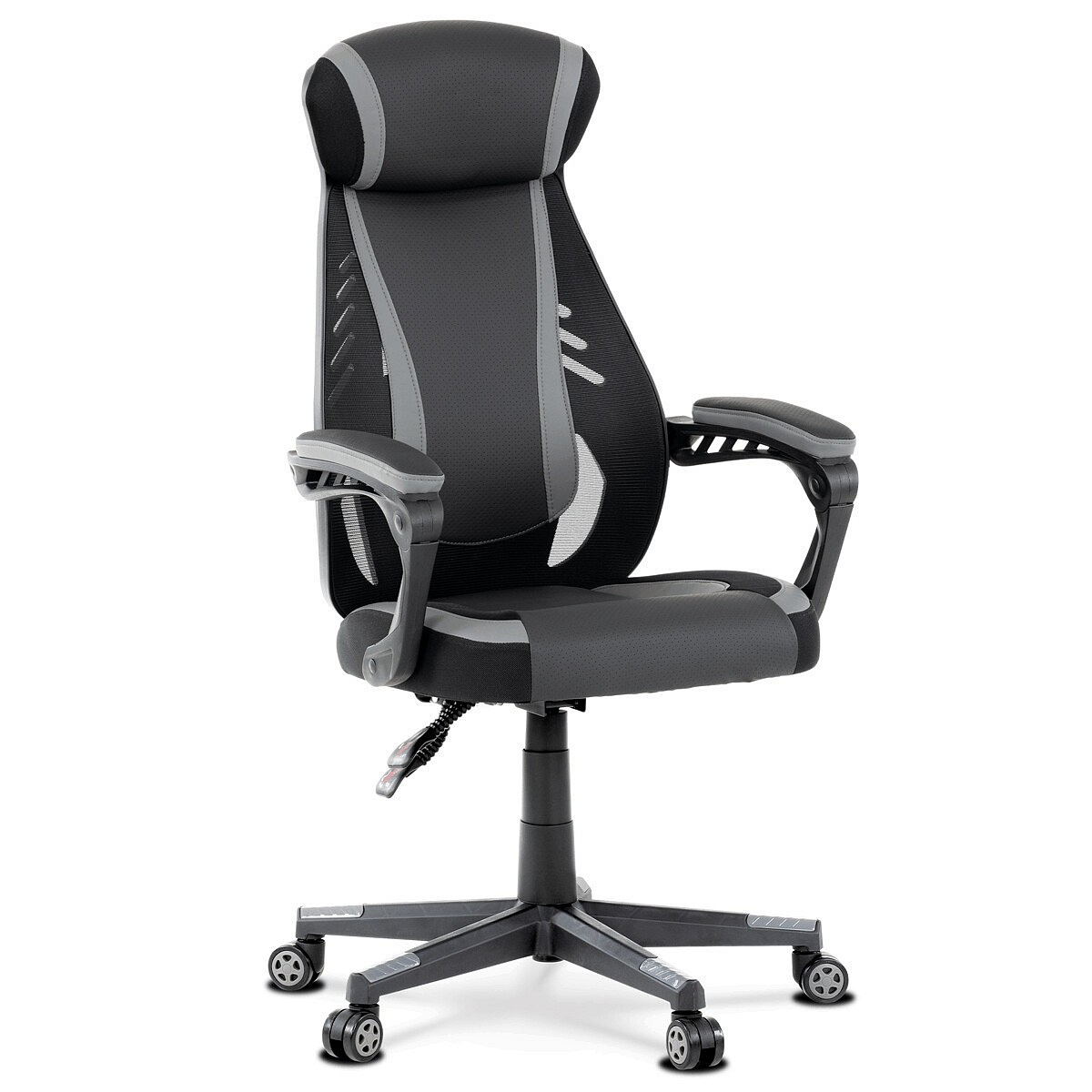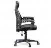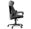 Luxusní herní a kancelářské křeslo z kolekce TOP racing. Jedná se o moderní designové křeslo, navržené nejen pro náročné požadavky PC hráčů, ale je uzpůsobené i pro standardní kancelářskou práci. To vše v maximálním pohodlí a při dokonalé ergonomii sezení. Potah je kombinací šedé a černé perforované ekokůže na sedáku i opěráku, černé síťoviny MESH a černé, jemně hrubé látky látky na sedáku i bocích opěrky hlavy. Opěrák je černý plastový výlisek ve futuristickém designu. Výplň sedáku i hlavové opěrky je z velmi kvalitní a tuhé PU pěny, vyztužení a pružnost zajišťují látkové popruhy. Křeslo je vybaveno houpacím mechanismem s plynulou aretací. Při vypnutí je možné se s opěradlem volně pohupovat. Výška sezení se upravuje jednou páčkou na pravé straně přes kvalitní plynový píst. Poloha opěráku se nastavuje druhou páčkou, umístěnou rovněž na pravé straně křesla. Masivní černý plastový kříž s šedýmii protiskluzovými plastovými doplňky je osazen černými plastovými kolečky pr. 6 cm s šedým racing středem a gumovým obvodem ideálními na tvrdé podlahy. Se stabilitou celých 70 cm průměru kříže si můžete dovolit i ty nejnáročnější hry. Vysoký, prodyšný a ergonomicky navržený opěrák s integrovanou zesílenou opěrkou hlavy, polstrovanou a výškově nastavitelnou bederní opěrkou slouží nejen jako výborná opora celých zad a také podporuje správné držení páteře. Područky jsou plastové, polstrované a potažené modrou a černou ekokůží. Šíře je 7 cm, délka ložné plochy 33 cm a výška 3 cm. Při sklápění sedáku se pohybují a kopírují jeho pohyb a polohu. Nosnost židle je až 130 kg.