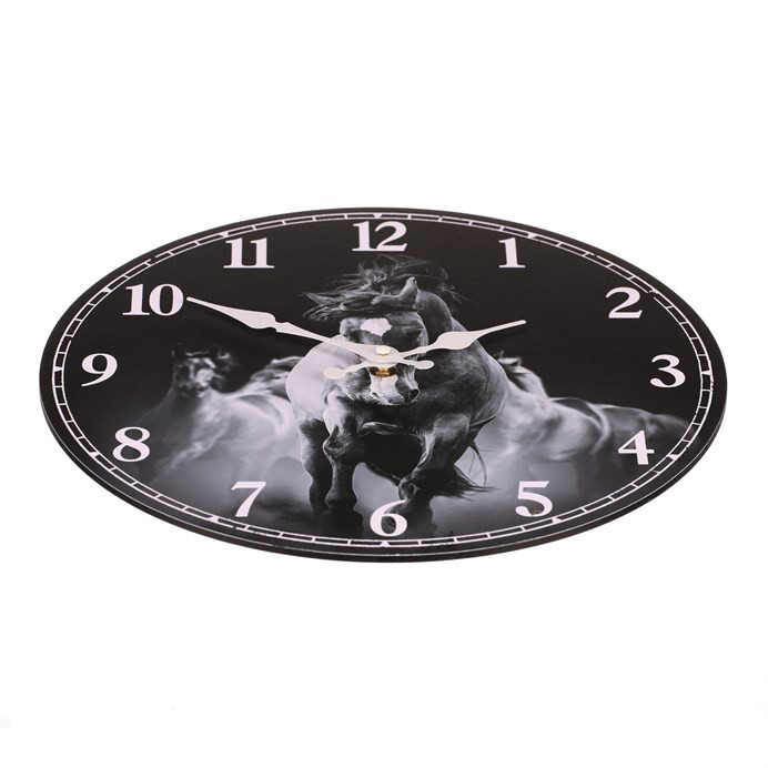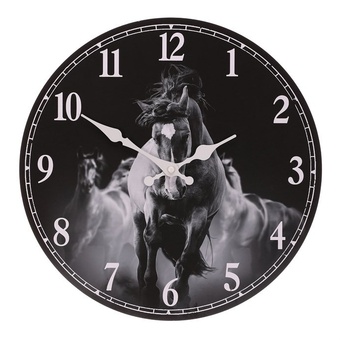 Hodiny nástěnné - pr. 34 cm, MDF, černo-bílé, motiv koní