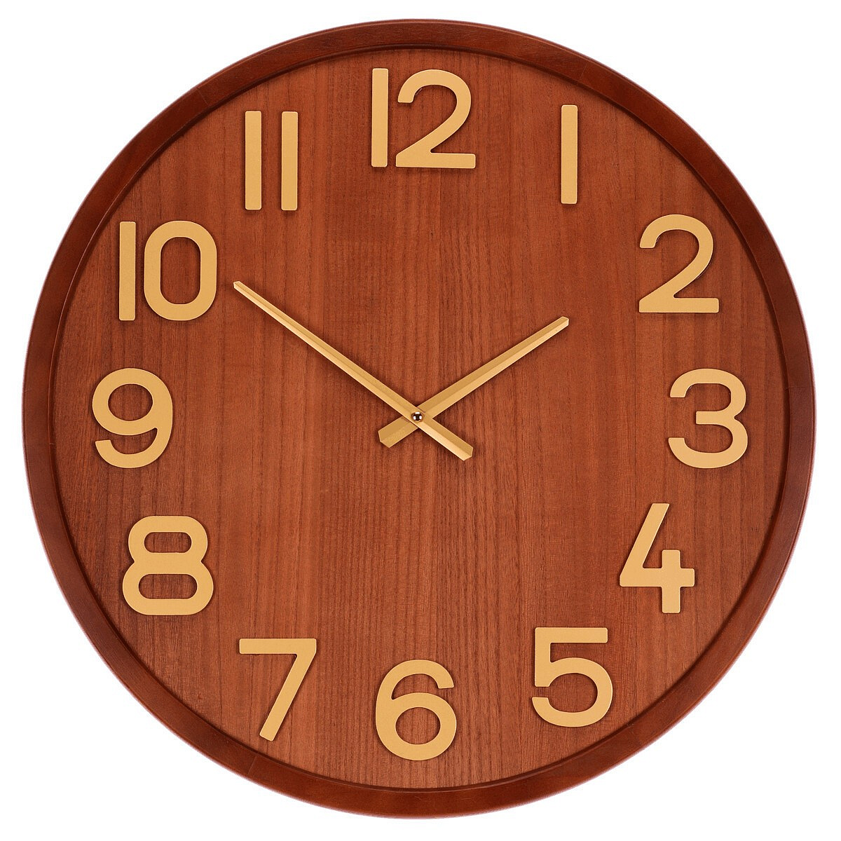 Nástěnné hodiny o průměru 60 cm kombinují dřevěný rám s MDF deskou v imitaci dýhy, která dodává celku přírodní a teplý vzhled. Číselník je doplněn výraznými číslicemi a ručičkami v kontrastní barvě, což zajišťuje dobrou čitelnost času i z větší vzdálenosti. Precizní provedení povrchu s jemnou strukturou dřeva podtrhuje klasický design vhodný do různých interiérů. Hodiny jsou lehké a snadno se zavěšují na zeď, čímž nabízejí praktické řešení pro domácnosti i kanceláře. Tichý chod mechanismu minimalizuje rušivé zvuky během provozu.